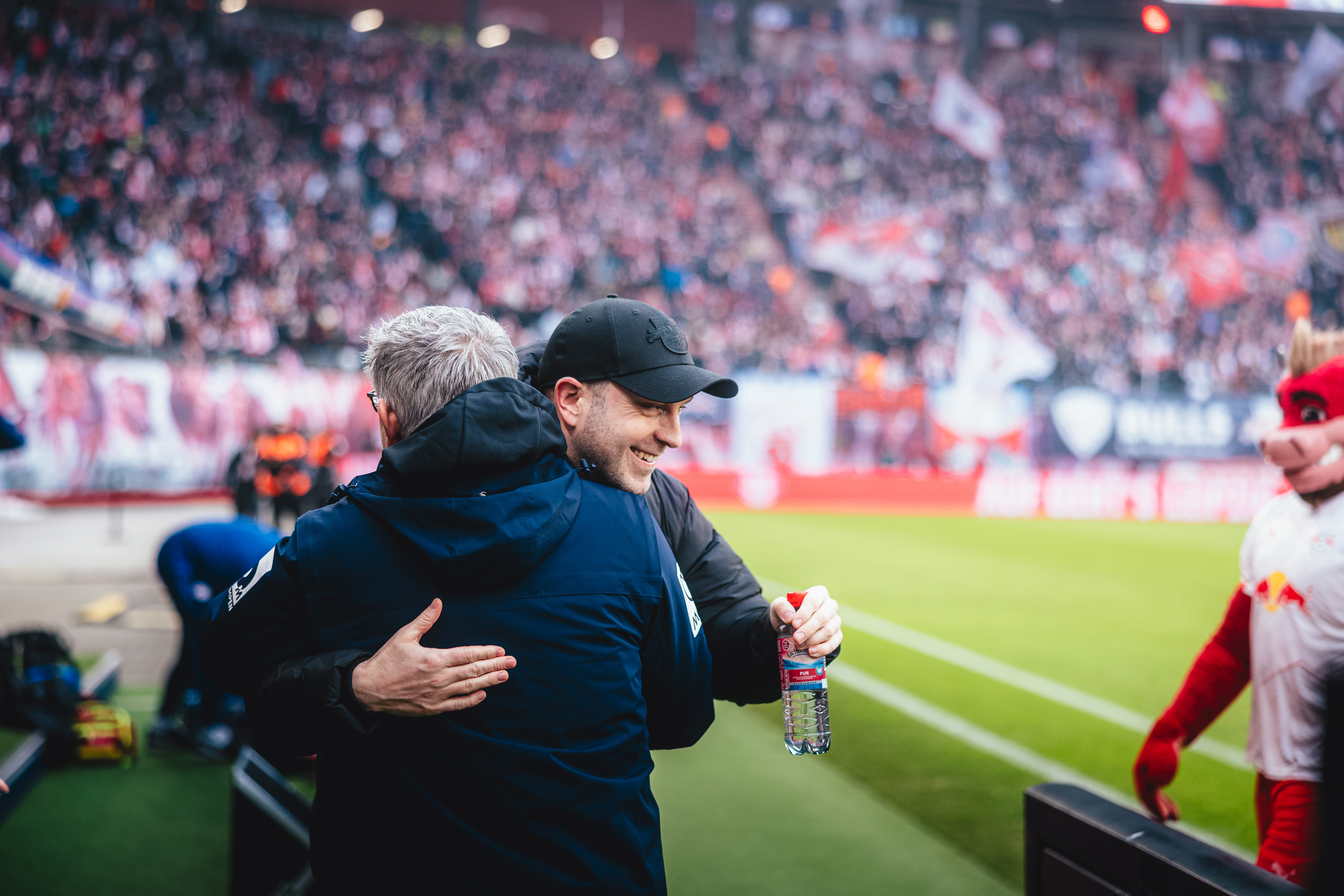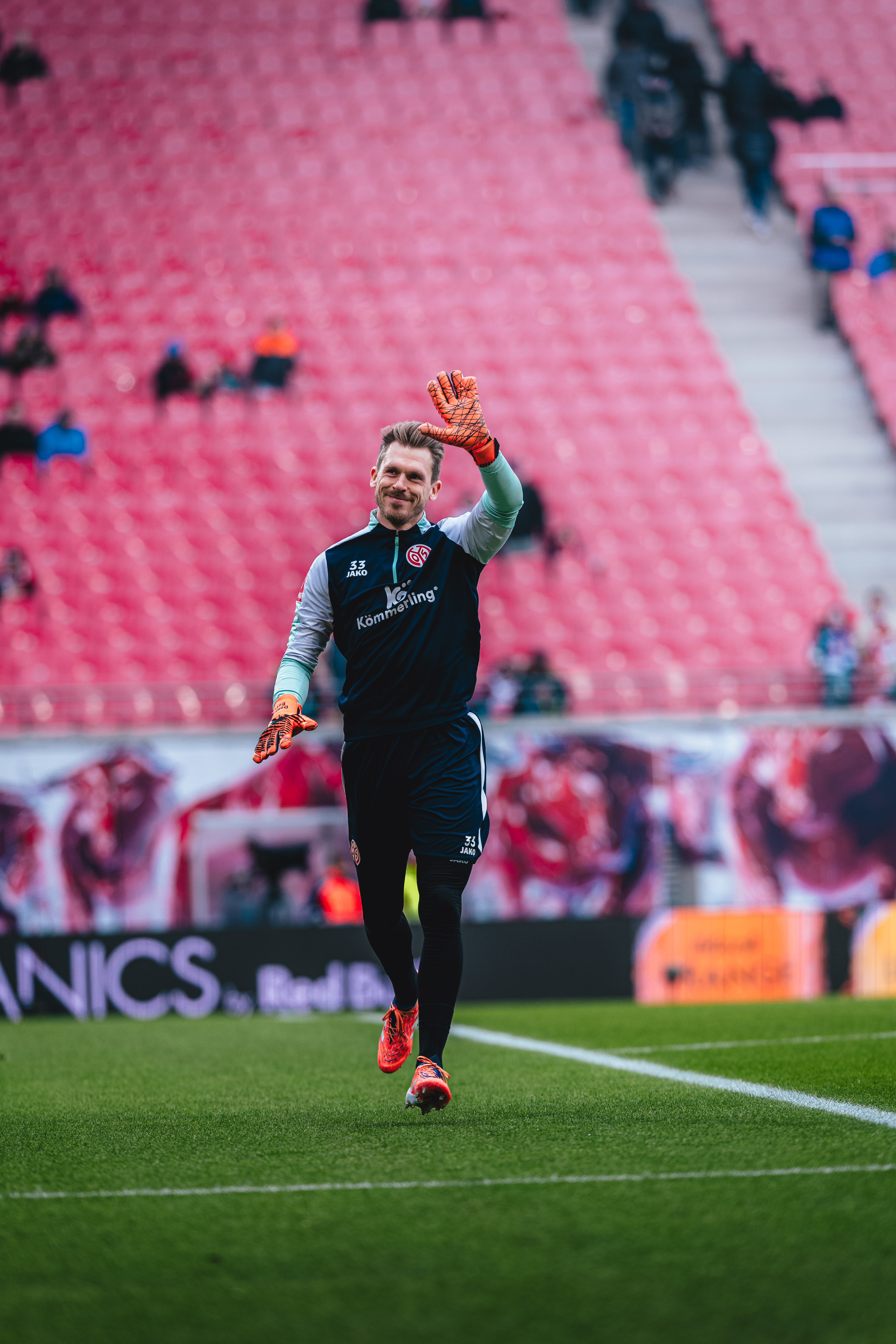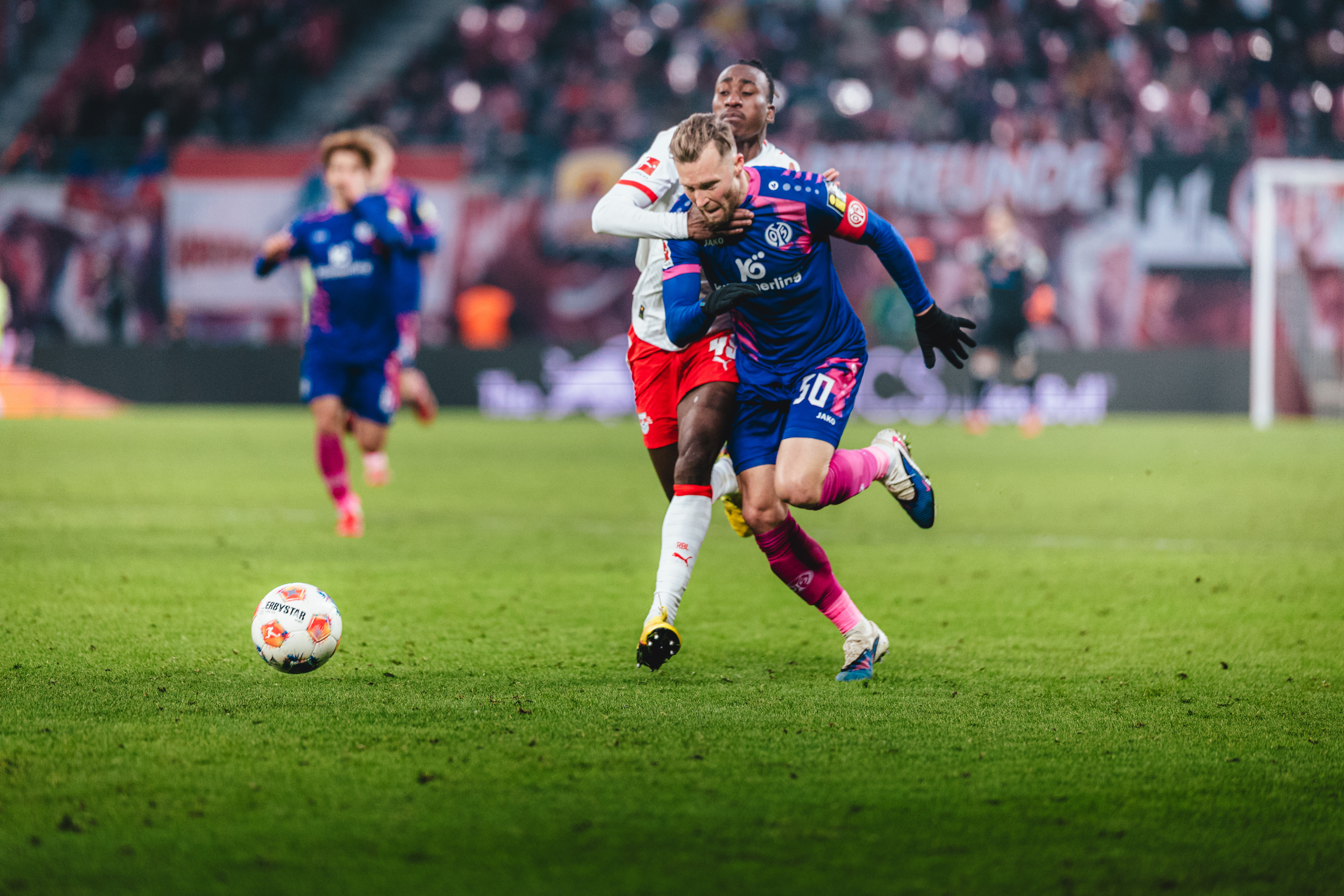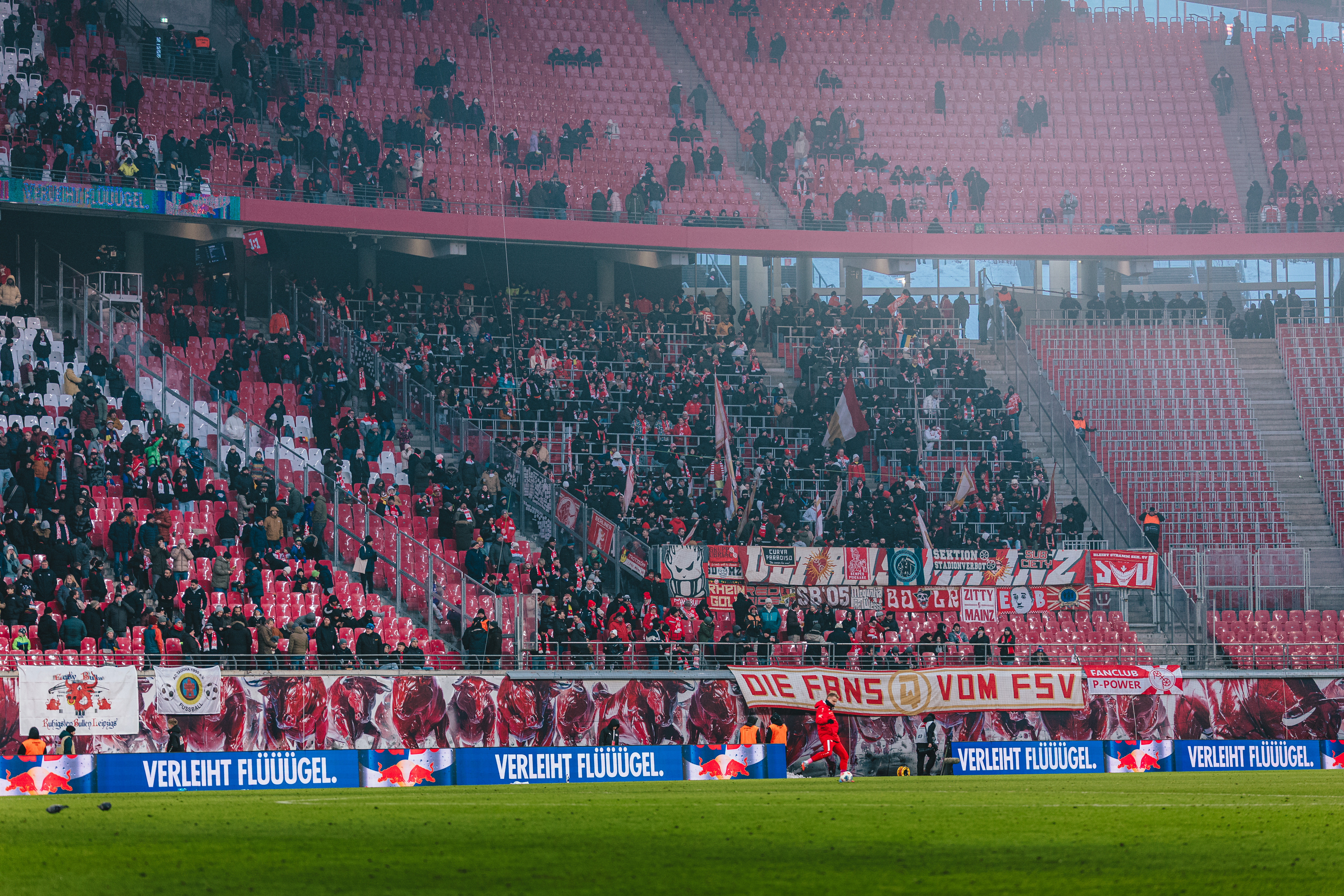 Es war der Startschuss der Leipziger Druckphase, die das hohe Tempo von Nusa und Diamondé immer öfter einsetzten. Potulski bekam gegen Harder, der frei vor Batz aufgetaucht wäre, gerade noch so das Bein an den Ball (71.). Die gefährlichen Situationen rund um den Mainzer Strafraum häuften sich. Fischer reagierte und brachte für die letzten zwanzig Minuten Lennard Maloney für Amiri. RB probierte viel, doch die 05ER zeigten ihre wiedergewonnene Stabilität. Zunächst war Batz gegen Ezechiel Banzuzi auf dem Posten, dann zeigte sich sein Gegenüber Gulacsi gegen Kaishu Sano reaktionsstark (73.). Mit Paul Nebel, Nelson Weiper und Phillipp Mwene kamen für die letzten zehn Minuten für Tietz, Widmer und Torschütze Silas nochmal drei frische Kräfte in die Partie, die der FSV nun im 5-4-1-System bestritt. Leipzig versuchte alles, die Rheinhessen mussten jede Menge Lauf- und Zweikampfarbeit in der eigenen Hälfte verrichten und taten dies mit viel Leidenschaft, Geschick und der nötigen Portion Glück. So, wie in der 88. Minute, als Willi Orban eine unfreiwillige Vorlage von Mwene nicht verwerten konnte. Fünf Minuten Nachspielzeit lagen noch zwischen dem wichtigen Auswärtssieg und dem FSV. Doch auch die wurden schadlos überstanden. Die 05ER konnten die drei Punkte mit ihren mitgereisten Fans lautstark bejubeln.