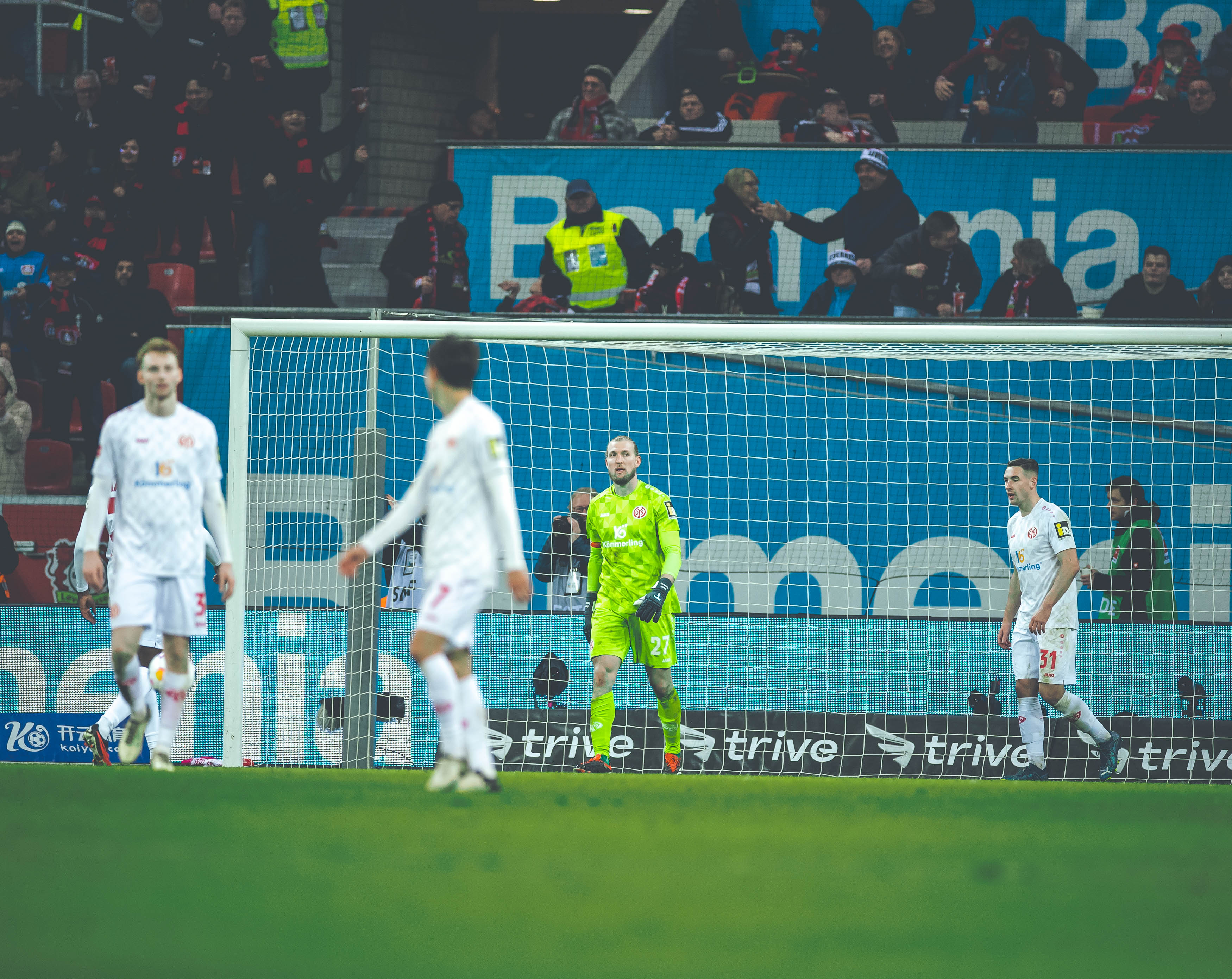Und dennoch stand in der 68. Spielminute das 2:1 für Leverkusen auf der Anzeigetafel der ausverkauften BayArena. Einen flatternden, aber eigentlich ungefährlichen, zentral platzierten Weitschuss von Andrich aus rund 20 Metern ließ Zentner unglücklich durch die Hände flutschen und bekam den Ball nicht mehr vor der Linie zu packen. Ein bitterer Moment für den FSV in einer bis dato starken zweiten Halbzeit, deren Verlauf weiter frustrierend blieb. Nach einer Attacke des erst kurz zuvor eingewechselten Jessic Ngankam an der Außenlinie gegen Xhaka zeigte Schiedsrichter Timo Gerach nach berechtigter Intervention des Videoassistenten glatt Rot (80.). Trotz aller Nackenschläge steckte die Henriksen-Elf keineswegs auf, sondern suchte auch in Unterzahl den Weg nach vorne. Der eingewechselte Tom Krauß zögerte mit seinem Abschluss nach Vorarbeit von Lee jedoch zu lange und auch der Südkoreaner zielte in der Nachspielzeit zu hoch. Es blieb beim bitteren 1:2 aus 05-Sicht, die nach 23 Spieltagen weiterhin 15 Punkte auf der Habenseite haben.