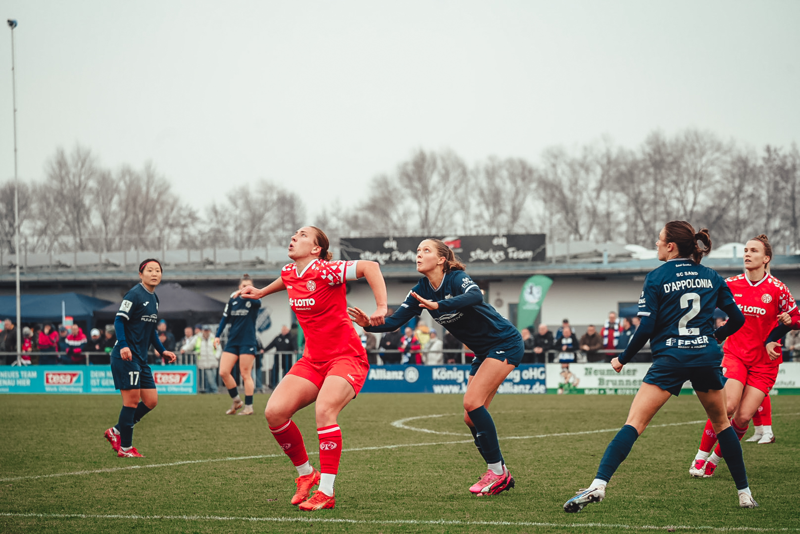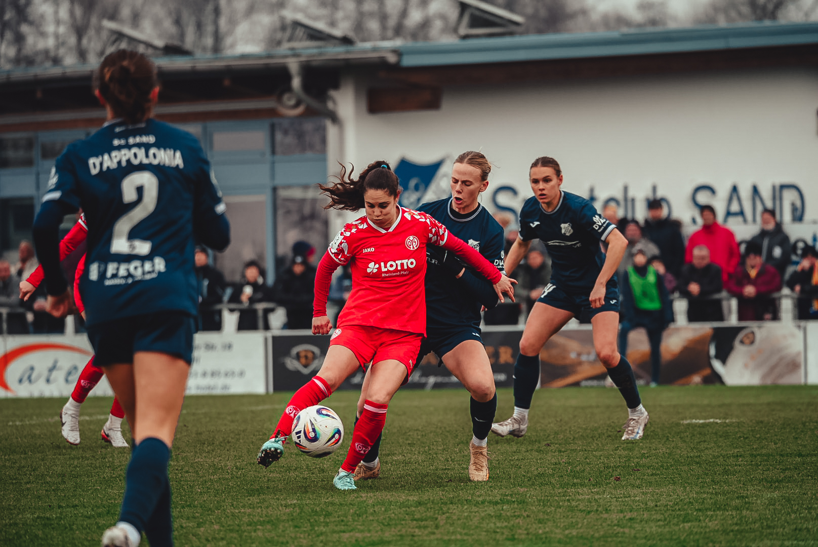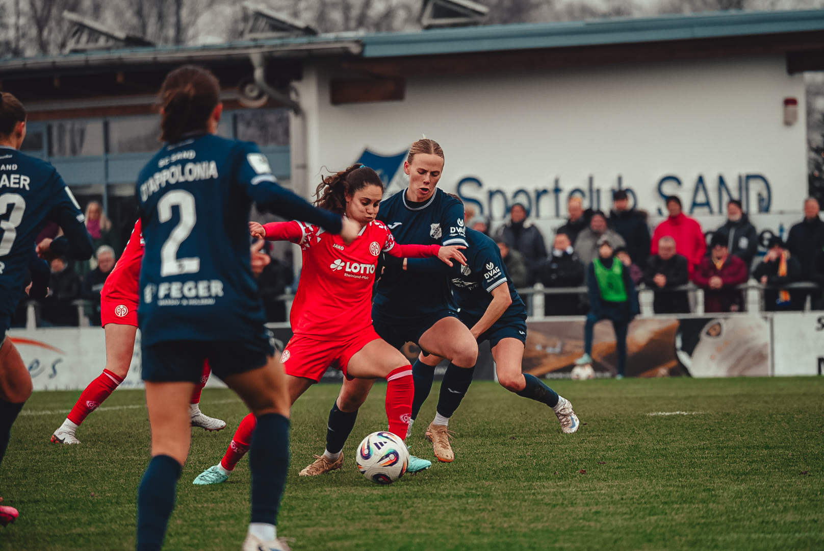Die Siegesserie der Mainzer Frauen reißt im Rückrunden-Auftakt und letzten Spiel des Jahres durch eine 0:2-Niederlage beim SC Sand. Trotz des mutigen Auftretens des FSV war es in der 25. Spielminute Ivana Slipcevic, die einen sehenswerten Eckstoß direkt im Tor der Gäste unterbrachte und damit auf 1:0 für die Gastgeberinnen stellte. Die Rot-Weißen zeigten sich dennoch über weite Strecken der Partie als die aktivere sowie spielbestimmende Mannschaft und kreierten auch mittels Standardsituationen einige vielversprechende Torchancen, die an diesem Tag allerdings nicht in Treffer umgemünzt werden konnten. Stattdessen agierte Sand überaus effizient und traf mitten in einer starken Phase der Rheinhessinnen erneut per Eckstoß zum 2:0 - dieses Mal durch Kim Schneider, die per Kopf für den SCS erhöhte (75.). Die 05-Frauen arbeiteten auch nach dem zweiten Gegentor unermüdlich daran, noch einmal in die Partie zurückzufinden - diese Bemühungen blieben allerdings erfolglos, weshalb der FSV das Jahr 2025 nach wie vor mit 26 Punkten auf dem vierten Tabellenplatz in der 2. Frauen-Bundesliga beendet.