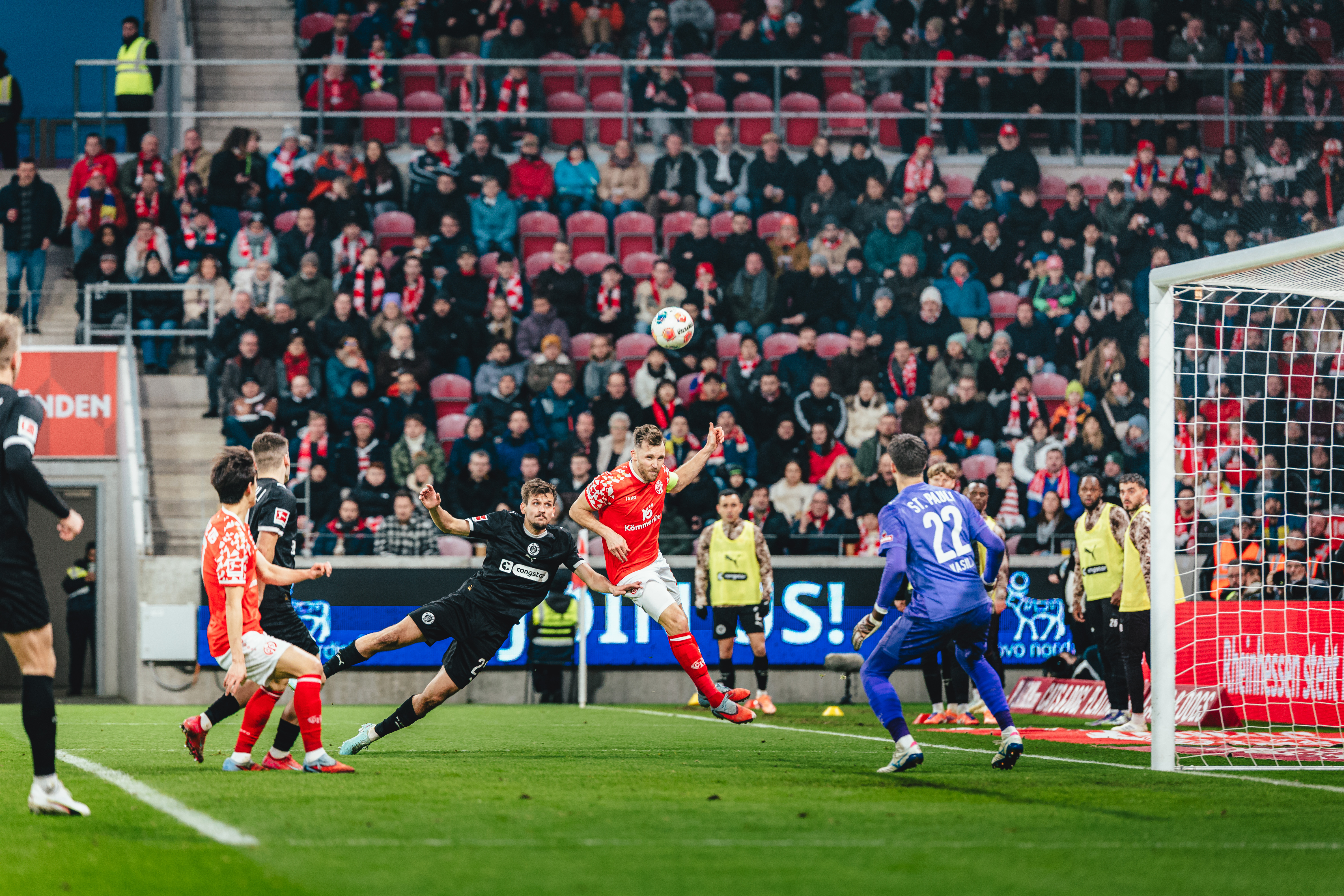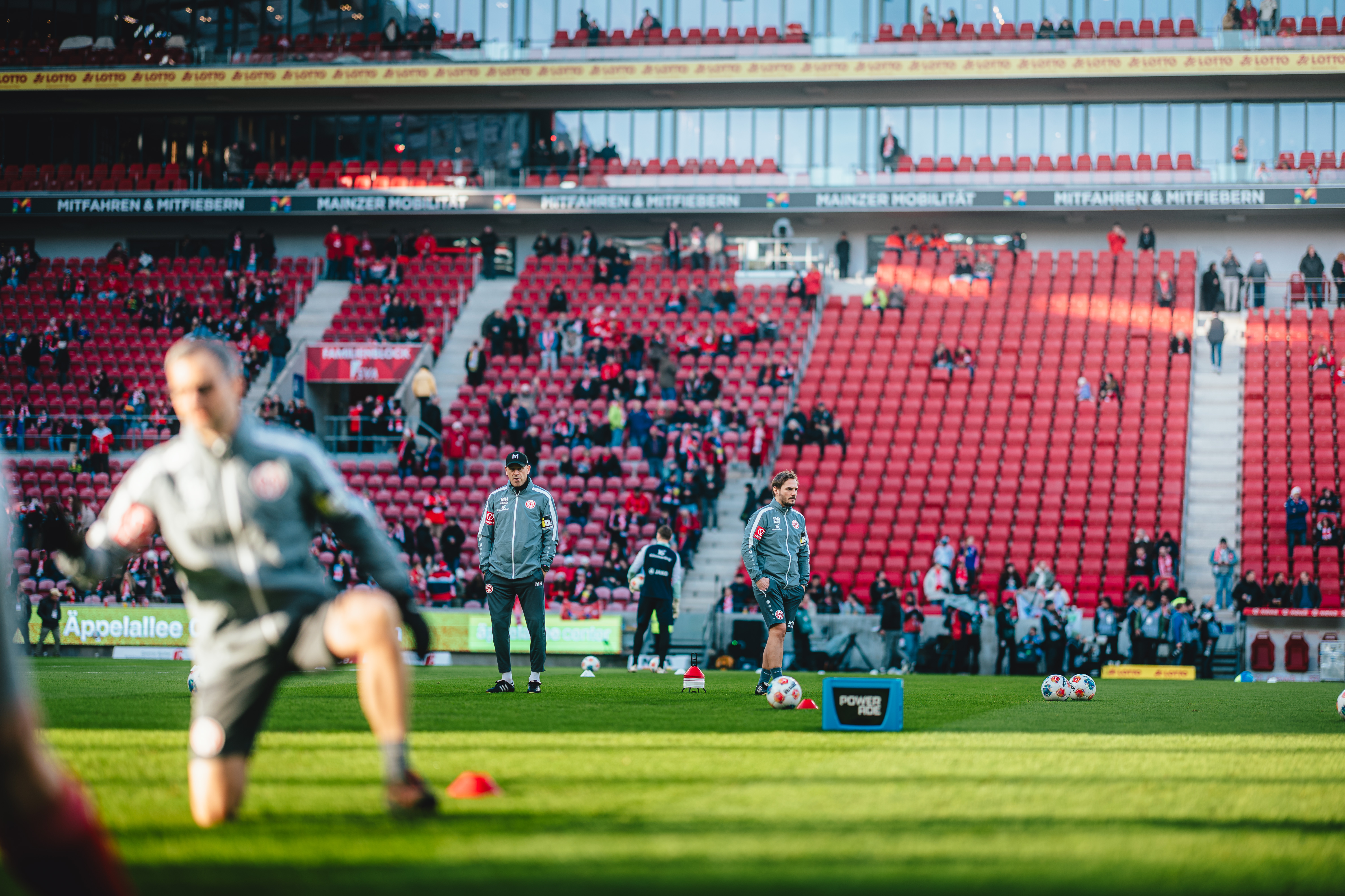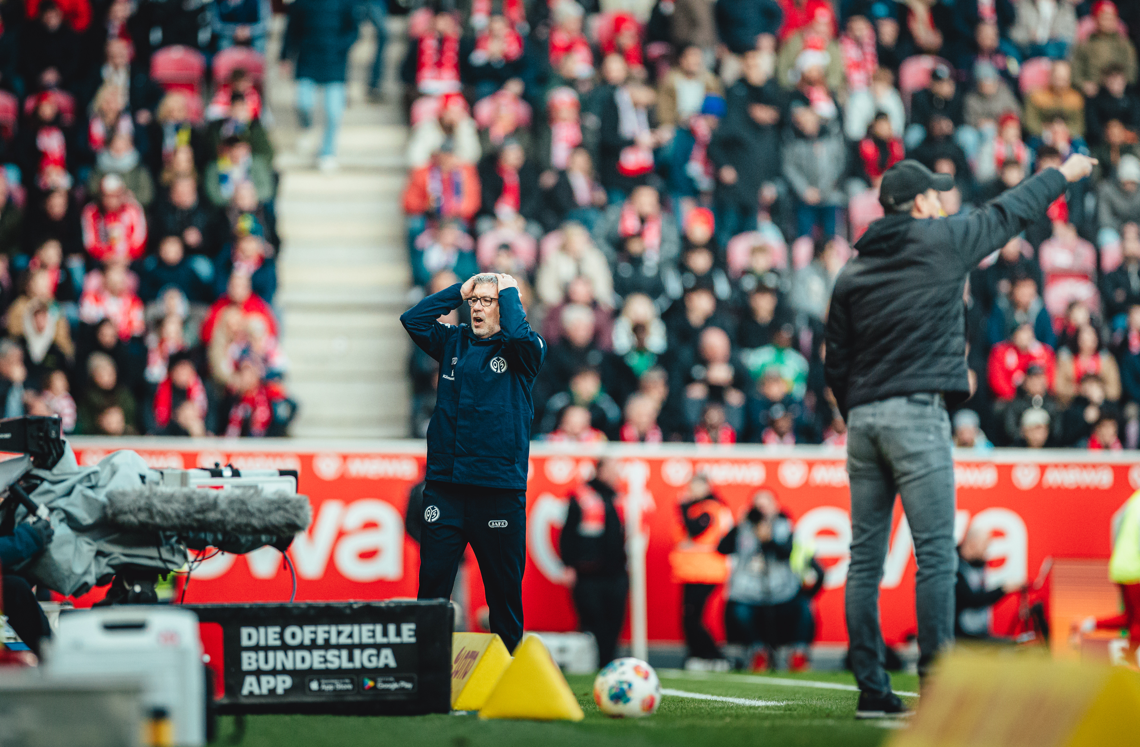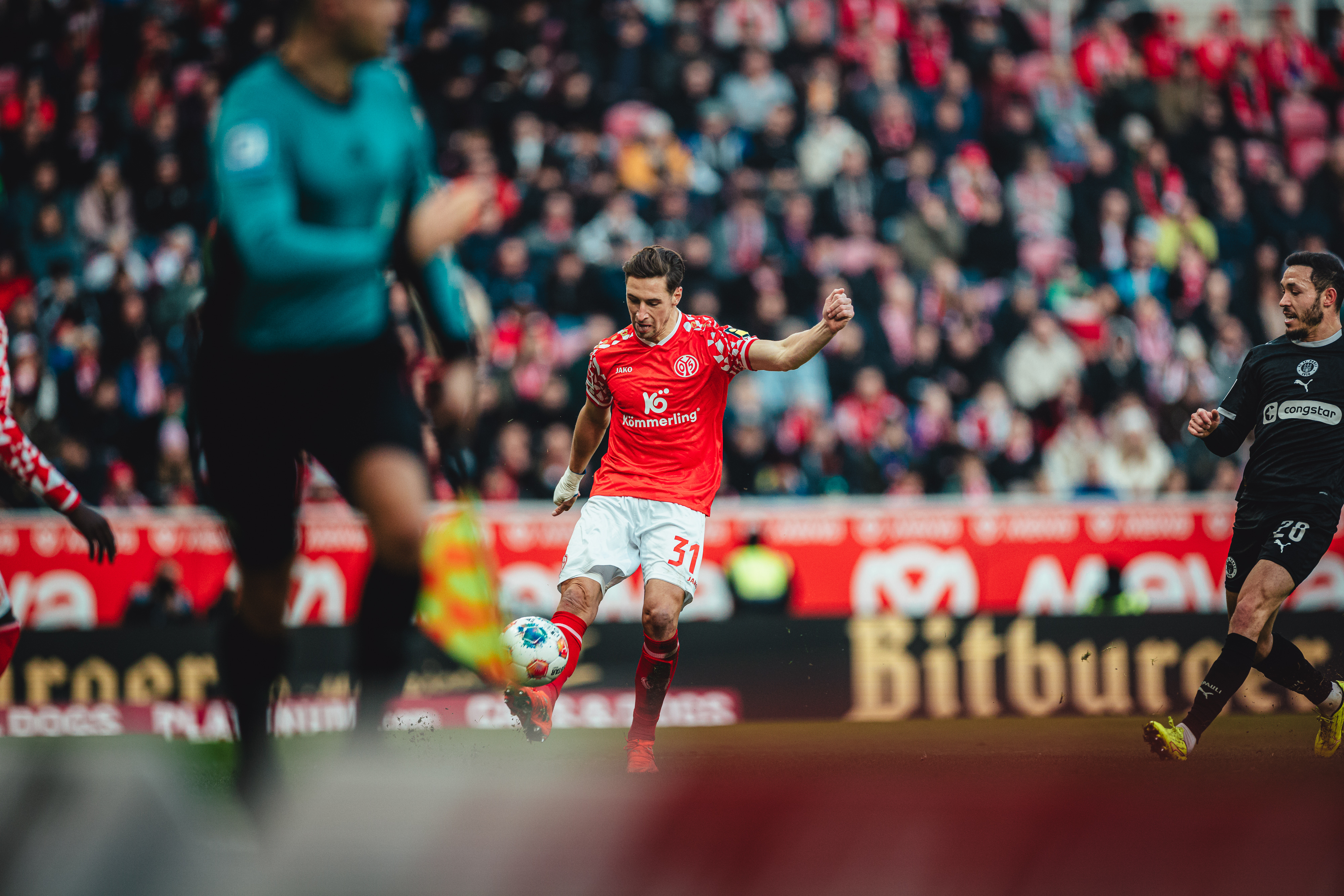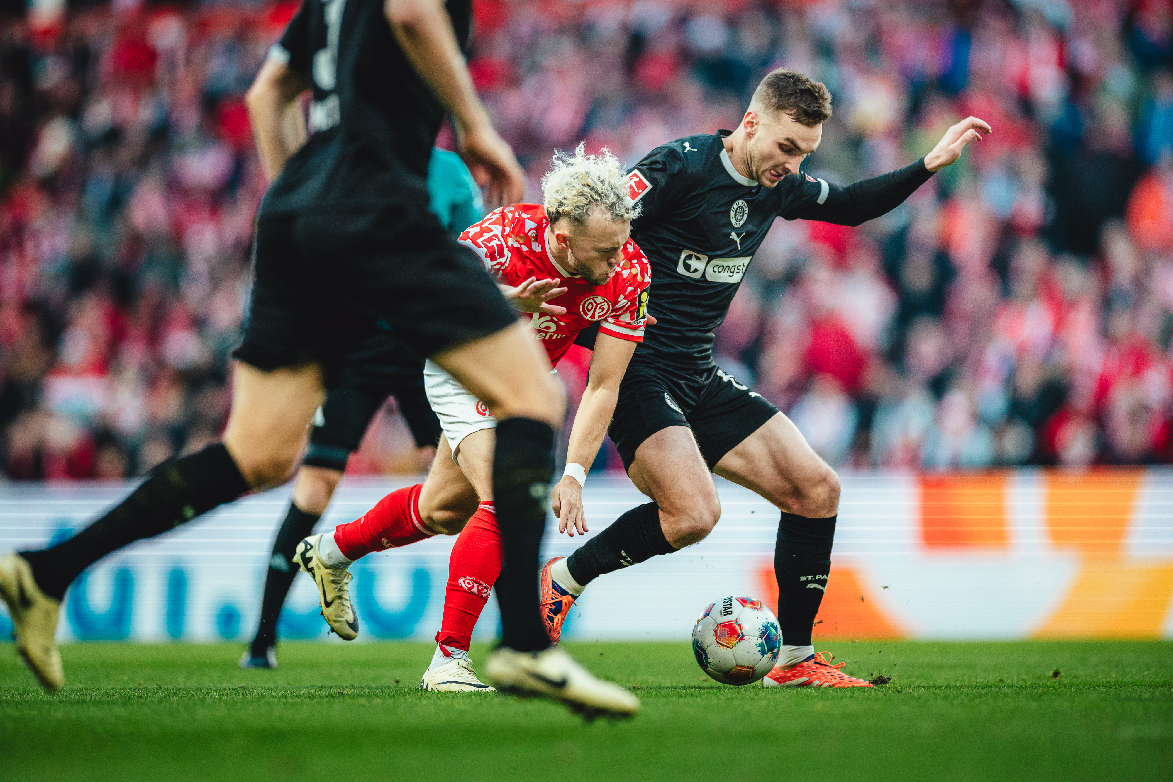 Die Zuschauerinnen und Zuschauer in der MEWA ARENA bekamen Abstiegskampf pur zu sehen. Beide Teams rieben sich in vielen Zweikämpfen auf dem Boden und in der Luft überwiegend zwischen beiden Strafräumen auf. Abschlüsse auf das Tor konnte nach einer halben Stunde keine der beiden Mannschaften verzeichnen. Auch bei Nebels Möglichkeit nach Flanke von Kapitän Silvan Widmer, Amiris Schussversuch nach sehenswertem Dribbling und dem Abschluss von Jae-sung Lee war jeweils ein Abwehrbein der Paulianer dazwischen (28./31./33.). Die seltenen Angriffsversuche der Gäste aus dem Norden hatte der FSV gut im Griff. Es benötigte einen Mainzer Fehler in der Defensive für die zweite Chance. Jackson Irvine hatte zwölf Meter vor dem 05-Tor auf einmal freie Schussbahn. Batz war jedoch schnell unten und entschärfte den ersten Schuss auf das Tor im gesamten Spiel ohne Probleme (36.). Bis zum Pausenpfiff passierte auf beiden Seiten nichts Nennenswertes mehr. Das torlose Unentschieden zur Pause war das gerechte Ergebnis in einer ebenso umkämpften wie ereignisarmen Partie.
