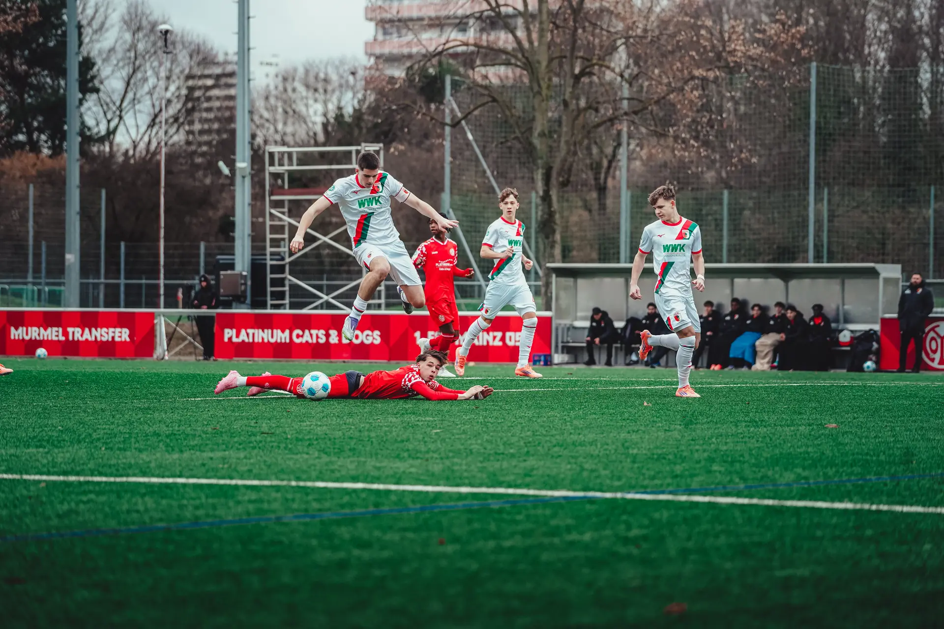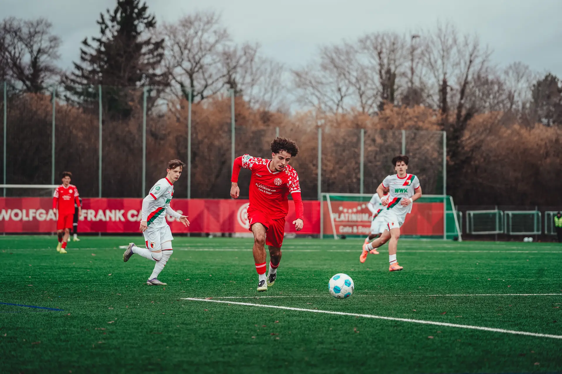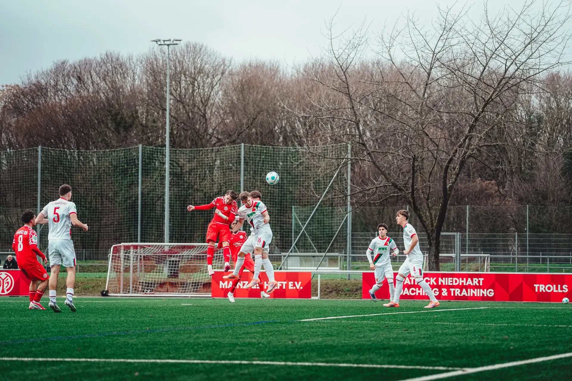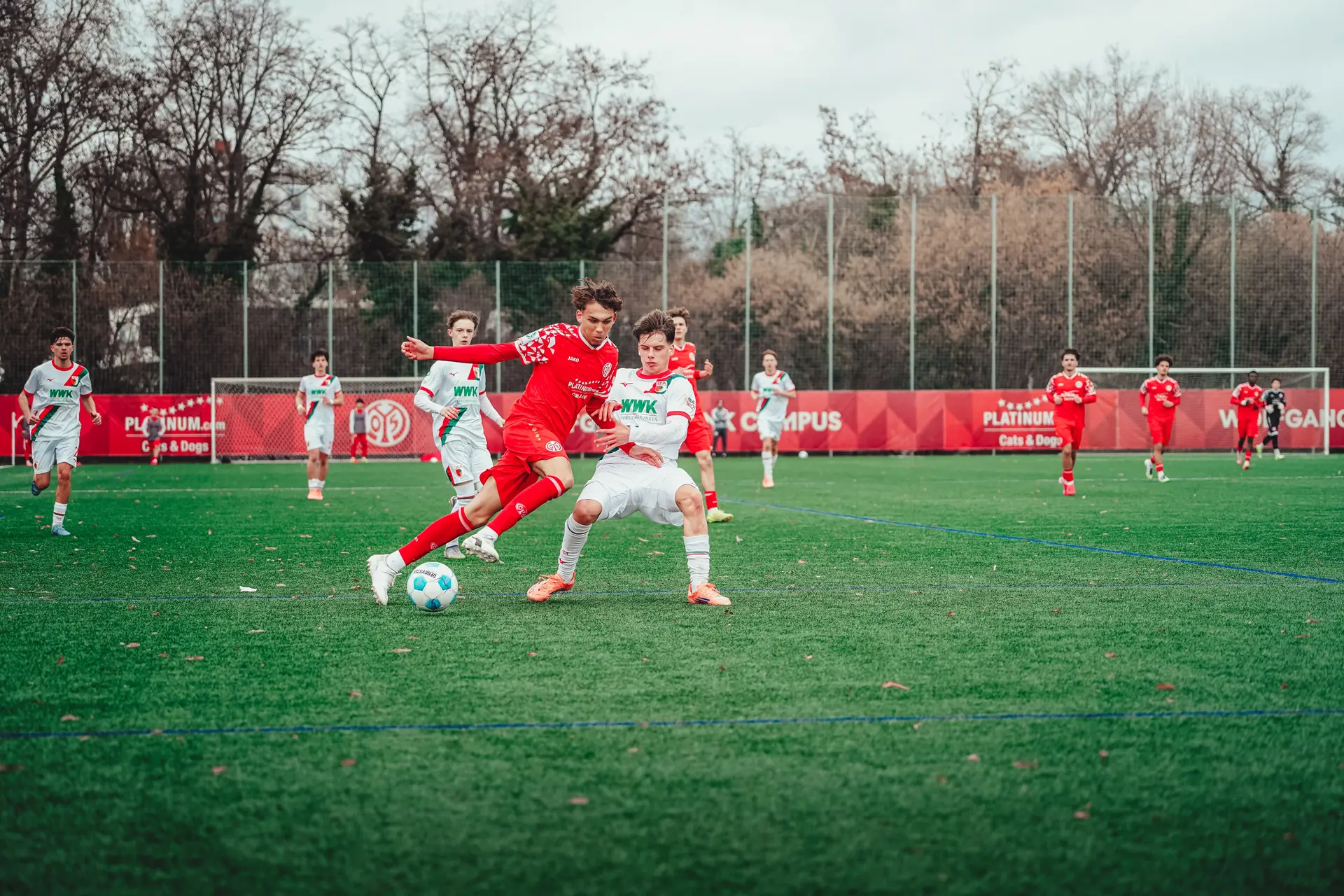 In einer intensiven Partie gegen den FC Augsburg verfügte die Mainzer U17 über deutlich mehr Spielanteile, war im Abschluss allerdings nicht konsequent genug und unterlag den Fuggerstädtern am Ende mit 1:3. Nachdem Nikola Kalchev den FCA früh in Führung gebracht hatte, schlugen die Rheinhessen zurück und stellten durch Alessio Kersten auf 1:1 (27.). Die Antwort der Gäste folgte erneut durch Kalchev mit dem 1:2 (34.), doch die Rot-Weißen zeigten sich davon unbeeindruckt und hielten den Druck auf den FCA weiterhin hoch. Sämtliche Abschlüsse und Annäherungen erwiesen sich auch in der zweiten Halbzeit in letzter Instanz allerdings als zu ungenau, während die Augsburger in der Schlussphase eine der rar gesäten Chancen nutzten und in Person von Evan Waguia die Partie entschieden.