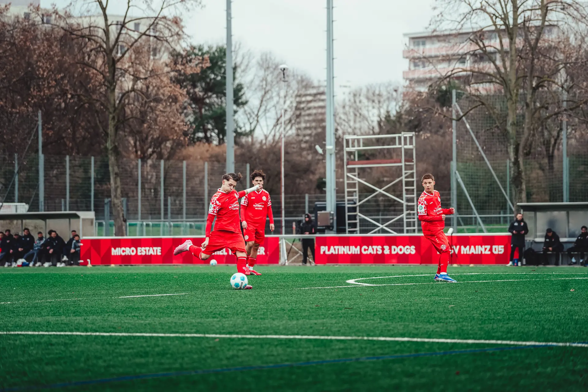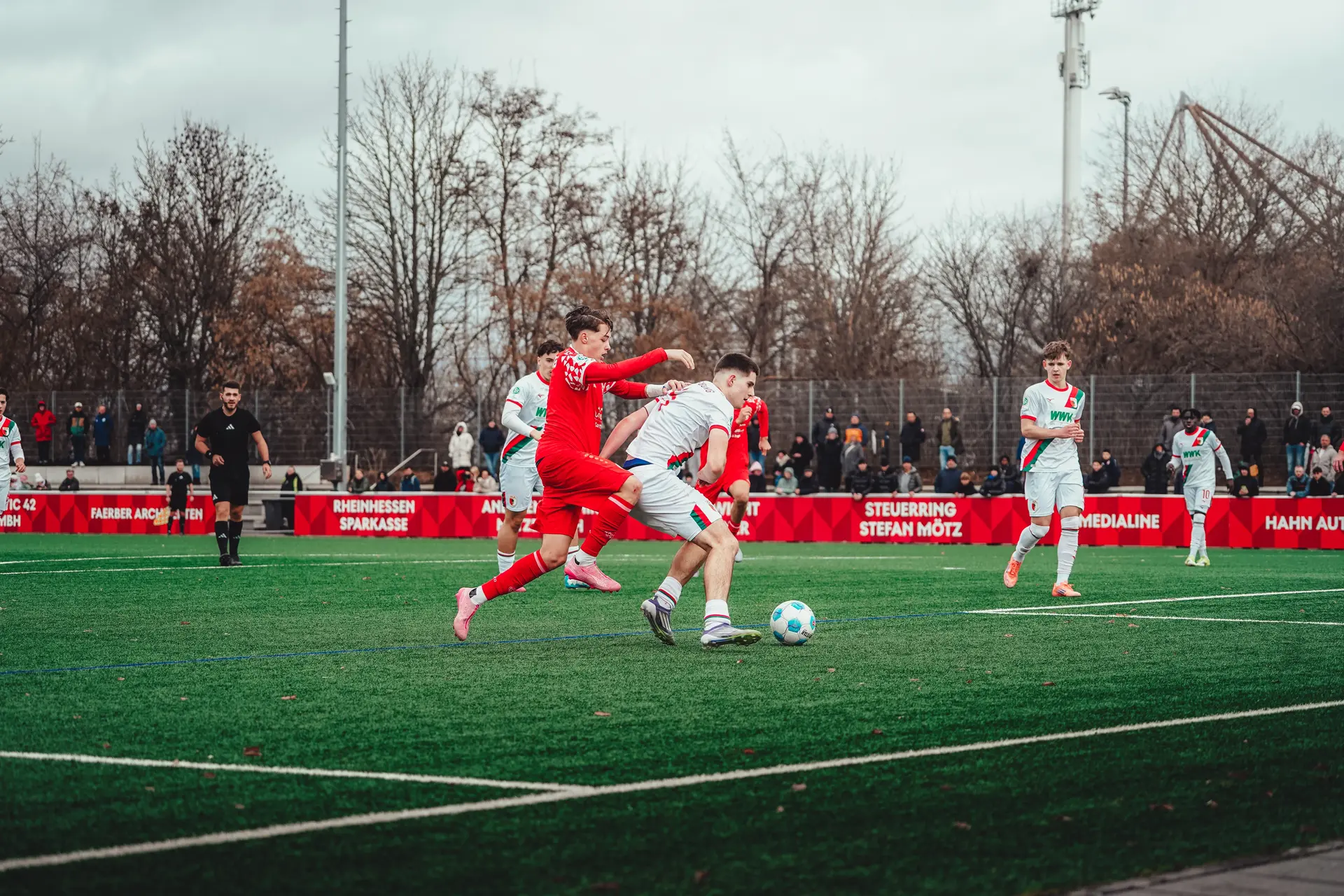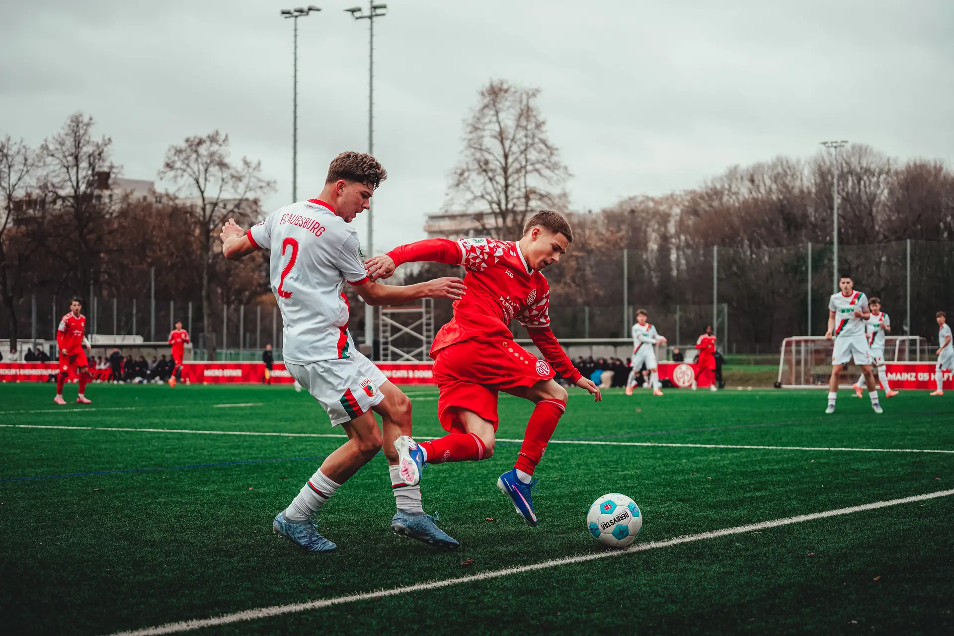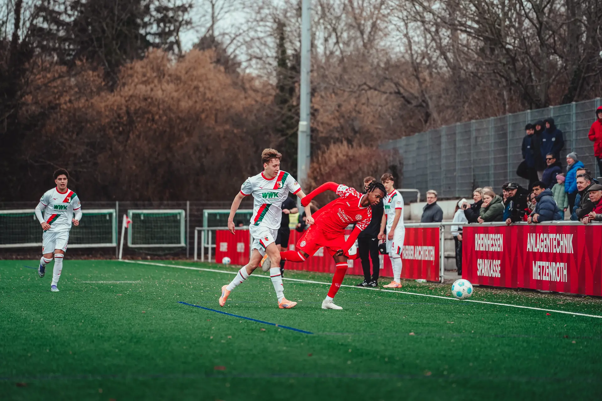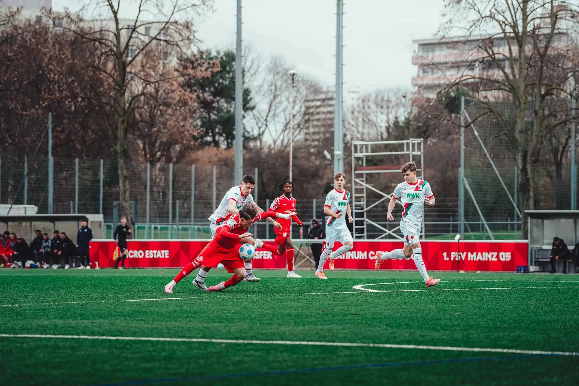 In einer intensiven Partie gegen den FC Augsburg verfügte die Mainzer U17 über deutlich mehr Spielanteile, war im Abschluss allerdings nicht konsequent genug und unterlag den Fuggerstädtern am Ende mit 1:3. Nachdem Nikola Kalchev den FCA früh in Führung gebracht hatte, schlugen die Rheinhessen zurück und stellten durch Alessio Kersten auf 1:1 (27.). Die Antwort der Gäste folgte erneut durch Kalchev mit dem 1:2 (34.), doch die Rot-Weißen zeigten sich davon unbeeindruckt und hielten den Druck auf den FCA weiterhin hoch. Sämtliche Abschlüsse und Annäherungen erwiesen sich auch in der zweiten Halbzeit in letzter Instanz allerdings als zu ungenau, während die Augsburger in der Schlussphase eine der rar gesäten Chancen nutzten und in Person von Evan Waguia die Partie entschieden.