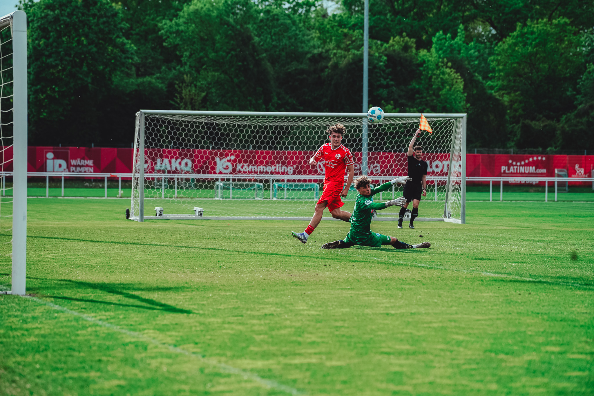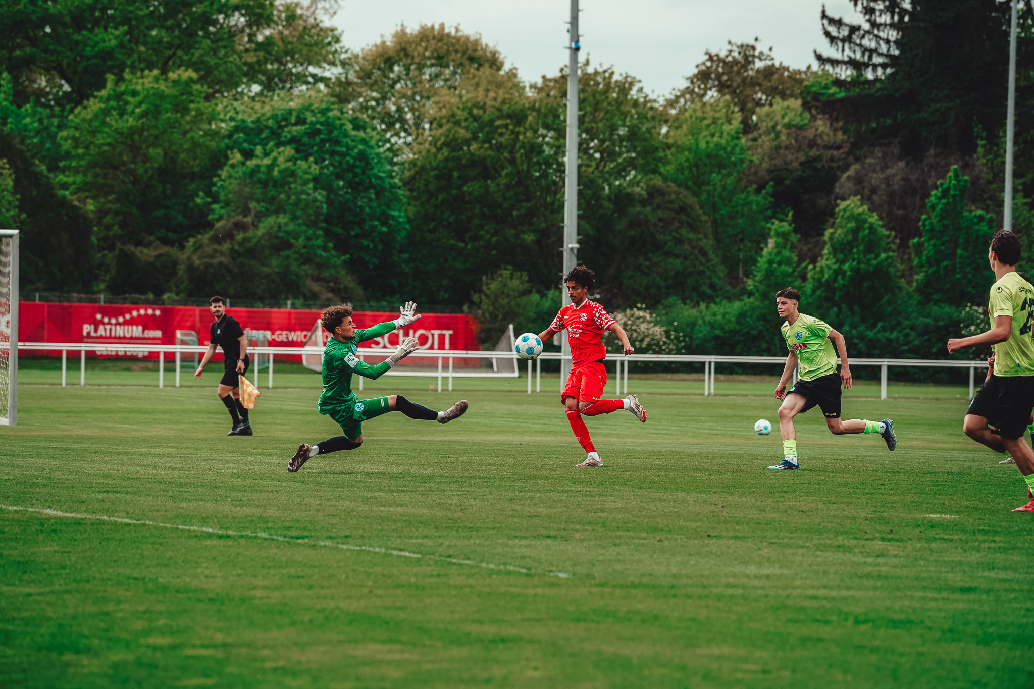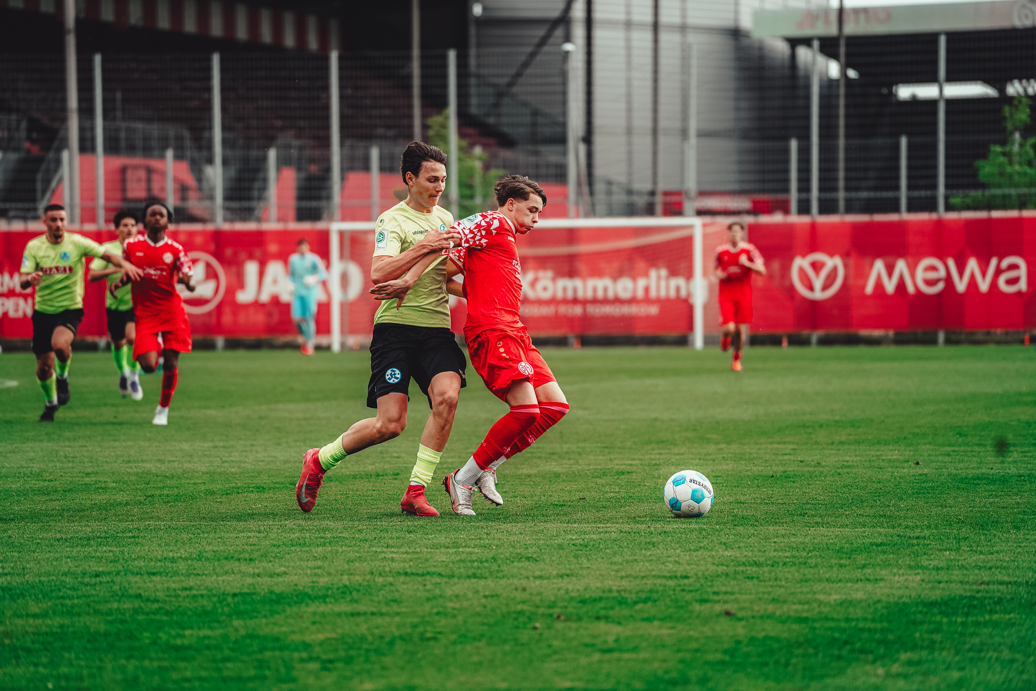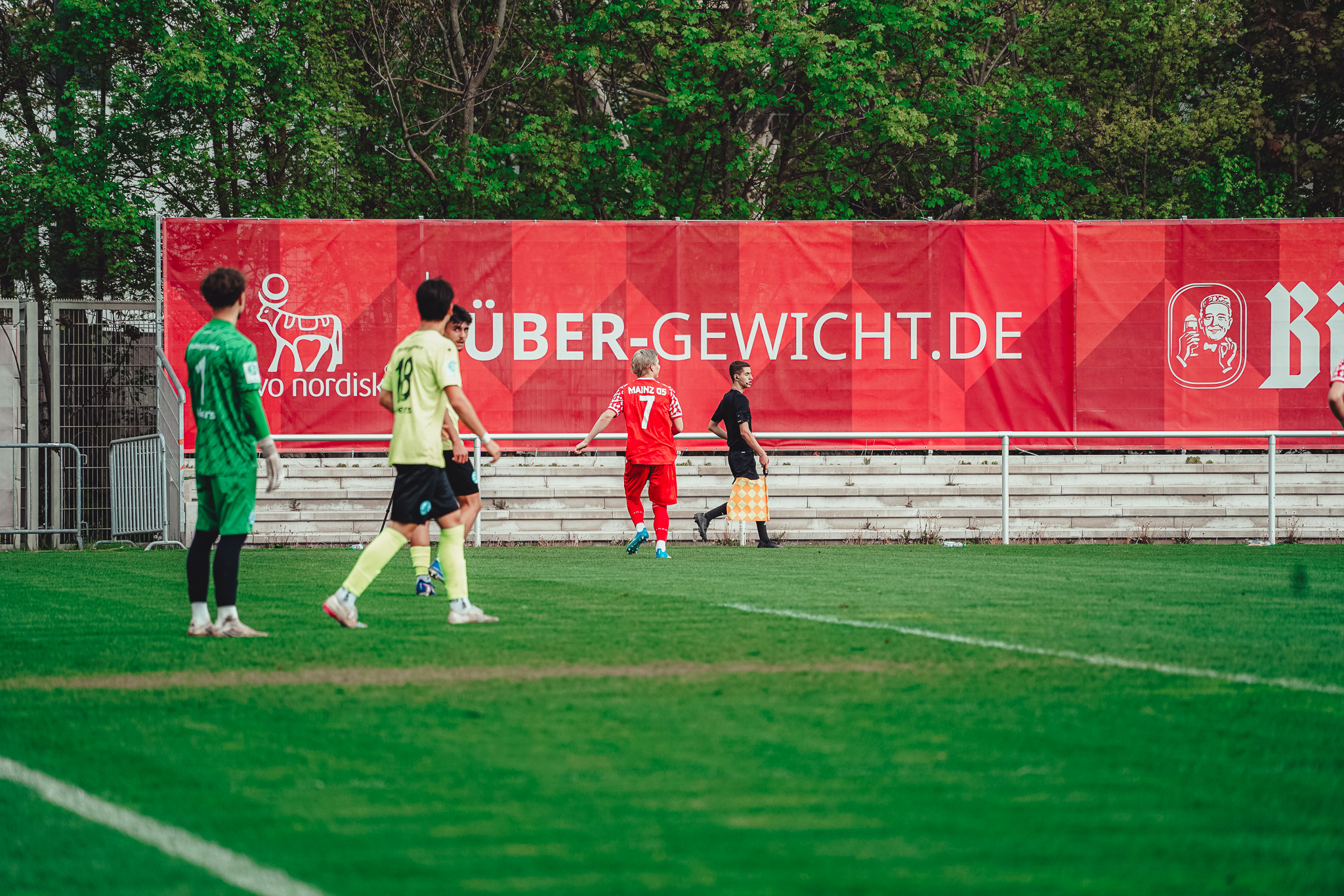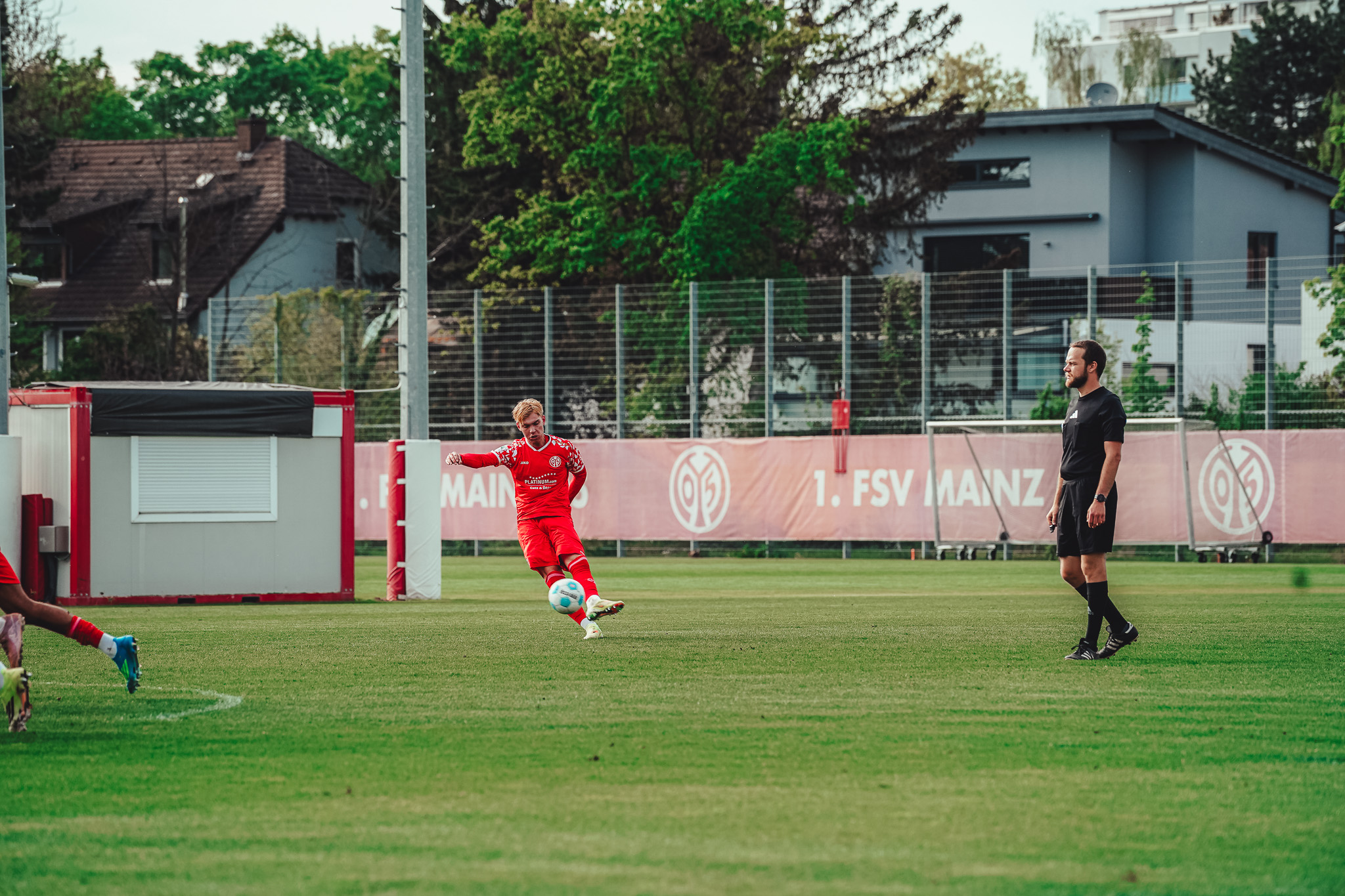 Nach den zwei schnellen Gegentreffern stabilisierten sich die Schwaben und hielten die weiterhin ballbesitzdominierenden 05ER weitesgehend von ihrem Tor weg. Kurz darauf musste FSV-Keeper Nick Hartung das erste Mal eingreifen, auch wenn ihm Arman Sharifis Schuss aus 16 Metern keine Probleme bereitete (30.). Auf der Gegenseite blieben die Rheinhessen effektiv und erzielten auf sehenswerte Art und Weise ihr nächstes Tor. Nach einem tollem hohen Pass von Maximilian Polzin auf Justin Baldwin erhöhte letzterer per Lupfer über Barth hinweg in den Winkel auf 3:0 (36.). In der Schlussminute der ersten Halbzeit hätte der 17-Jährige beinahe seinen ersten Doppelpack in der laufenden Saison geschnürt, wenn Barth seinen Distanzschuss aus 22 Metern nicht pariert hätte.