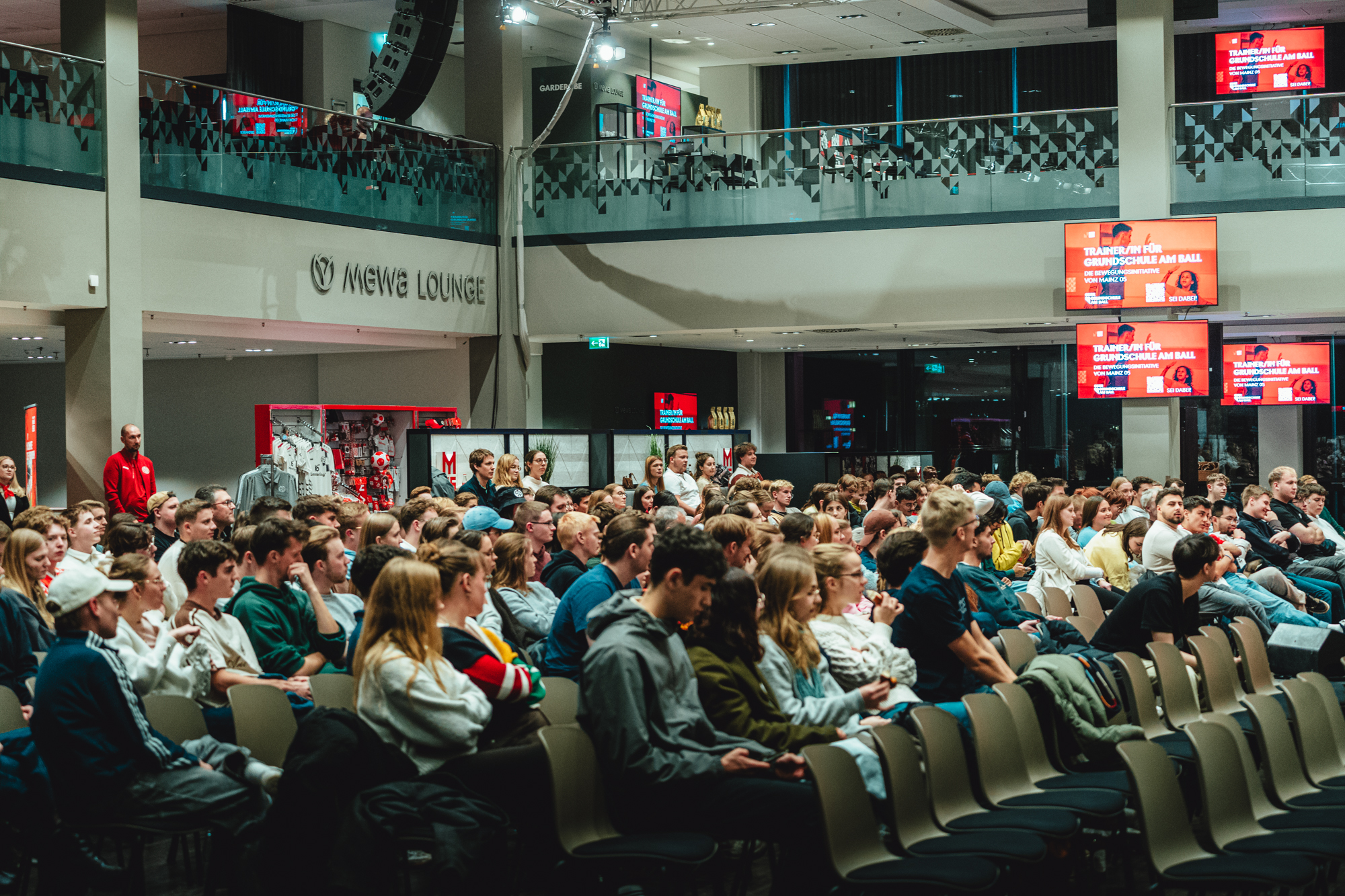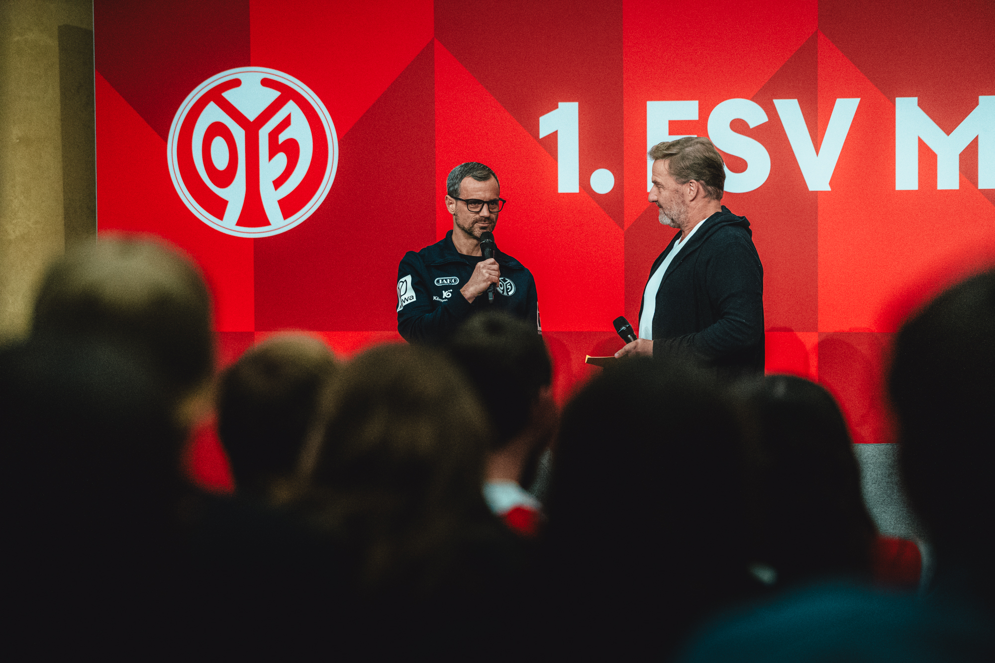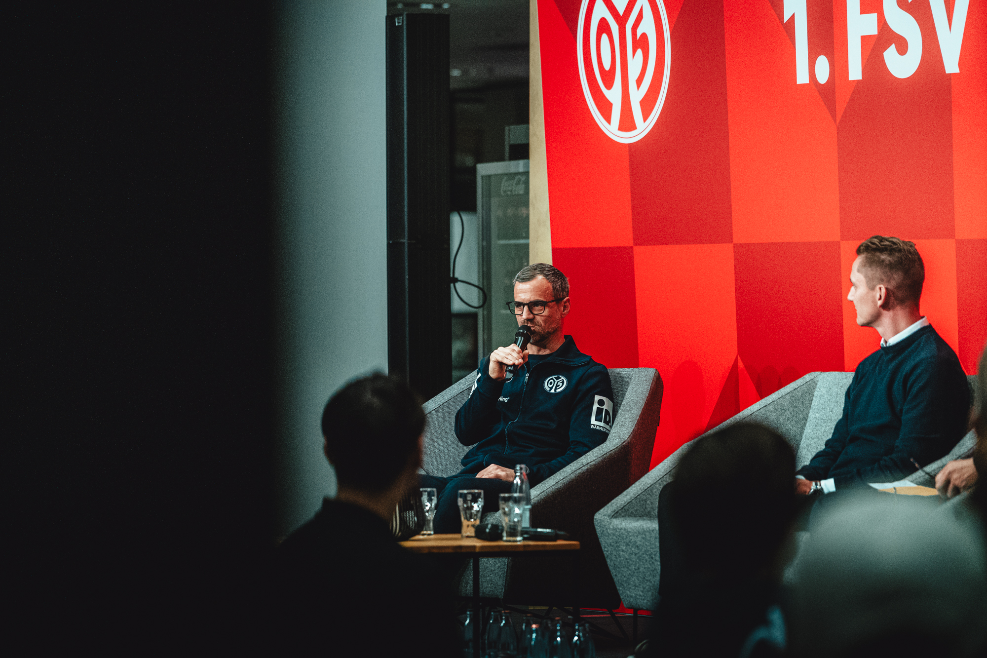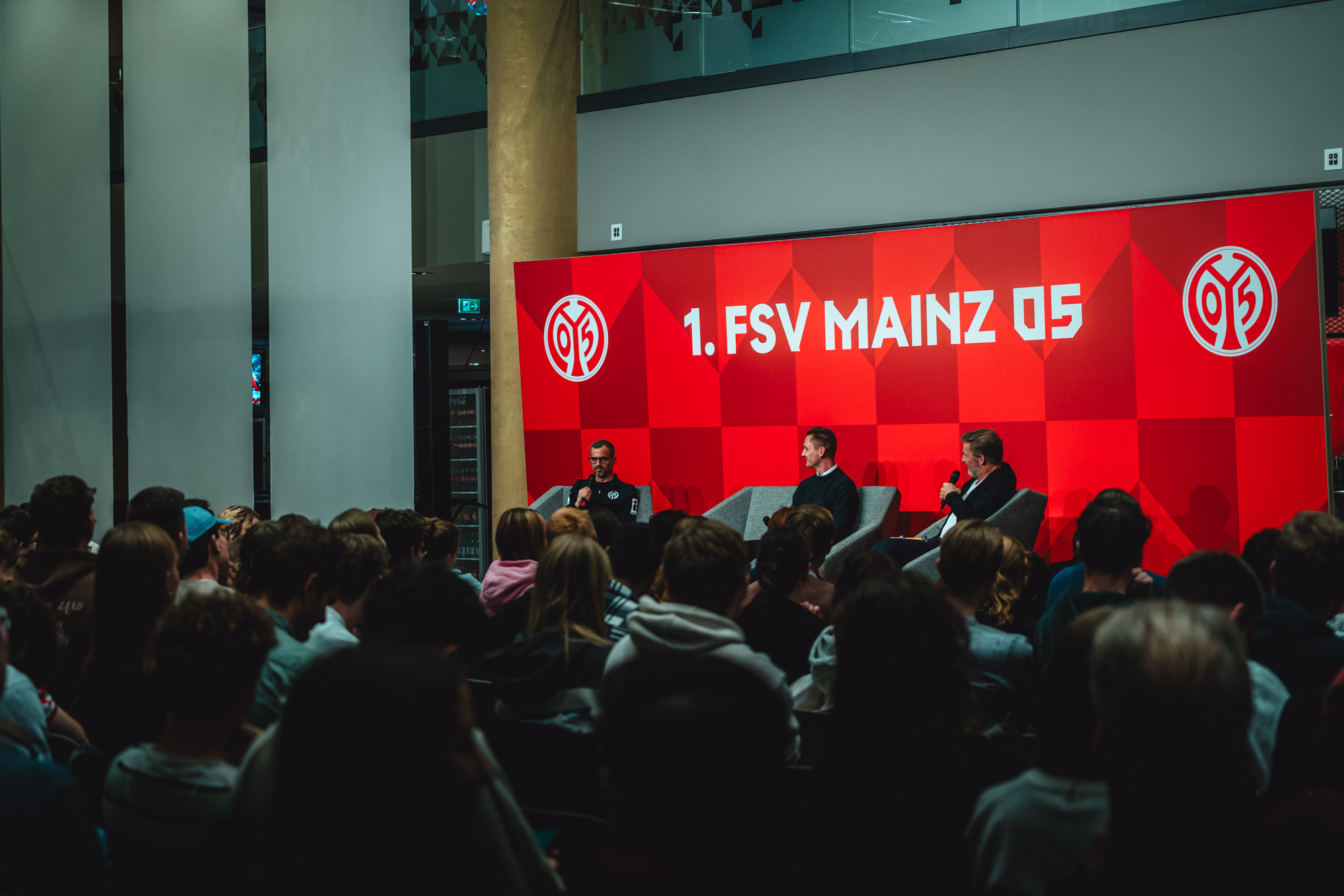 Fast schon traditionell folgen Mainzer Studierende zu Beginn jedes Wintersemesters der Einladung des FSV in die MEWA ARENA. Zum einen, um einer unterhaltsamen Talkrunde mit jährlich wechselnden Themenschwerpunkten beizuwohnen, zum anderen aber auch, um den Verein sowie die 05-Heimspielstätte genau unter die Lupe zu nehmen. Am Montagabend sollte es vor einigen hundert Anwesenden um den Umgang mit den zahlreichen Englischen Wochen der laufenden Saison aufgrund der Teilnahme an der Conference League gehen: "MAINZAAAAA INTERNATIONAL – Belastungssteuerung zwischen nationalem Ligabetrieb und internationalen Herausforderungen" lautete die Überschrift der Gesprächsrunde zwischen Niko Bungert, Sportdirektor von Mainz 05, sowie Sven Herzog, Leiter Performance beim FSV und Moderator Martin Quast.