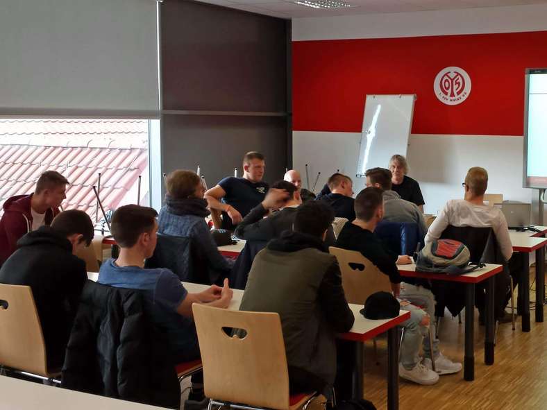 „Unserem eigenen Anspruch gemäß, die Jugendspieler auch in ihrer persönlichen Entwicklung zu unterstützen, ist es sinnvoll und notwendig, den Spielern ein umfassendes Bild über die Facetten des Fußballspielers im Leistungsbereich zu verschaffen“, erklärt der Sozialpädagoge des Nachwuchsleistungszentrums Philipp Steidle. Gemeinsam mit zwei Kollegen der Diakonie Wiesbaden, Volker Stabel und Erich Schmidt, organisierte er dazu je eine mannschaftsspezifische Veranstaltung zu dem Thema „Tabak, Drogen, Alkohol“ für die Teams des Leistungsbereichs (U16, U17 und U19).