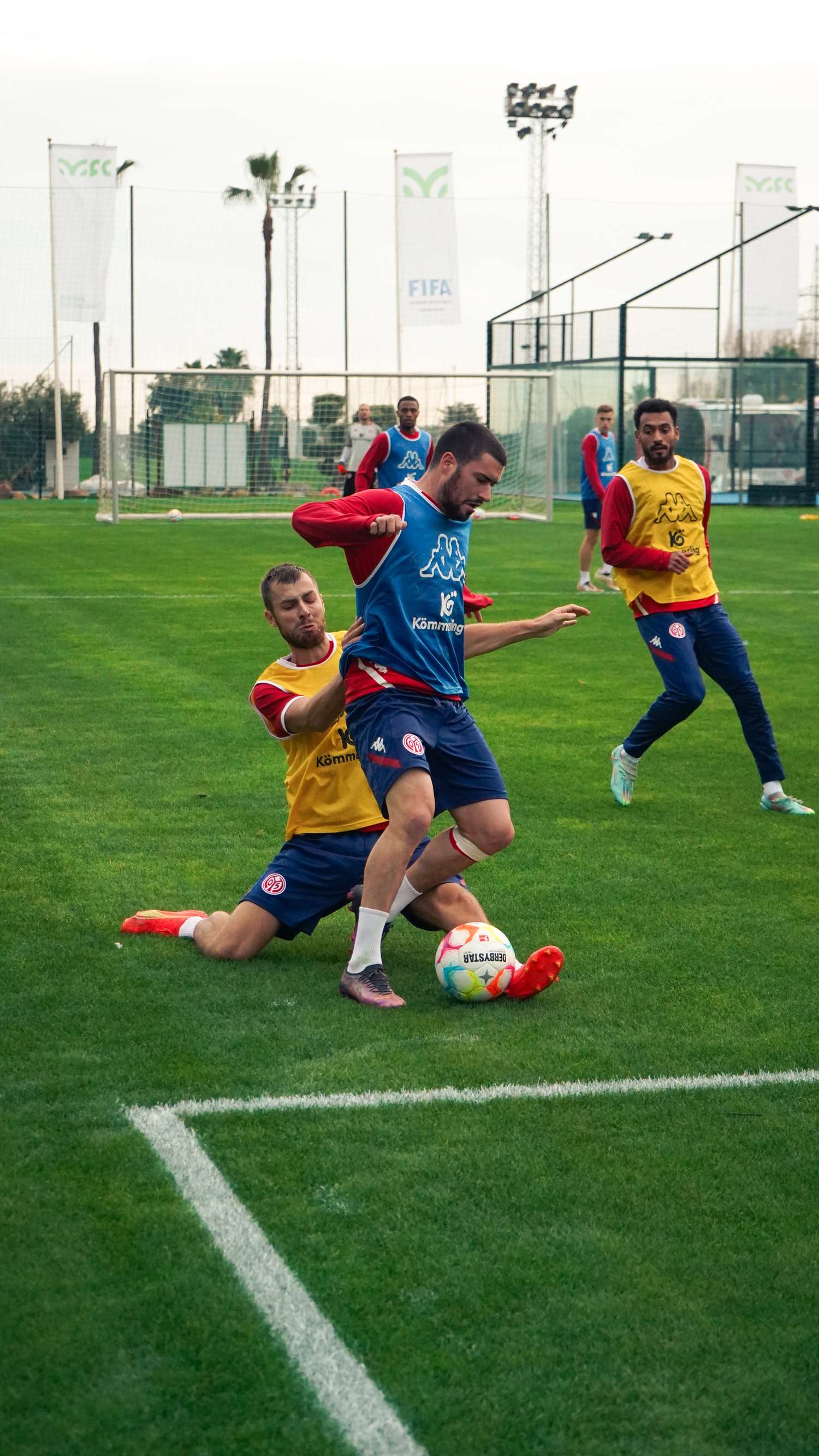 Mit der Nachricht, dass Jonathan Burkardt nicht mehr nach Spanien nachreisen wird, hatte der Donnerstag begonnen. Der Angreifer bleibt in München, um weitere Reha-Maßnahmen für sein operiertes Knie zu absolvieren und stößt nächste Woche in Mainz wieder zur Mannschaft. Seine Teamkollegen hatten in der morgendlichen Videositzung gut aufgepasst und brachten das auf den Platz, was das Trainerteam der 05ER um Svensson sehen wollte: "Es war keine kurze Einheit und dennoch war bis zum Ende die Qualität in den Abläufen, die wir sehen wollen. Da gab es keinen Grund, unzufrieden zu sein", freute sich der FSV-Chefcoach über das Engagement seiner Akteure. Defensive Prinzipien in einem zunächst eng abgesteckten Feld, das von Spielform zu Spielform größer gesteckt wurde, standen auf dem Plan. Pressing, Gegenpressing, hohes Verteidigen, intensives Anlaufen und Zweikämpfe waren von den FSV-Profis gefragt, aber auch das Lösen aus engen Situationen mit dem Ball. Auch in der zweiten Einheit, diesmal zunächst auf größerem Feld, am Ende in Turnierform beim 6-vs-6 standen diese Verhaltensweisen im Mittelpunkt.
