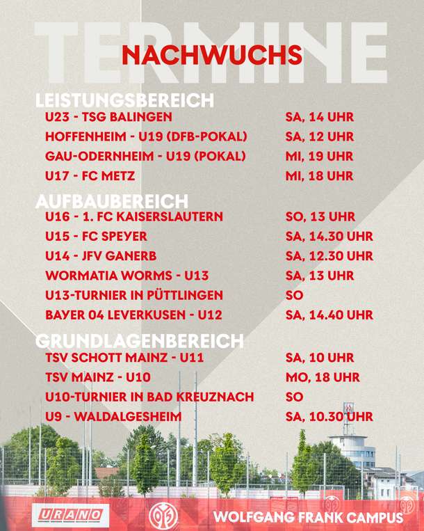 Die höchste Mainzer Ausbildungsmannschaft U23 empfängt am Samstag (14 Uhr) die TSG Balingen im Bruchwegstadion, für die U19 geht es in der zweiten Runde des DFB-Pokals der Junioren am Samstag (12 Uhr) zur TSG Hoffenheim. Für die U17 steht in der Länderspielpause aufgrund der U17-EM-Qualifikation am kommenden Mittwoch (18 Uhr) ein Testspiel auf dem WOLFGANG FRANK CAMPUS gegen den FC Metz an.