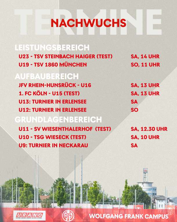 U23: Die höchste Mainzer Ausbildungsmannschaft empfängt am Samstag um 14 Uhr den Ligakonkurrenten TSV Steinbach Haiger zu einem Testspiel auf Rasenplatz 1 auf dem WOLFGANG FRANK CAMPUS. Der kostenlose Zugang für Zuschauer erfolgt über den Eingang hinter der Haupttribüne des Bruchwegstadions.