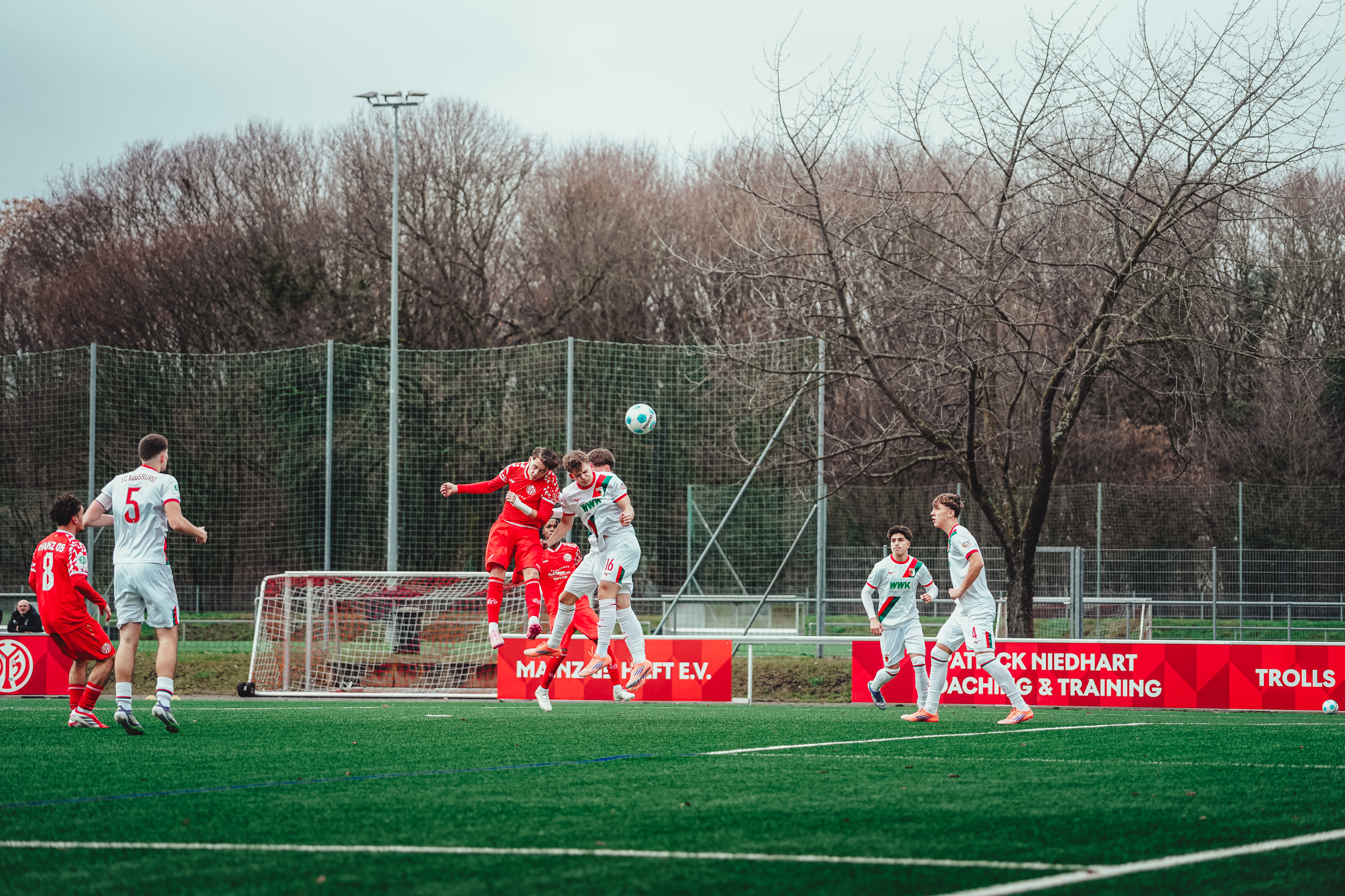 Die Mainzer U17 hat beim Auswärtsspiel gegen den FC Augsburg eine gute Leistung gezeigt, aber sich nicht mit drei Punkten belohnen können. Bis zur 94. Minute hatten die 05ER in Führung gelegen, bevor den Fuggerstädtern kurz vor dem Schlusspfiff noch der 2:2-Ausgleich gelang. Im Vergleich zum Heimsieg gegen Bayer 04 Leverkusen hatte Heidenmann zwei Startelf-Änderungen vorgenommen. Anstelle von David Osei und Alessio Kersten rückten Maximilian Polzin und Zinedine Hadzic in die Anfangsformation. Der FSV hatte von Beginn an spielerische Vorteile, den Führungstreffer erzielten jedoch die konterstarken Gastgeber in Person von Fabio Ebner nach einer schnellen Umschaltaktion (19.). Die Augsburger Führung hielt allerdings nur kurz an, da 05-Toptorjäger Luca Hampel drei Minuten später per direktem Freistoß ausglich. Auch nach der Pause behielten die Rheinhessen die Spielkontrolle und belohnten sich in der 64. Minute mit dem 2:1 durch Fabio da Silva Santos. Bis zur vierten Minute der Nachspielzeit sah der FSV wie der sichere Sieger aus. Doch dann bekamen die Hausherren an der Strafraumkante nochmal einen Freistoß zugesprochen, den Makary Makut per Kopf zum Last-Minute-Ausgleich verwandelte.