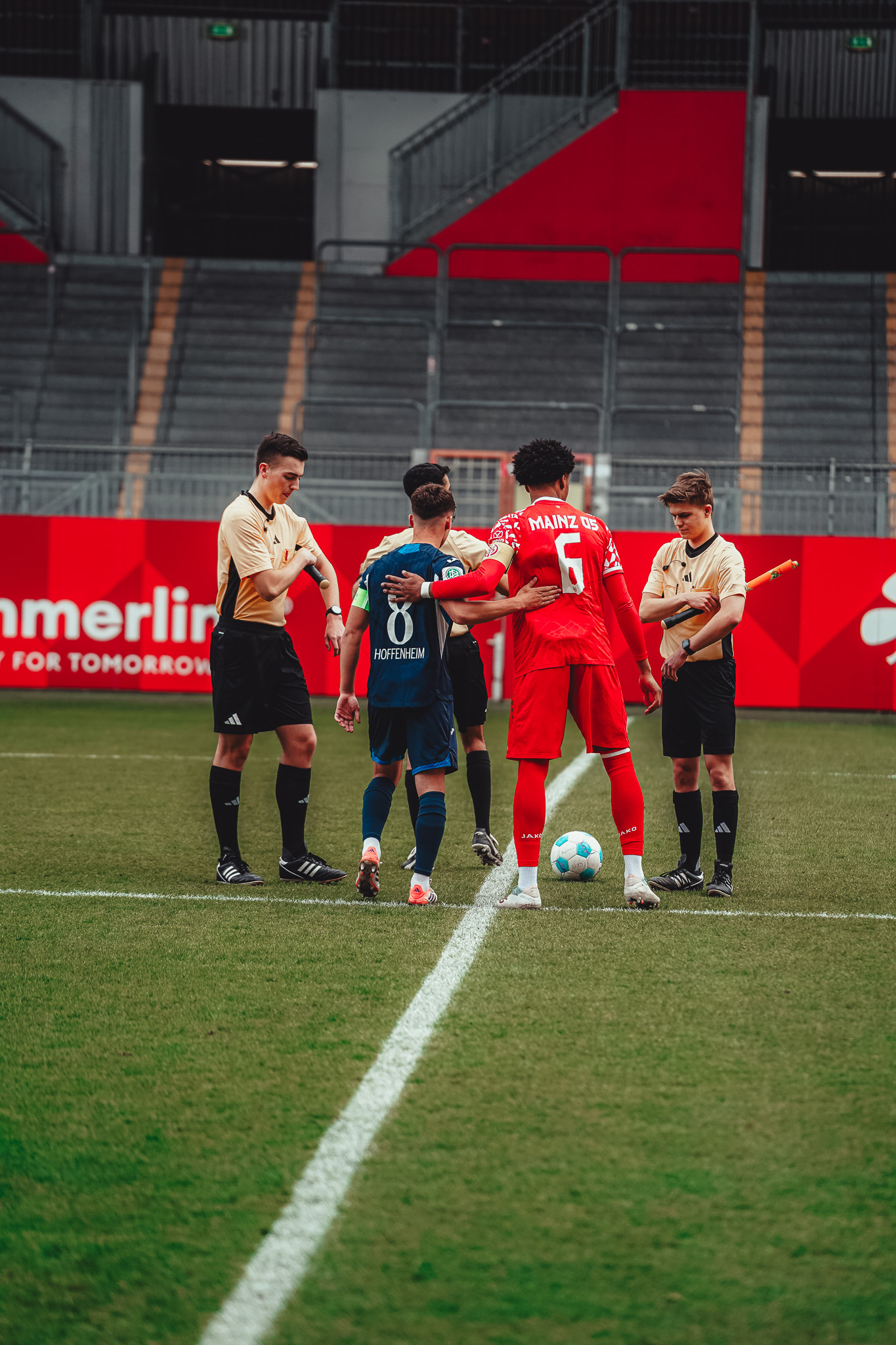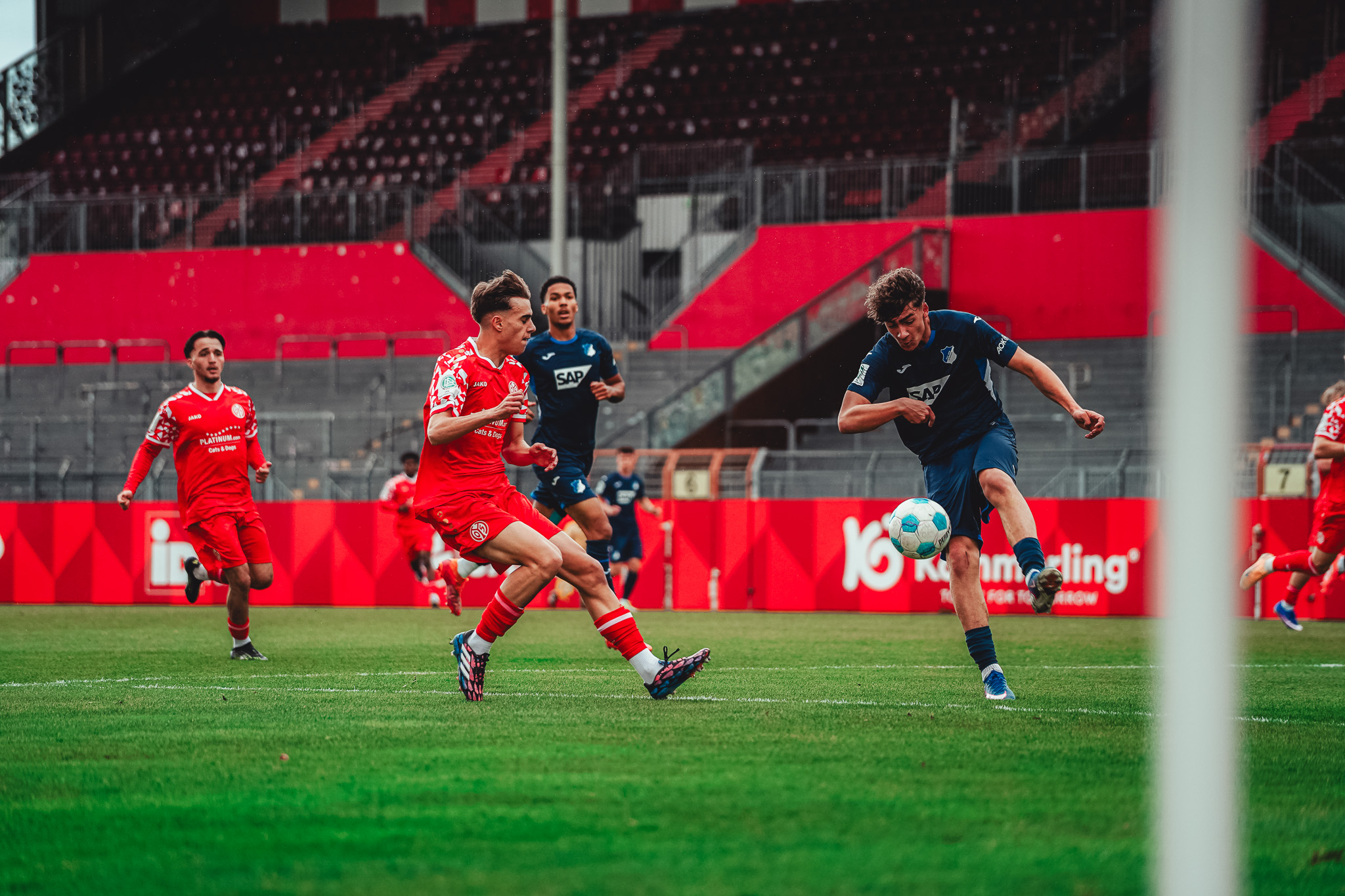 In der zweiten Hälfte bauten die Gäste ihre Führung dann kurz nach Wiederanpfiff weiter aus. Emil Kramer zog vor der FSV-Defensivkette nach innen, suchte sich eine Schussposition aus und platzierte den Ball im linken Eck – 0:2 (51.). Die Mainzer zeigten sich jedoch bemüht, wieder den Anschluss herzustellen, entwickelten aber nur wenig Torgefahr. Zehn Minuten nach dem Gegentreffer dribbelte sich Philipp Schreiber bis in den Fünfmeterraum vor, scheiterte mit seinem Abschluss jedoch an der Gästeabwehr. Auch der darauffolgende Versuch blieb ohne Erfolg: Mika Preßler traf eine Hereingabe von Janega nicht sauber, sodass TSG-Keeper Biedermann den Ball problemlos aufnehmen konnte.