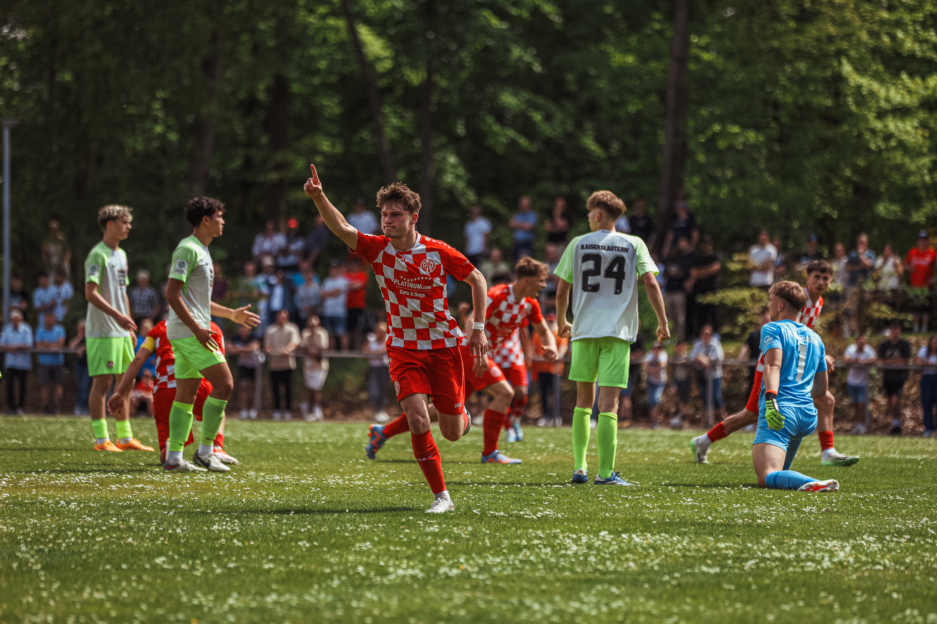 Der Südwest Verbandspokal geht auch 2024 in die Landeshauptstadt! Nach 120 umkämpften Minuten bei sommerlichen Temperaturen konnte sich die U19 des 1. FSV Mainz 05 am Mittwochnachmittag im Derby gegen den 1. FC Kaiserslautern nach Verlängerung mit 4:1 durchsetzen und hat sich damit gleichzeitig für den DFB-Pokal-Wettbewerb der Saison 2024/25 qualifiziert. Dabei hatte es im zweiten Durchgang lange so ausgesehen, als würde den Pfälzern, die kurz nach der Pause durch Oskar Prokopchuk in Führung gegangen waren, die Überraschung gelingen. Doch weil Jason Amann in der Schlussphase der Ausgleich gelang und der FSV in der Verlängerung unter dem Strich den längeren Atem bewies, jubelten nach weiteren Treffern von Joonas Frenzel (Doppelpack) und erneut Amann die Rot-Weißen. "Wahnsinn, wie die Gruppe das heute wieder geschafft haben", freute sich ein stolzer 05-Trainer im Anschluss.