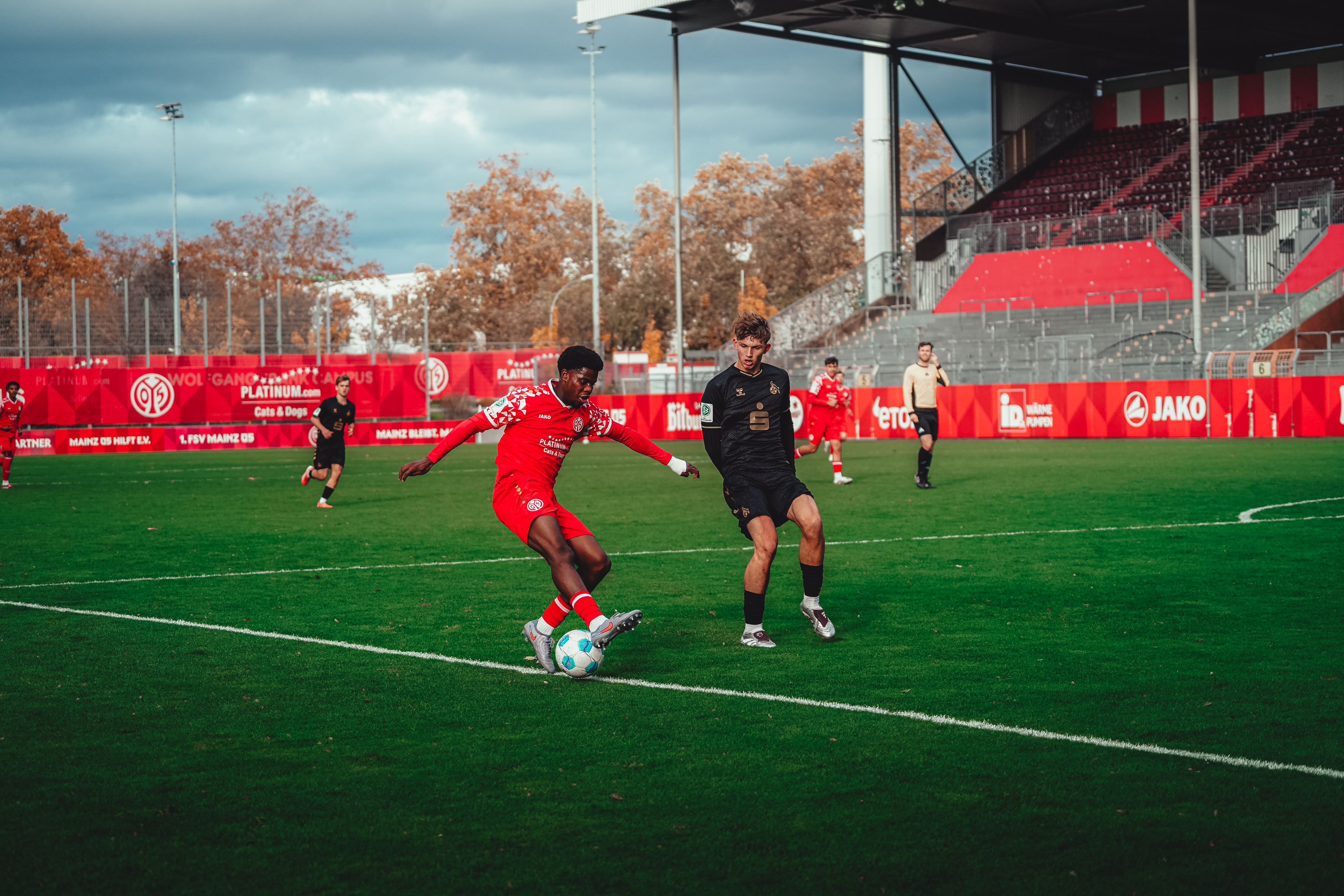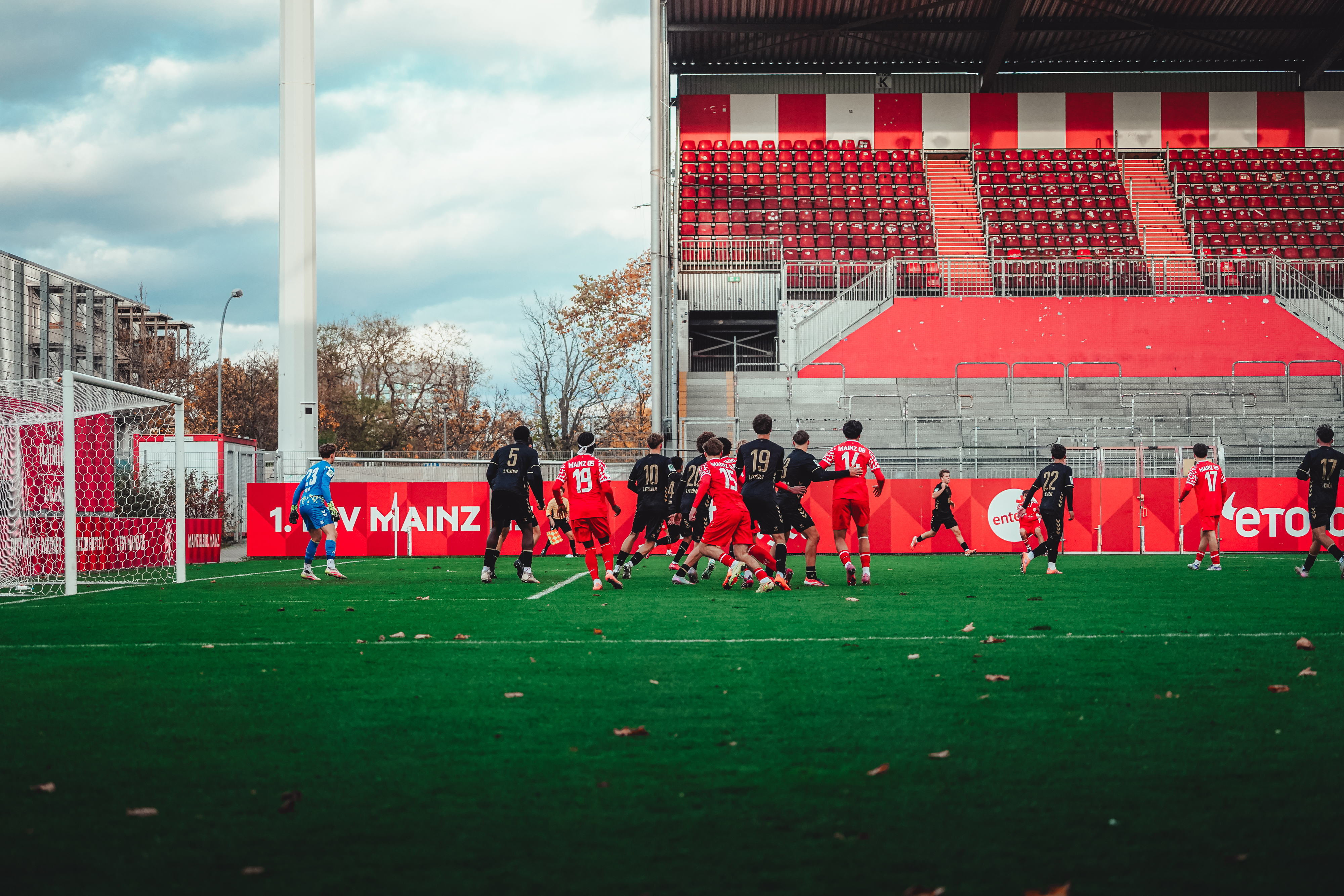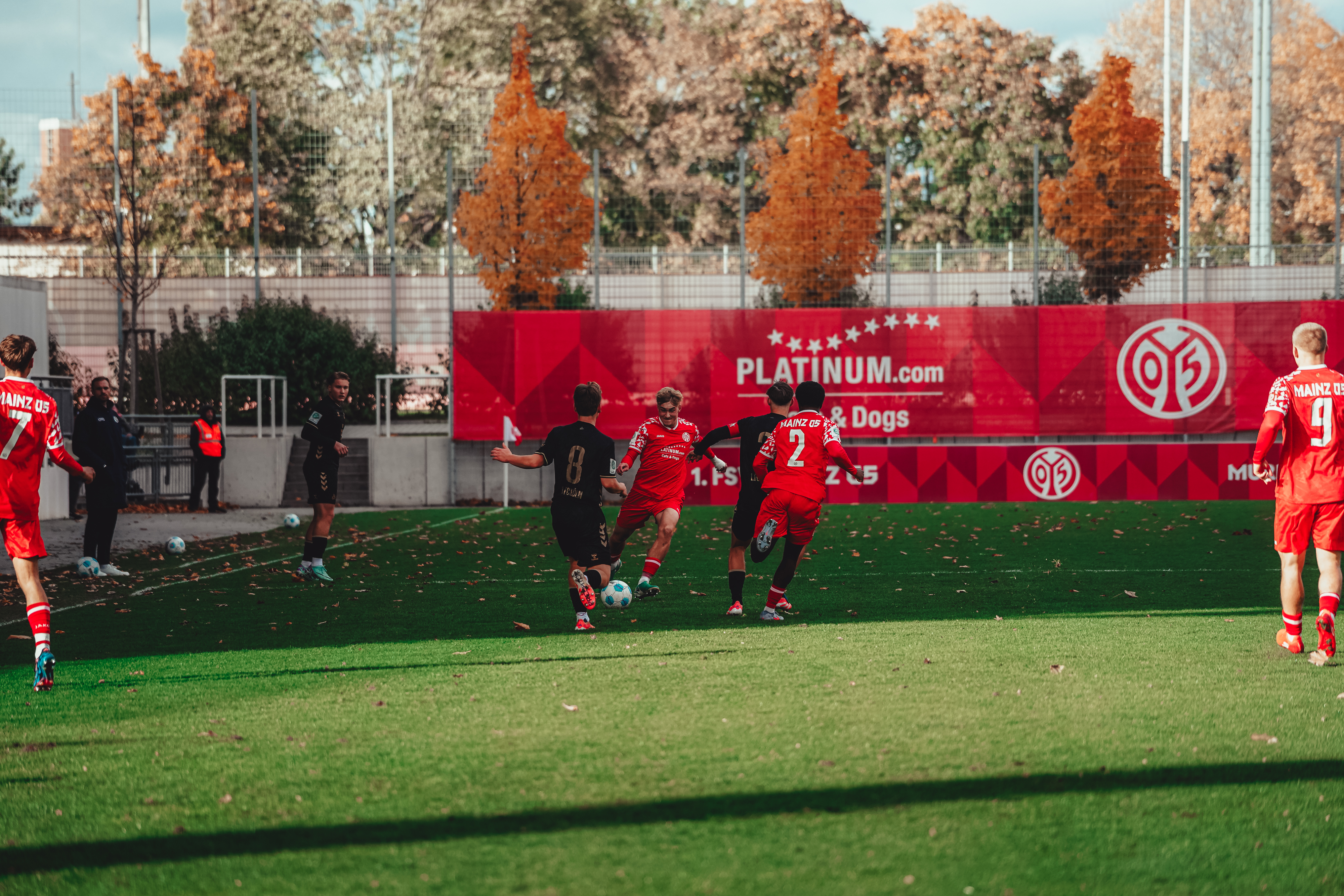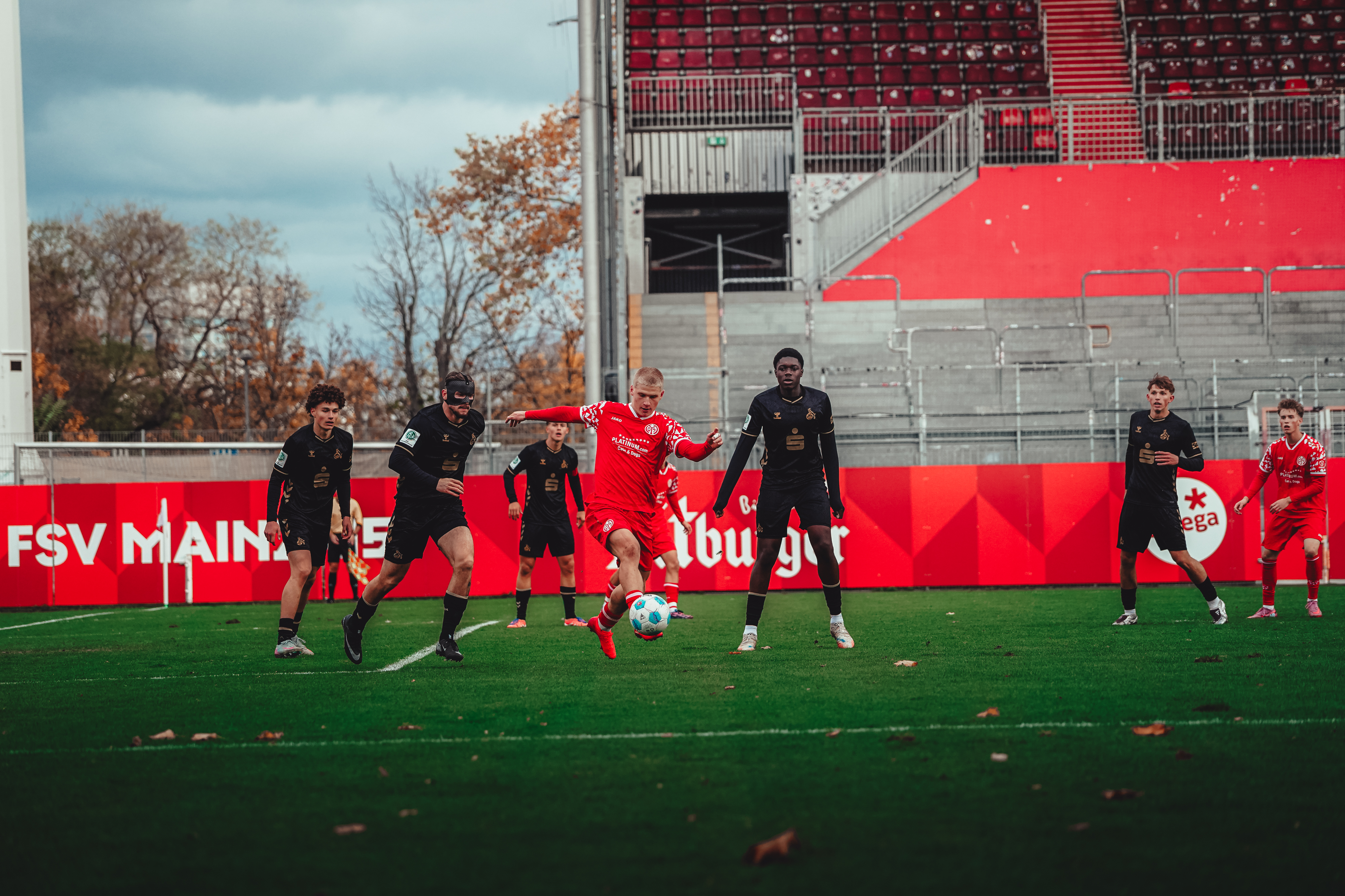 Eine Standardsituation aus zentraler Position 18 Meter vor dem Mainzer Tor musste für die erste Chance der Gäste herhalten. Fynn Schenten setzte den Ball allerdings weit am rechten Pfosten vorbei (27.). Im Anschluss verstärkten die 05ER den Offensivdruck. Nach schöner Vorarbeit von Debrah landete der Ball vom Knie seines Teamkollegen Domenic Köppel aber auf der Latte (30.). Kurz danach verpasste Mika Preßler die Vorlage von Noel Pafla im Strafraum um Zentimeter. Von den Gästen kam nur wenig. Eine Führung der Gastgeber wäre zu diesem Zeitpunkt verdient gewesen. Aus dem Nichts geriet der FSV aber kurz vor der Pause in Rückstand, weil die Gäste ihre einzige Topchance nutzten. Ein langer Ball erreichte Maik Afri Akumu auf der rechten Außenbahn, der nach innen ziehend Pafla stehen ließ und ins kurze Eck abschloss - 0:1 (42.). Dabei blieb es bis zum Halbzeitpfiff von Schiedsrichter Jannis Jäschke.