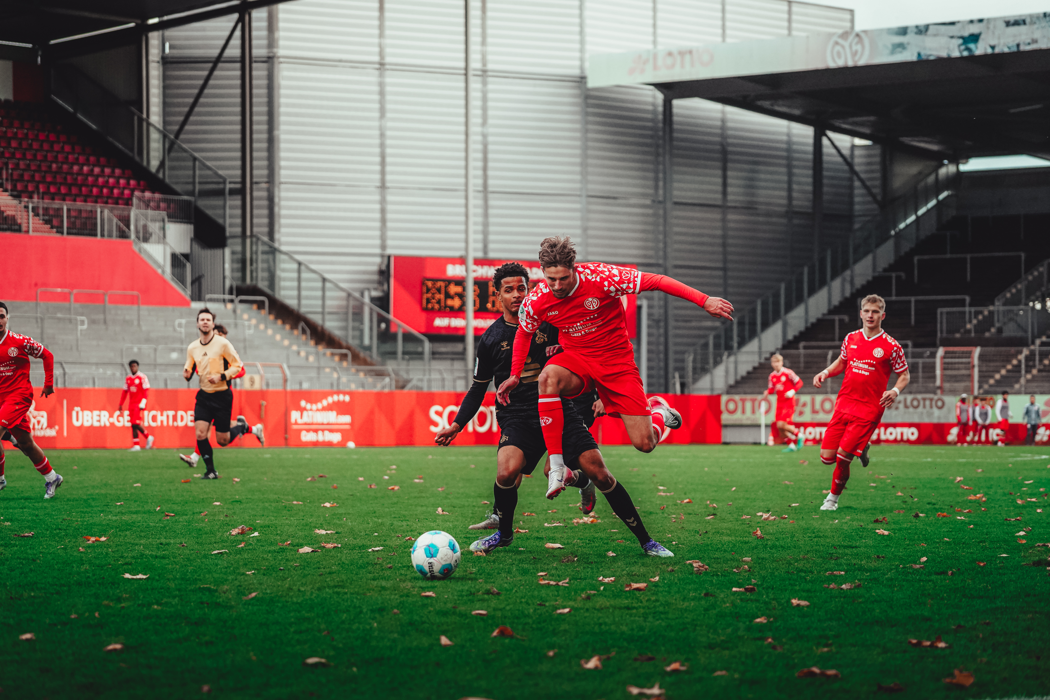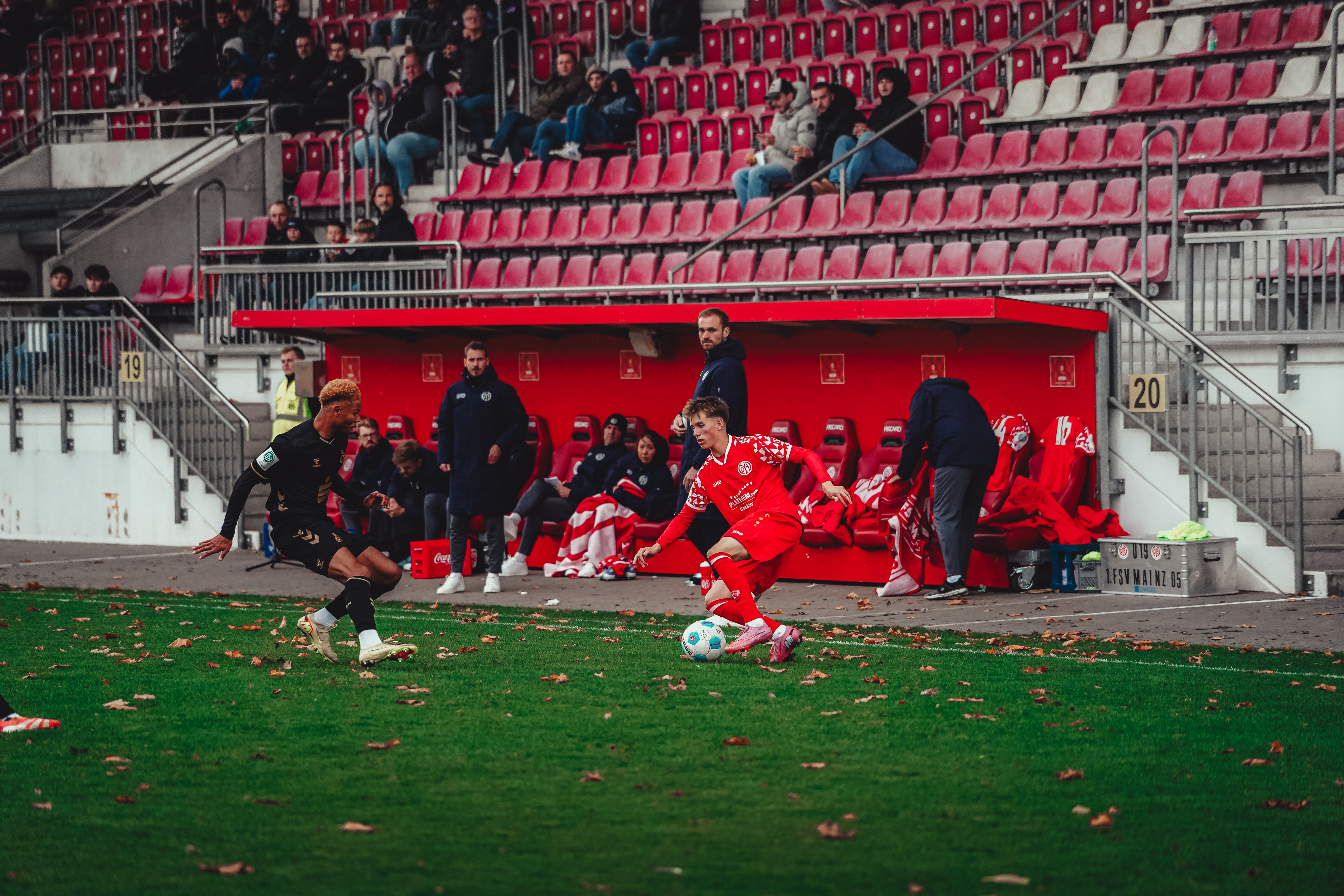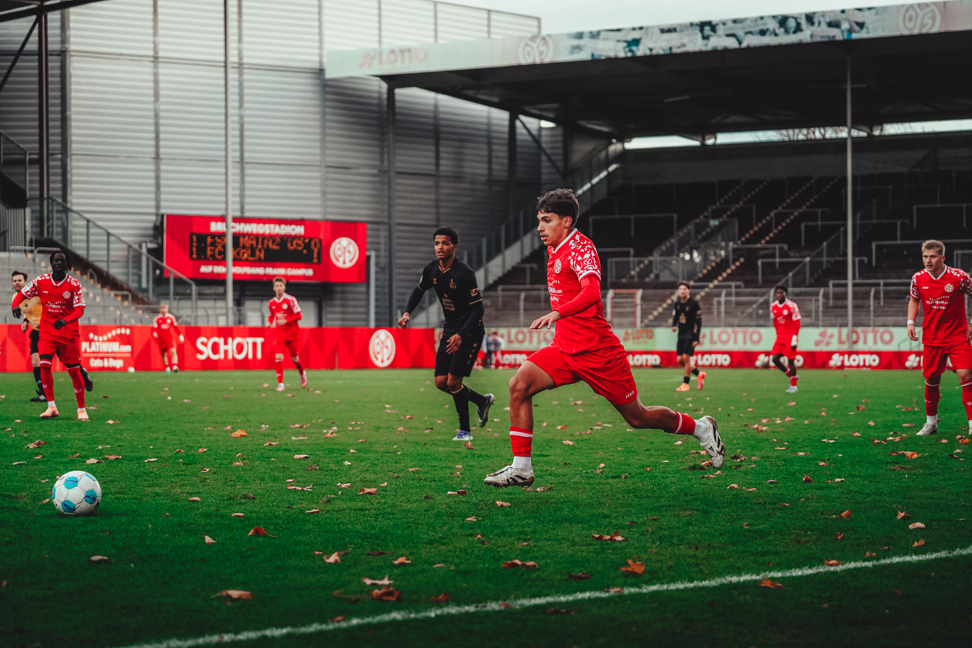 Eine Standardsituation aus zentraler Position 18 Meter vor dem Mainzer Tor musste für die erste Chance der Gäste herhalten. Fynn Schenten setzte den Ball allerdings weit am rechten Pfosten vorbei (27.). Im Anschluss verstärkten die 05ER den Offensivdruck. Nach schöner Vorarbeit von Debrah landete der Ball vom Knie seines Teamkollegen Domenic Köppel aber auf der Latte (30.). Kurz danach verpasste Mika Preßler die Vorlage von Noel Pafla im Strafraum um Zentimeter. Von den Gästen kam nur wenig. Eine Führung der Gastgeber wäre zu diesem Zeitpunkt verdient gewesen. Aus dem Nichts geriet der FSV aber kurz vor der Pause in Rückstand, weil die Gäste ihre einzige Topchance nutzten. Ein langer Ball erreichte Maik Afri Akumu auf der rechten Außenbahn, der nach innen ziehend Pafla stehen ließ und ins kurze Eck abschloss - 0:1 (42.). Dabei blieb es bis zum Halbzeitpfiff von Schiedsrichter Jannis Jäschke.