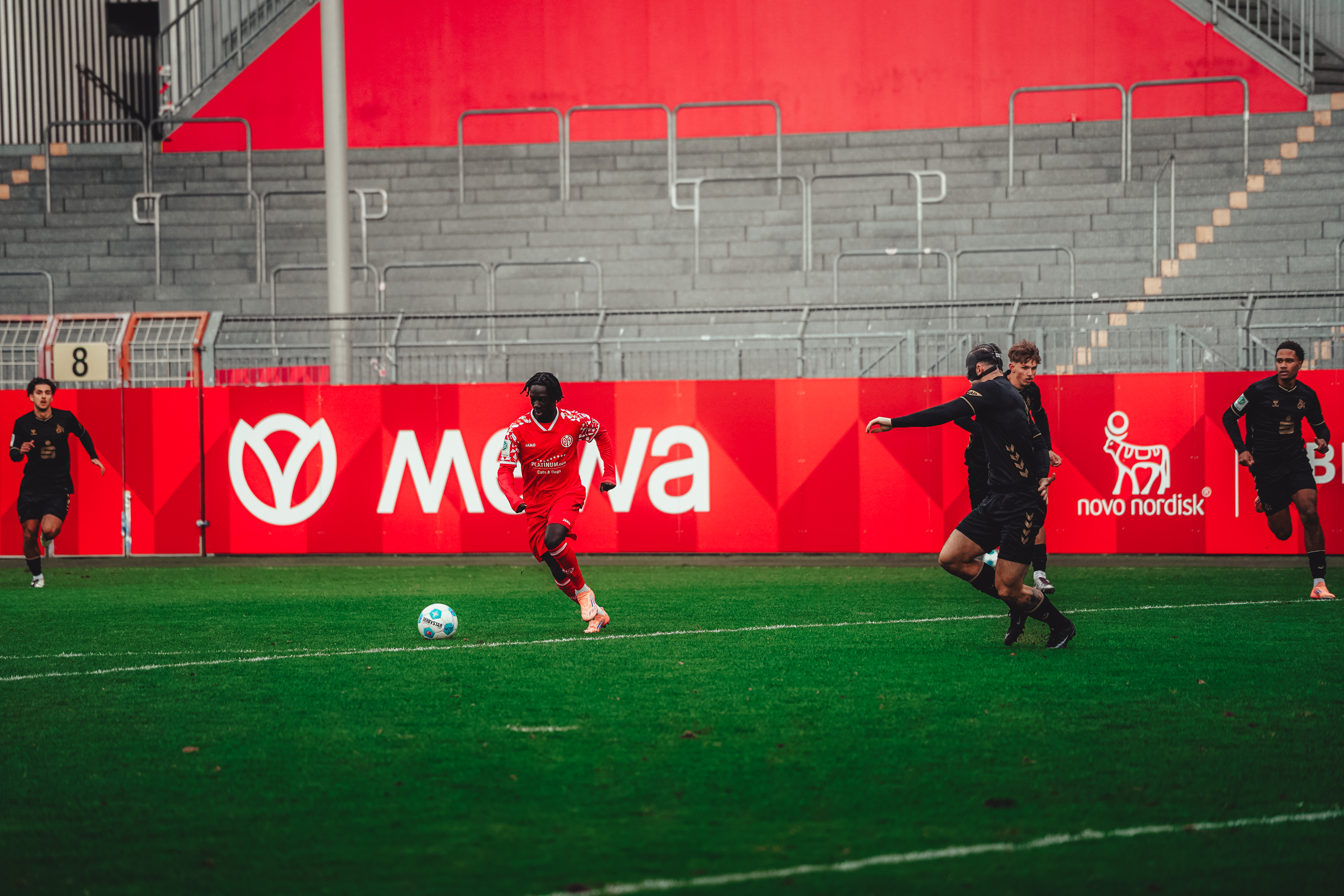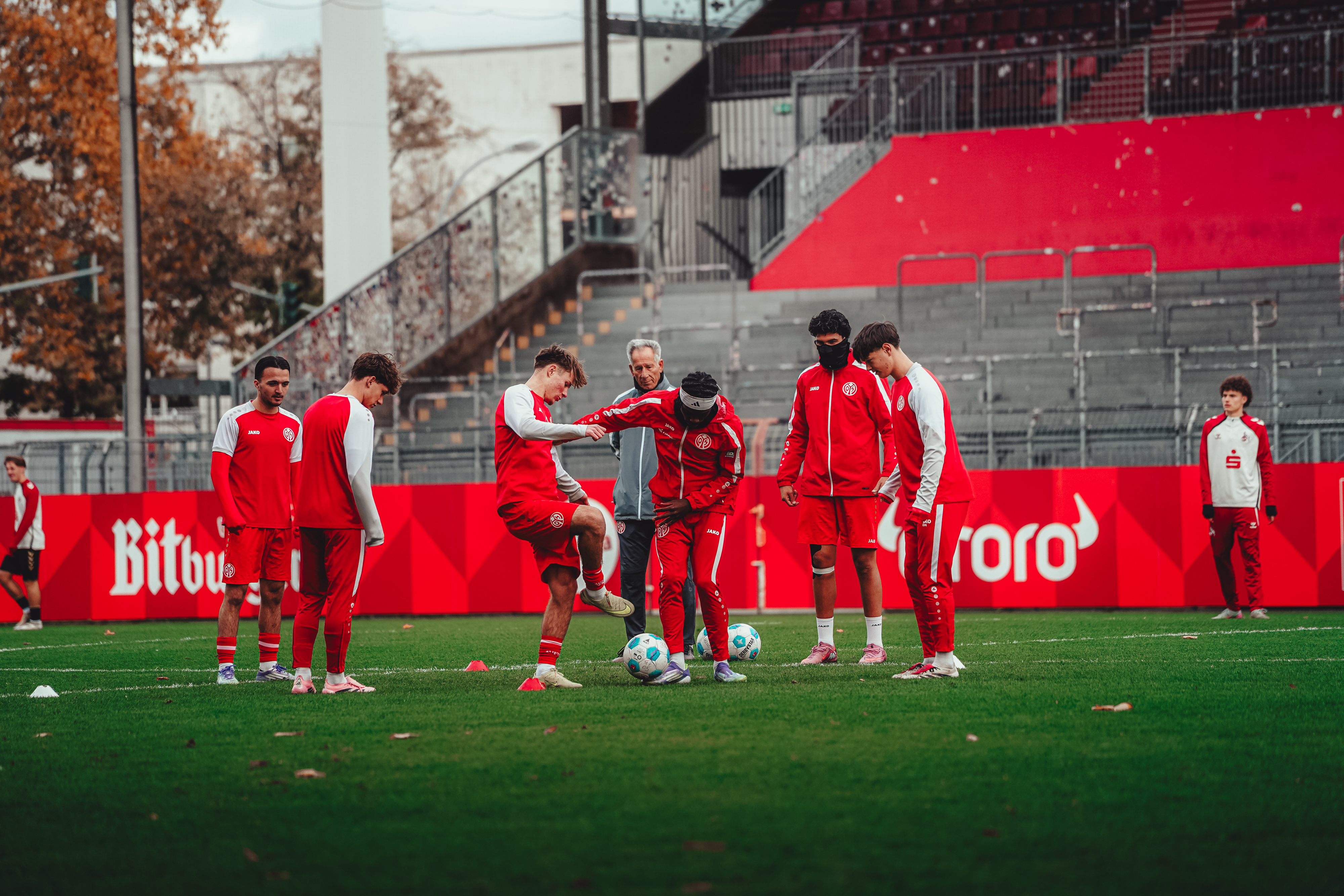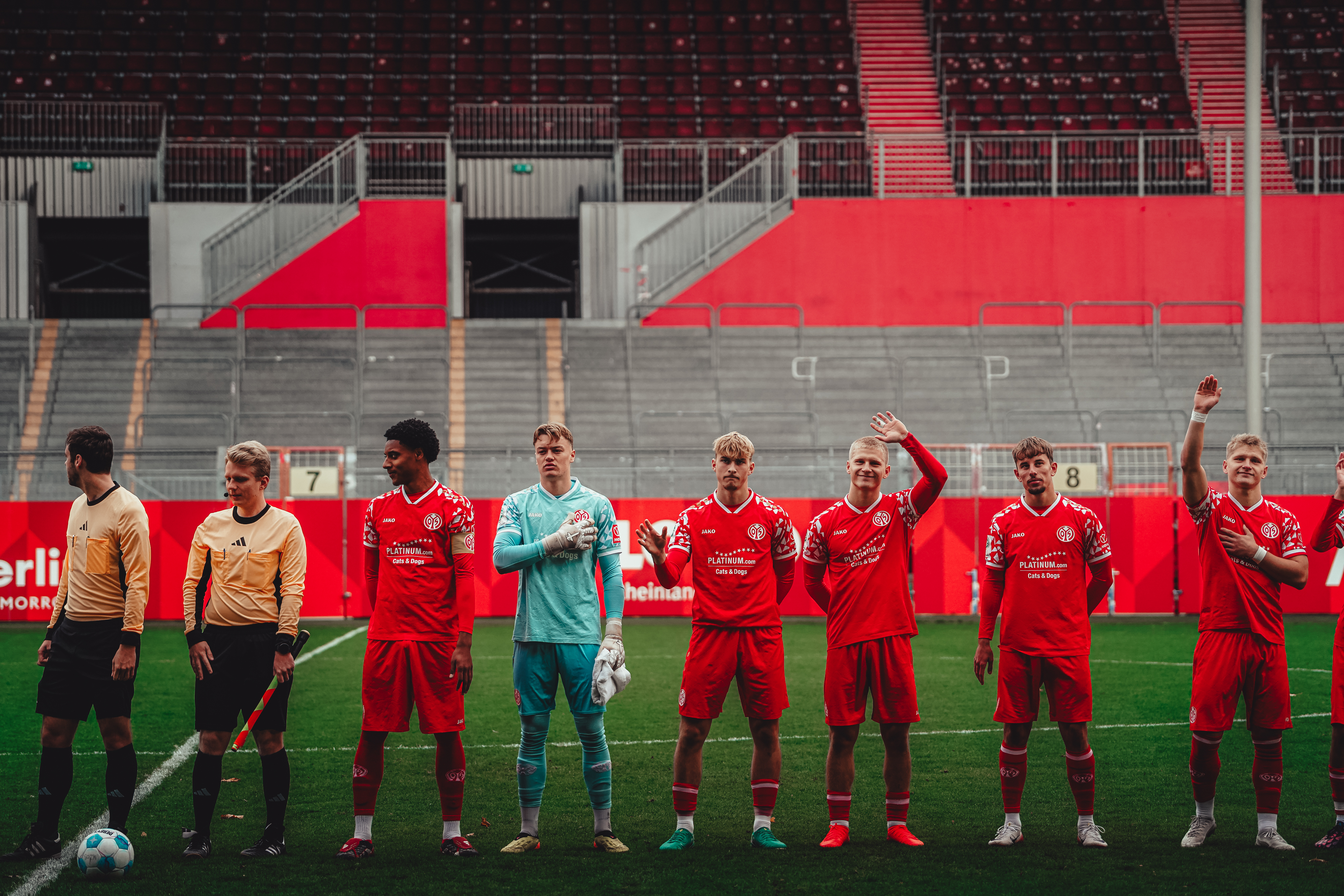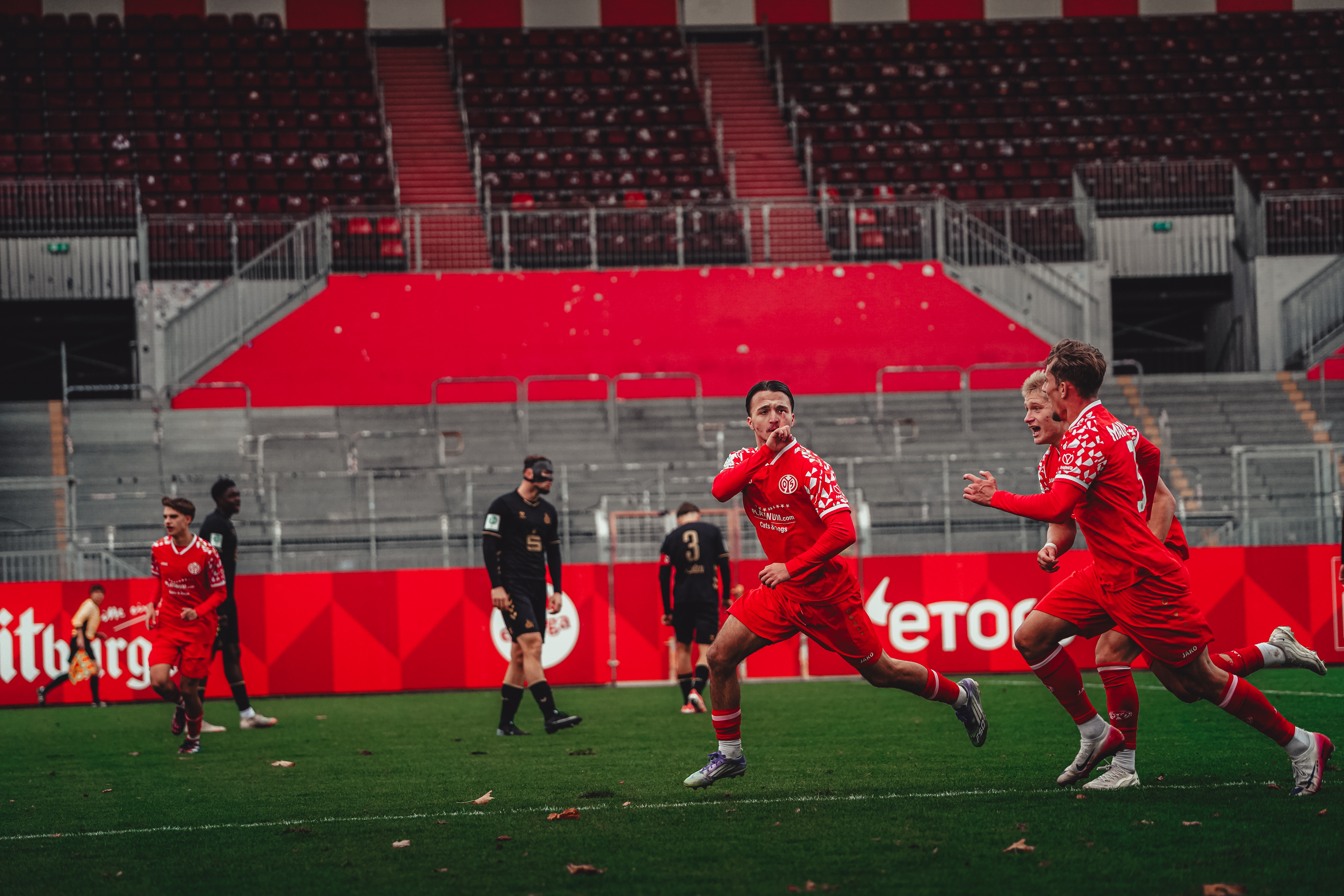 Eine Standardsituation aus zentraler Position 18 Meter vor dem Mainzer Tor musste für die erste Chance der Gäste herhalten. Fynn Schenten setzte den Ball allerdings weit am rechten Pfosten vorbei (27.). Im Anschluss verstärkten die 05ER den Offensivdruck. Nach schöner Vorarbeit von Debrah landete der Ball vom Knie seines Teamkollegen Domenic Köppel aber auf der Latte (30.). Kurz danach verpasste Mika Preßler die Vorlage von Noel Pafla im Strafraum um Zentimeter. Von den Gästen kam nur wenig. Eine Führung der Gastgeber wäre zu diesem Zeitpunkt verdient gewesen. Aus dem Nichts geriet der FSV aber kurz vor der Pause in Rückstand, weil die Gäste ihre einzige Topchance nutzten. Ein langer Ball erreichte Maik Afri Akumu auf der rechten Außenbahn, der nach innen ziehend Pafla stehen ließ und ins kurze Eck abschloss - 0:1 (42.). Dabei blieb es bis zum Halbzeitpfiff von Schiedsrichter Jannis Jäschke.