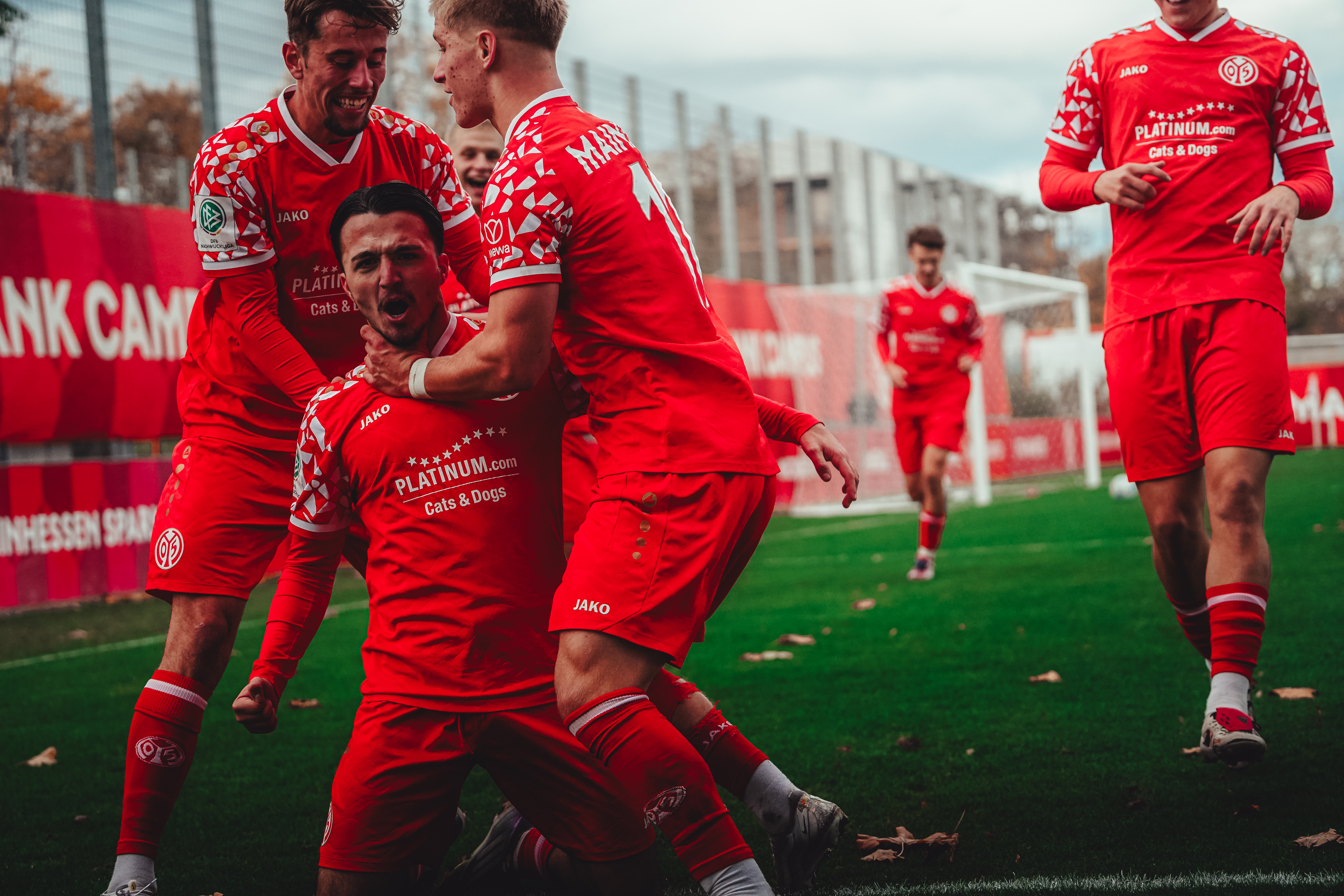 Der Wechsel kam genau zum richtigen Zeitpunkt, denn im Anschluss nahmen die 05ER wieder Fahrt auf und belohnten sich dafür auch in Form des Ausgleichs. Der gerade eingewechselte Latifi nahm aus 17 Metern halblinker Position Maß und schoss den Ball traumhaft und passgenau in den rechten Winkel - 1:1 (70.). Zwanzig Minuten blieben den Mainzern nun noch, um sich in der Vorrundengruppe G weiter von den Kontrahenten weiter abzusetzen. Per Standard gingen die Gäste jedoch erneut in Führung. Arian Römers setzte einen stark geschossenen Freistoß von der linken Seite aus 25 Metern genau an den rechten Innenpfosten - 1:2 (81.). Für den FSV hieß die Devise nun volle Offensive, um noch mindestens einen Punkt mitzunehmen. Der FC lauerte auf Konter. In der vierminütigen Nachspielzeit gelang es der Kirchhoff-Elf, sich noch eine klare Torchance zu erarbeiten. Der im Strafraum freigespielte Horlbeck scheiterte aber an Schmitz' Fußbabwehr.