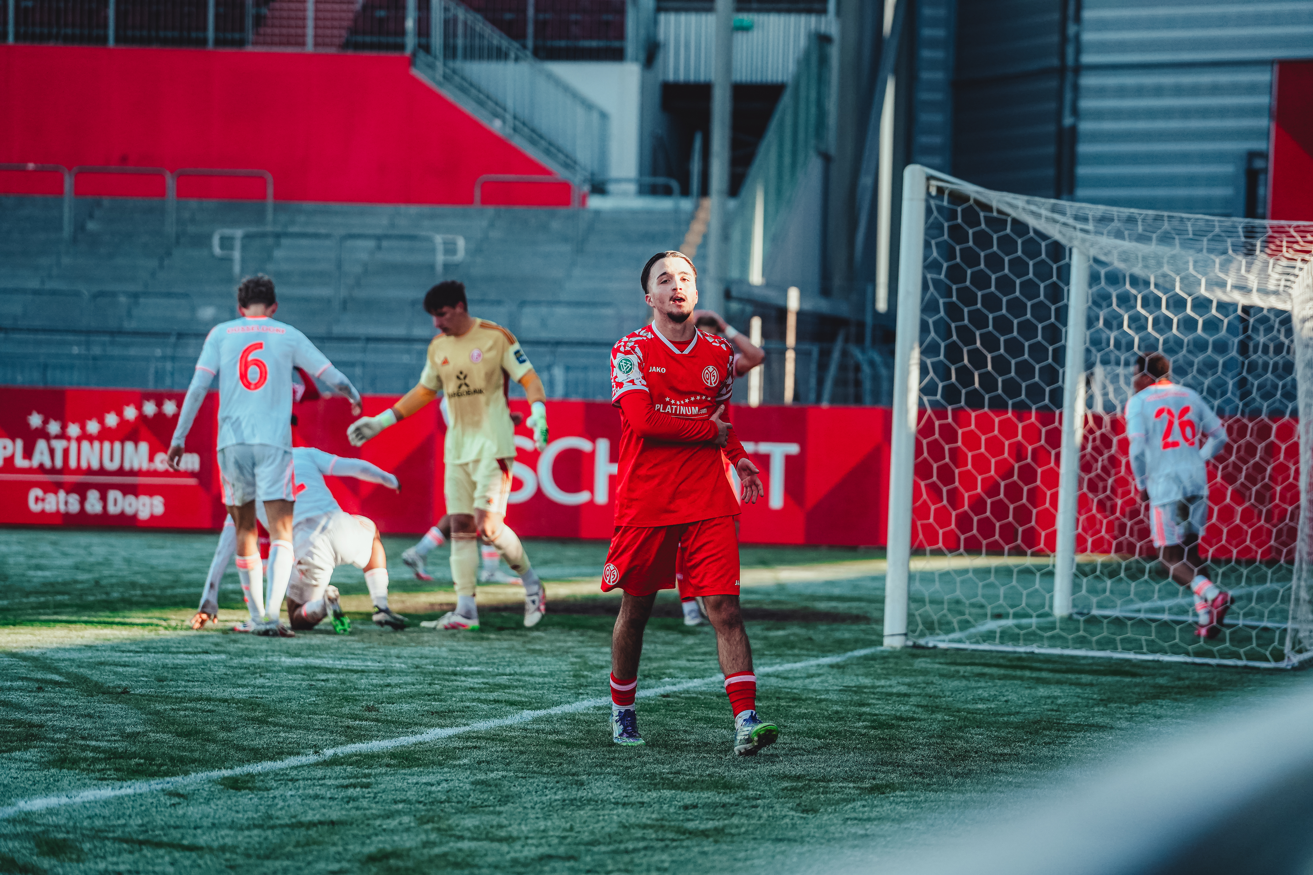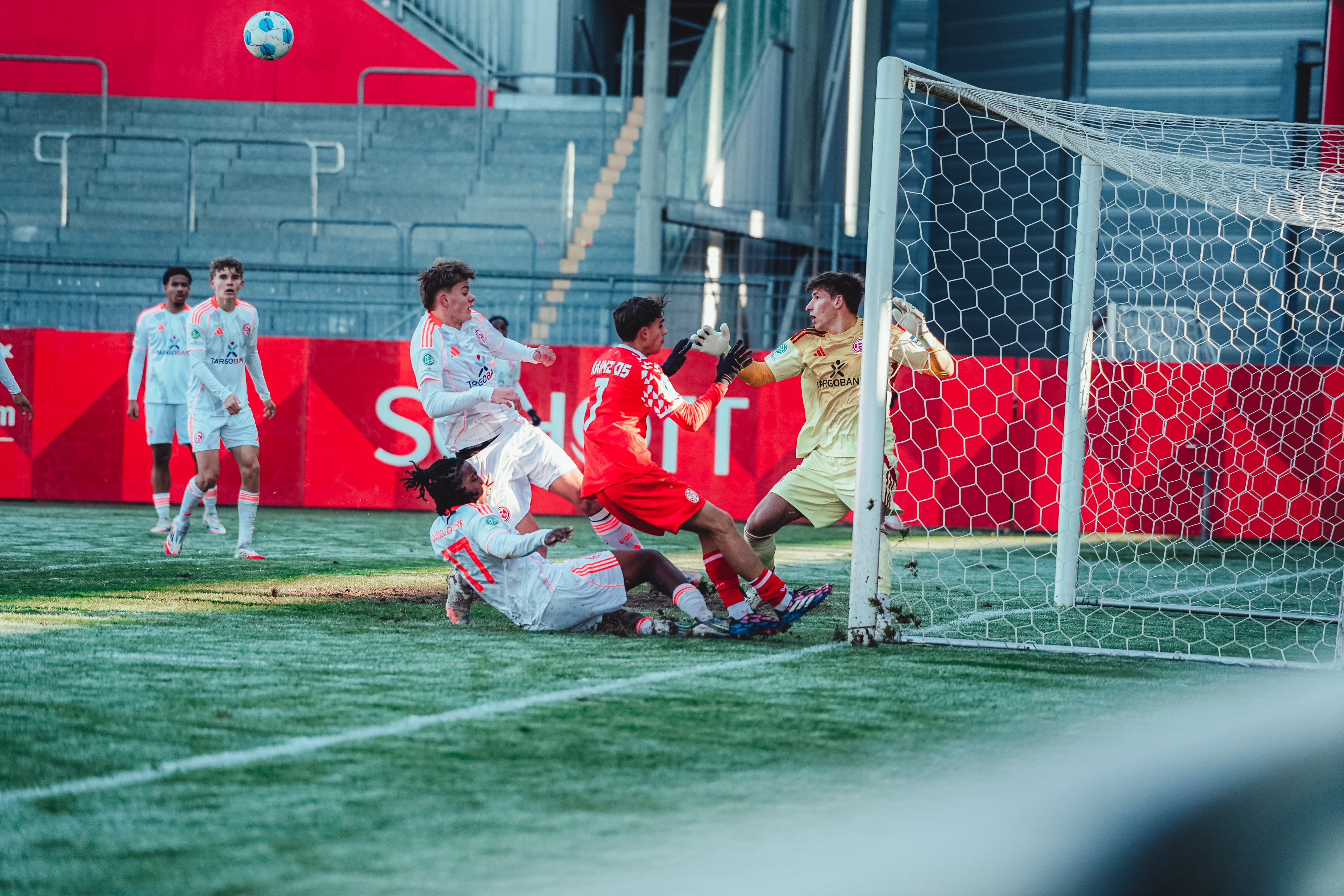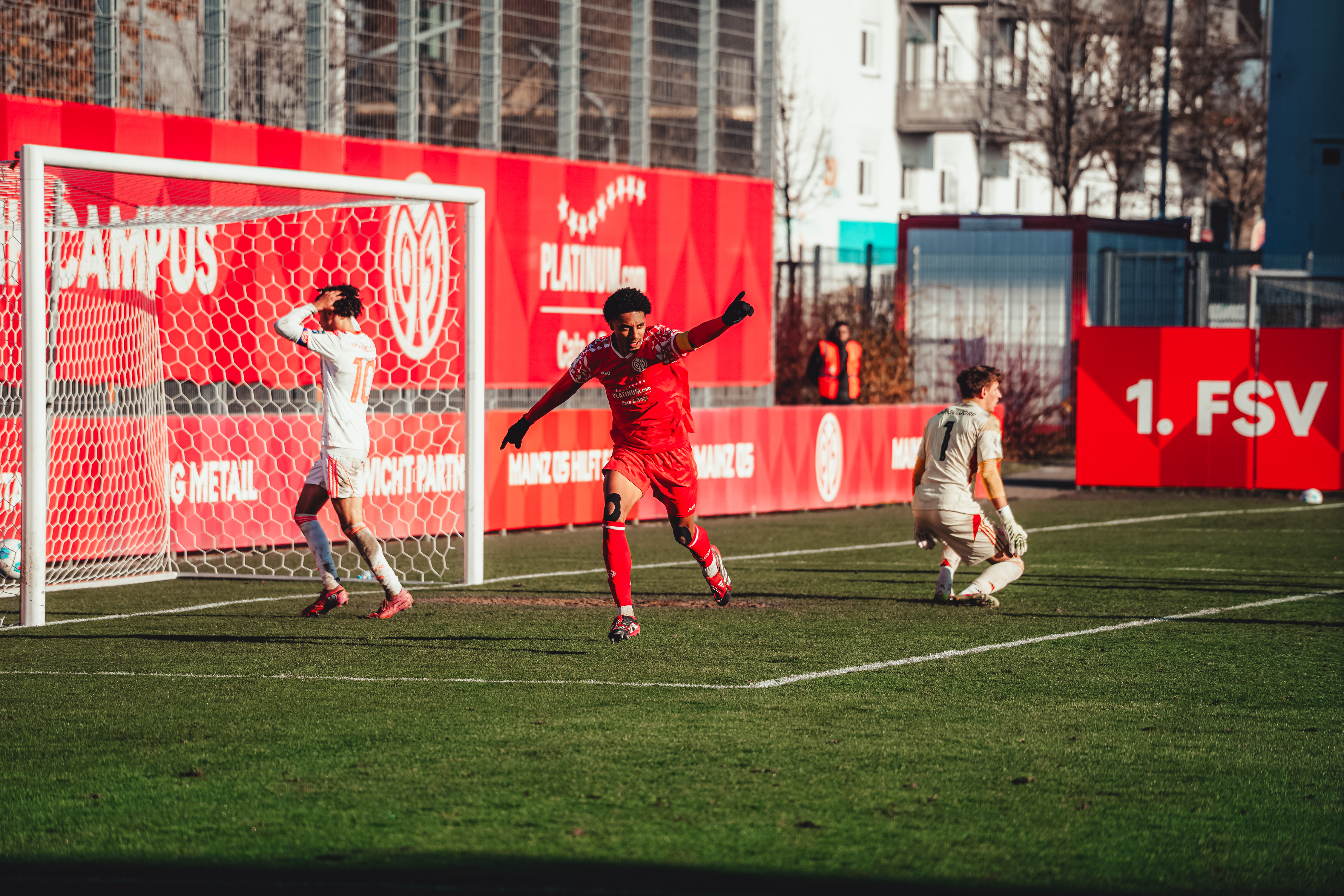 Spätestens ab der 80. Minute war aber ein Aufbäumen deutlich spürbar. Der eingewechselte Batu Deliboyraz verpasste die erste Gelegenheit. Zwar bauten die 05ER nun nochmal Druck auf, hatten aber Glück, dass die Düsseldorfer ihre Chancen zur Vorentscheidung nicht nutzen konnten. Der Pfosten und 05-Torhüter Daris Agovic retteten in der Nachspielzeit. Es wurde hektisch und noch intensiver. Der FSV stellte den großgewachsenen Innenverteidiger Imafidon in den Sturm und packte die Brechstange aus. Viele Flanke und lange Bälle flogen in den Strafraum der Gäste. Einer davon erreichte nach Ablauf der achtminütigen Nachspielzeit den Mainzer U19-Kapitän, der vor Ivan Havenko eiskalt blieb und zum umjubelten Ausgleich traf.