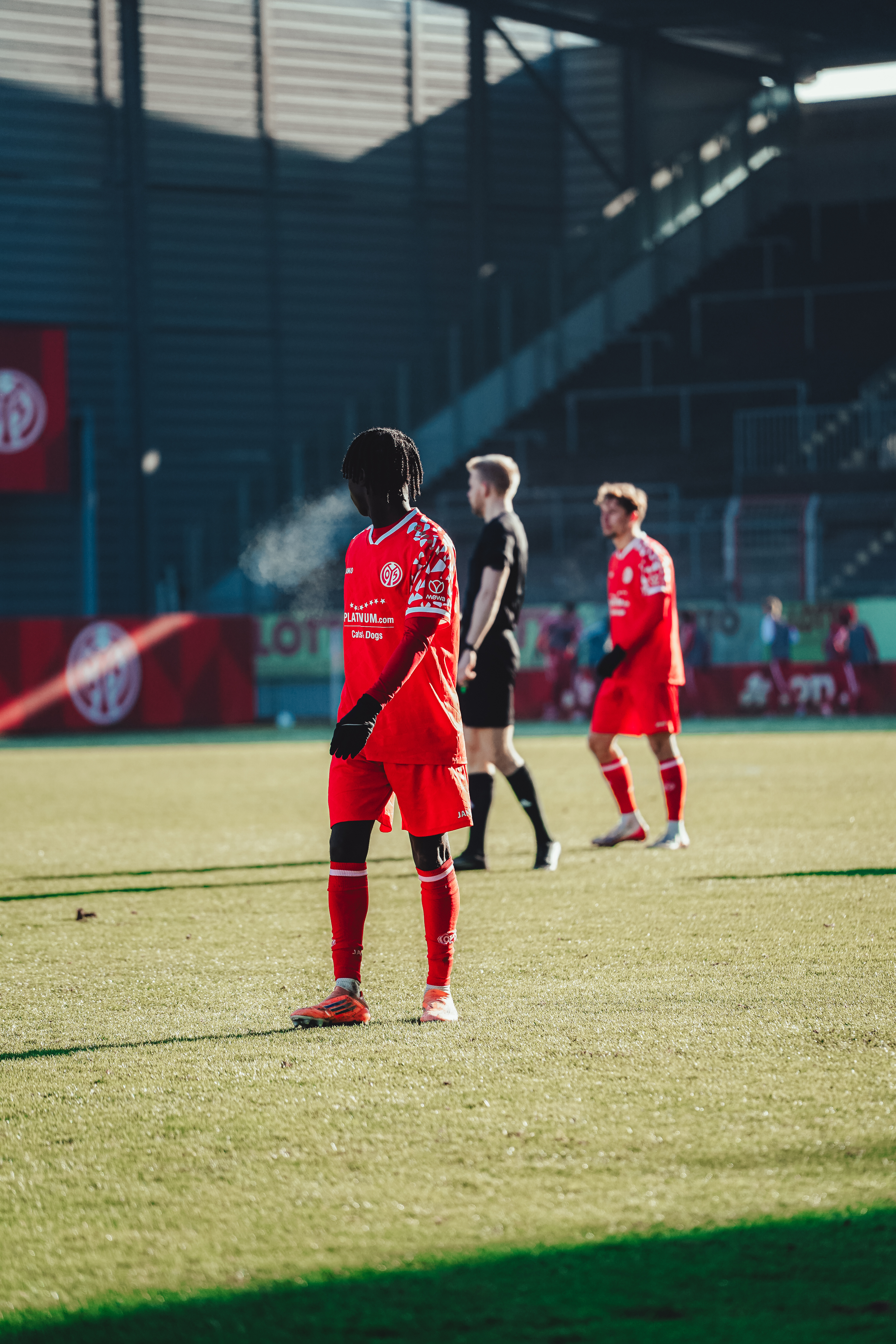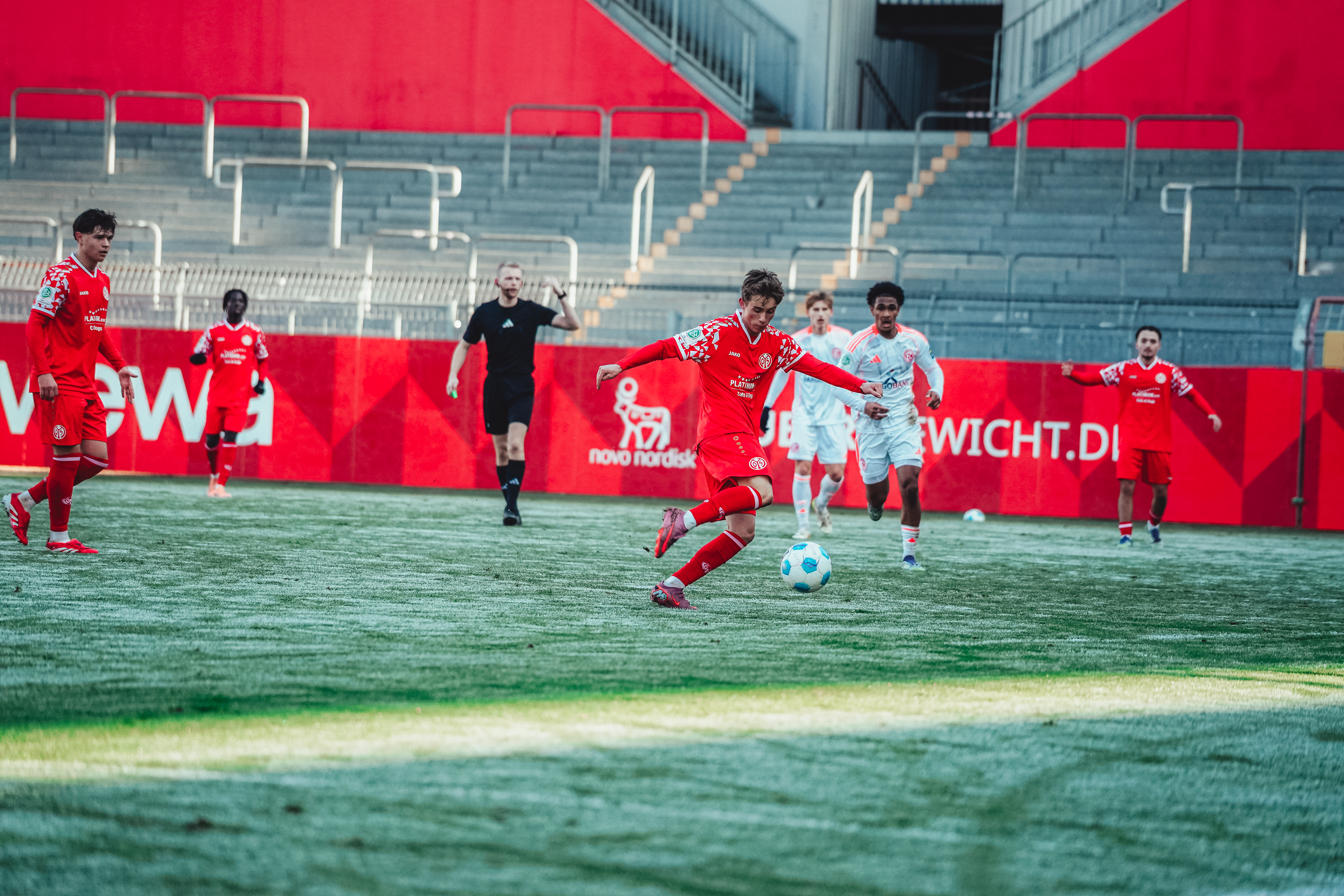 Kirchhoff hatte seine Startelf im Vergleich zum Auswärtssieg in Aachen vor der Länderspielpause auf zwei Positionen verändert. Jan Janega und Fynn Hillbrunner durften für Tyrone Jarrett und Mats Preßler von Beginn an ran. Bei Sonnenschein aber eisigen Temperaturen brauchten die 05ER eine Viertelstunde, um richtig warm zu werden. Bis zur Pause kontrollierten die Gastgeber danach Ball und Gegner. Schon bei den ersten Chancen von Mika Preßler (18./22.) war der FSV nah dran, Tavares nahm sich dann nach einer halben Stunde aus rund 18 Metern ein Herz und zielte genau neben den linken Pfosten (29.). Das verdiente 1:0 beflügelte die Mainzer U19, die bei einer Doppelchance das mögliche zweite Tor vor der Pause verpasste (34.). Mit dem knappen, aber ebenso verdienten 1:0 ging es in die Pause.