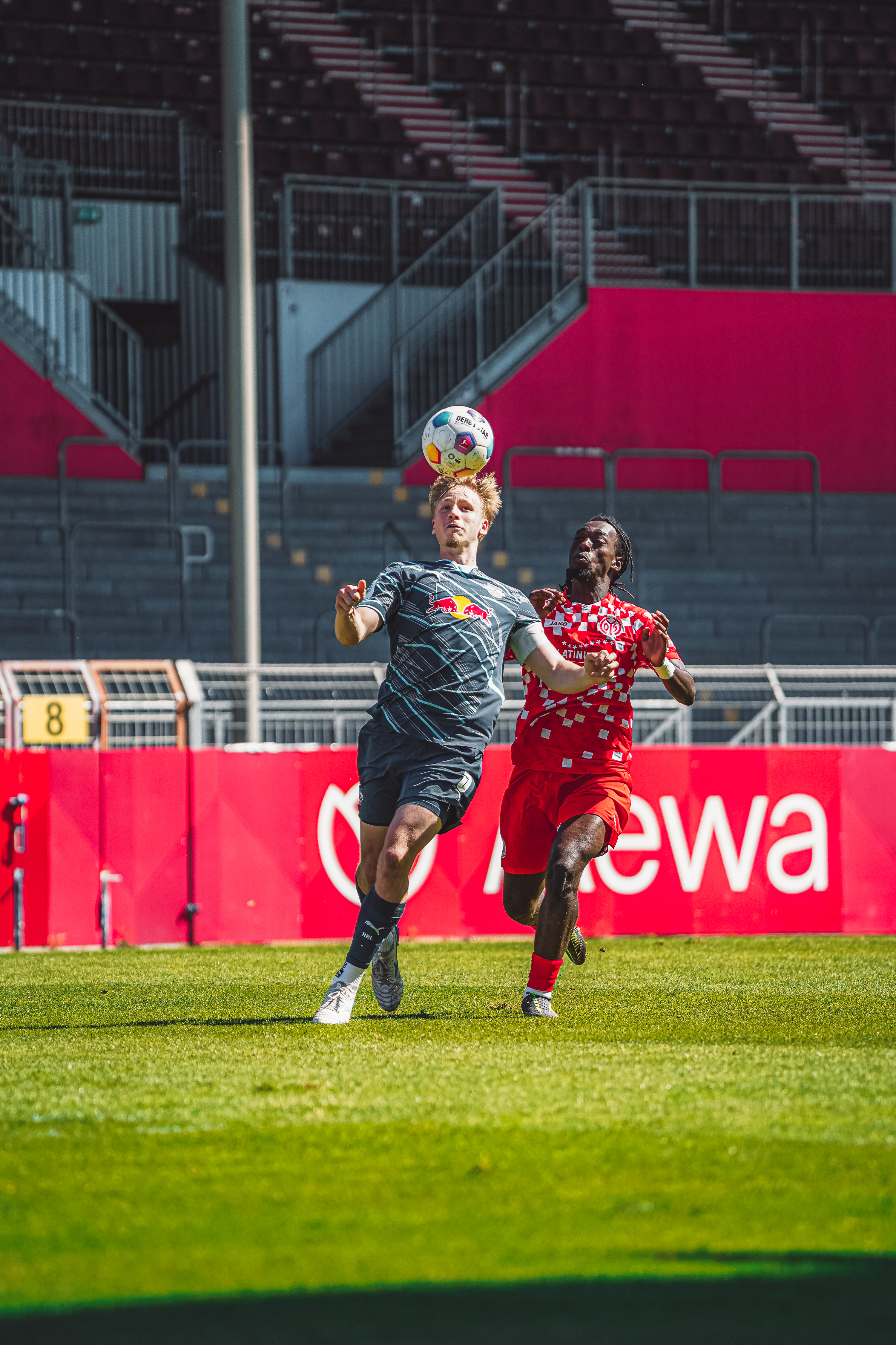 Von Anfang an setzten die Gäste aus Leipzig die 05ER früh unter Druck und hatten in den ersten drei Minuten bereits zwei gute Möglichkeiten. Den ersten Schuss von Robert Ramsak nach dreißig Sekunden wehrte Mehmet Özcelik zur Seite ab, bei Abschluss Nummer zwei verhinderte das lange Bein von Luke Rahmann vorerst den Leipziger Führungstreffer. Dieser fiel jedoch bei der darauffolgenden Ecke, weil der Mainzer Klärungsversuch am Strafraumrand bei Viggo Gebel landete, dessen abgefälschter Schuss im rechten unteren Eck einschlug.