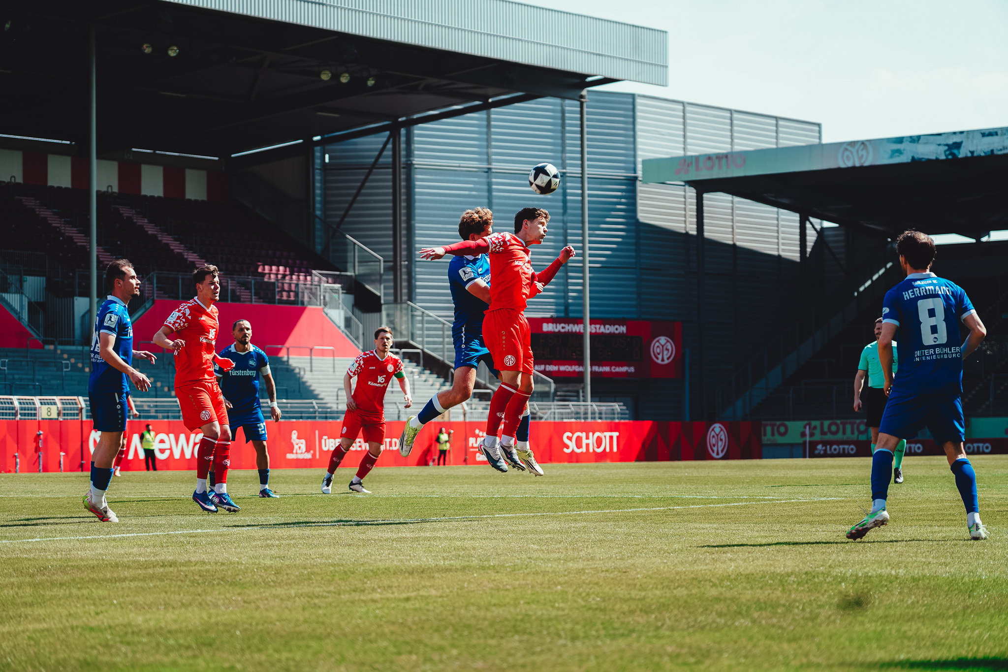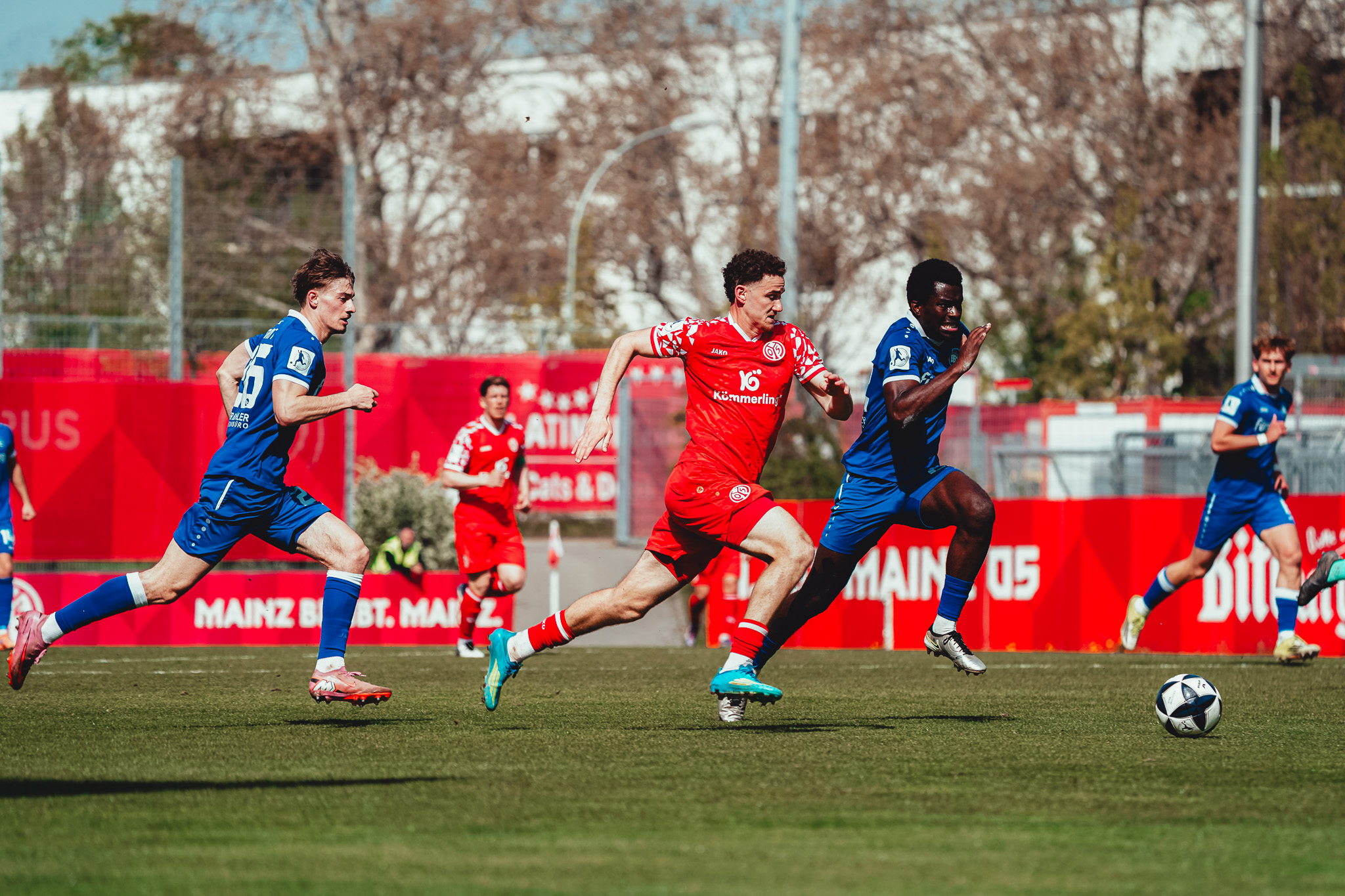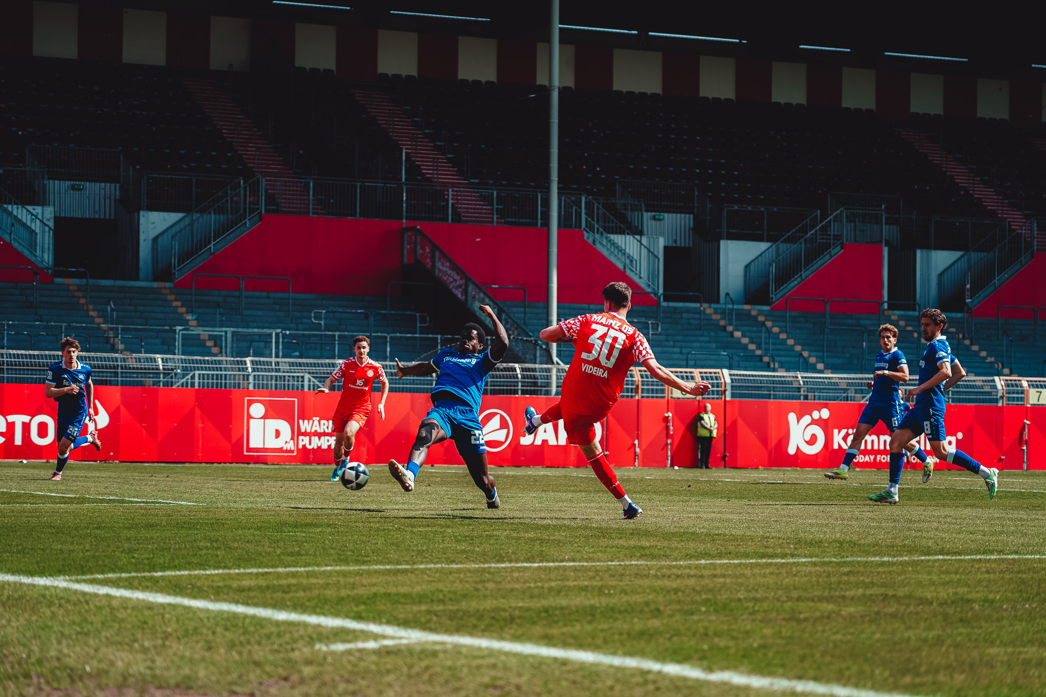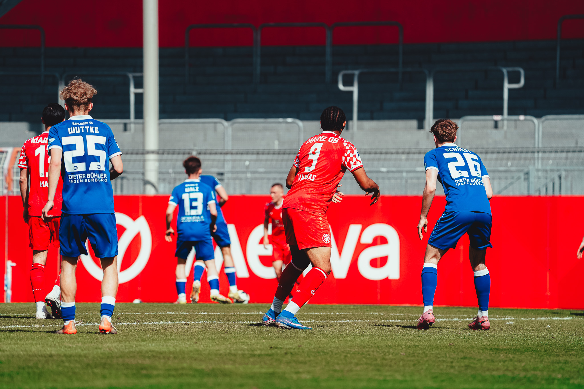 Den Unterschied machte schließlich eine starke Pressingaktion: Videira eroberte den Ball im Aufbauspiel der Bahlinger, setzte sich durch und vollendete im Strafraum ins lange Eck (16.). Auch danach blieb es ein offenes Spiel. Die Mainzer versuchten es immer wieder über lange Bälle auf ihre Zielspieler im Angriff, die zwar oft ankamen, aber selten für Gefahr sorgten. Die Gäste probierten es häufig mit Flanken, vergaben jedoch ihre Chancen mit unpräzisen Kopfbällen. So ging es mit einer 1:0-Führung für die Mainzer in die Kabine.