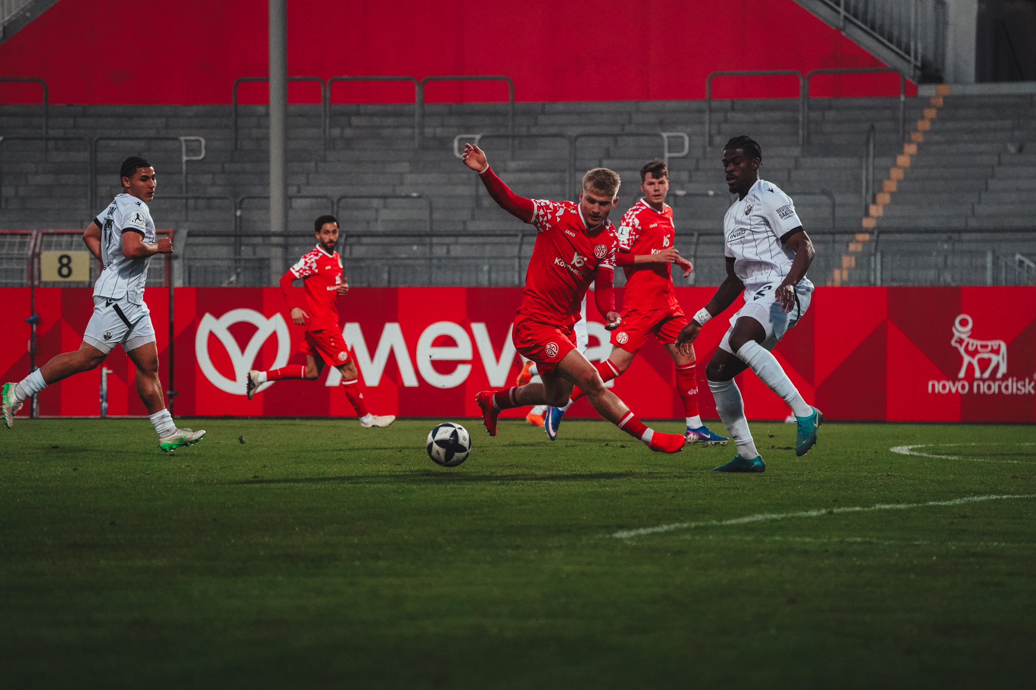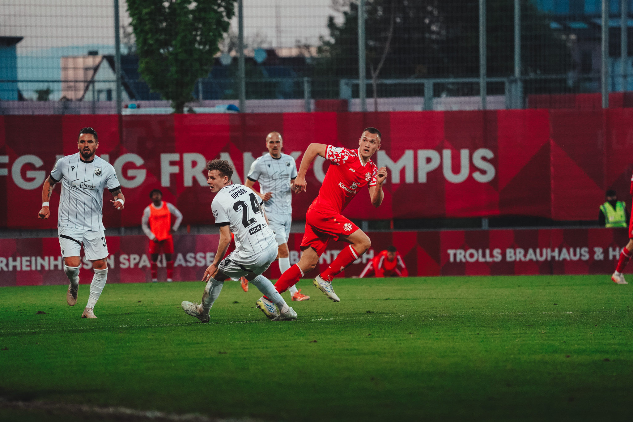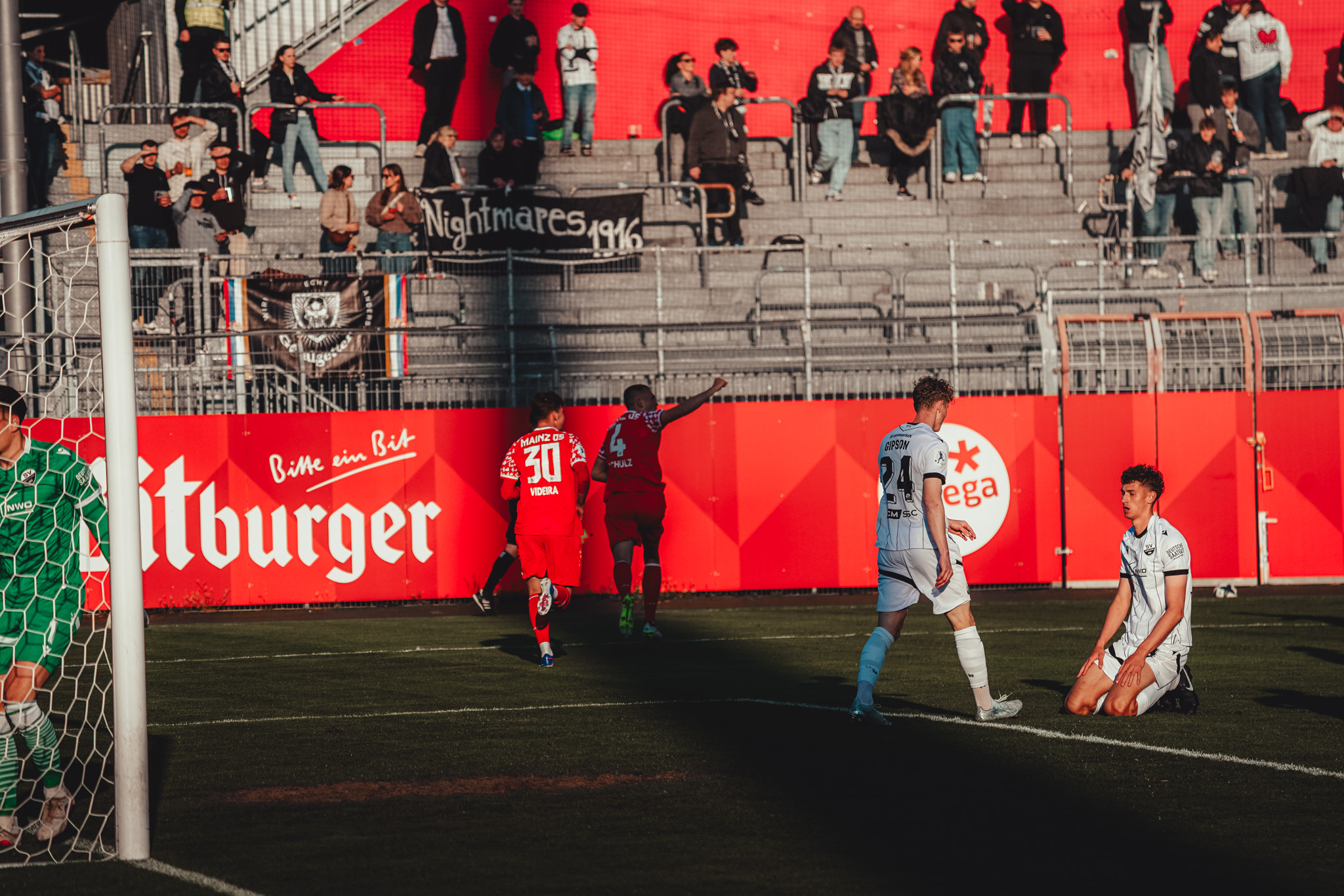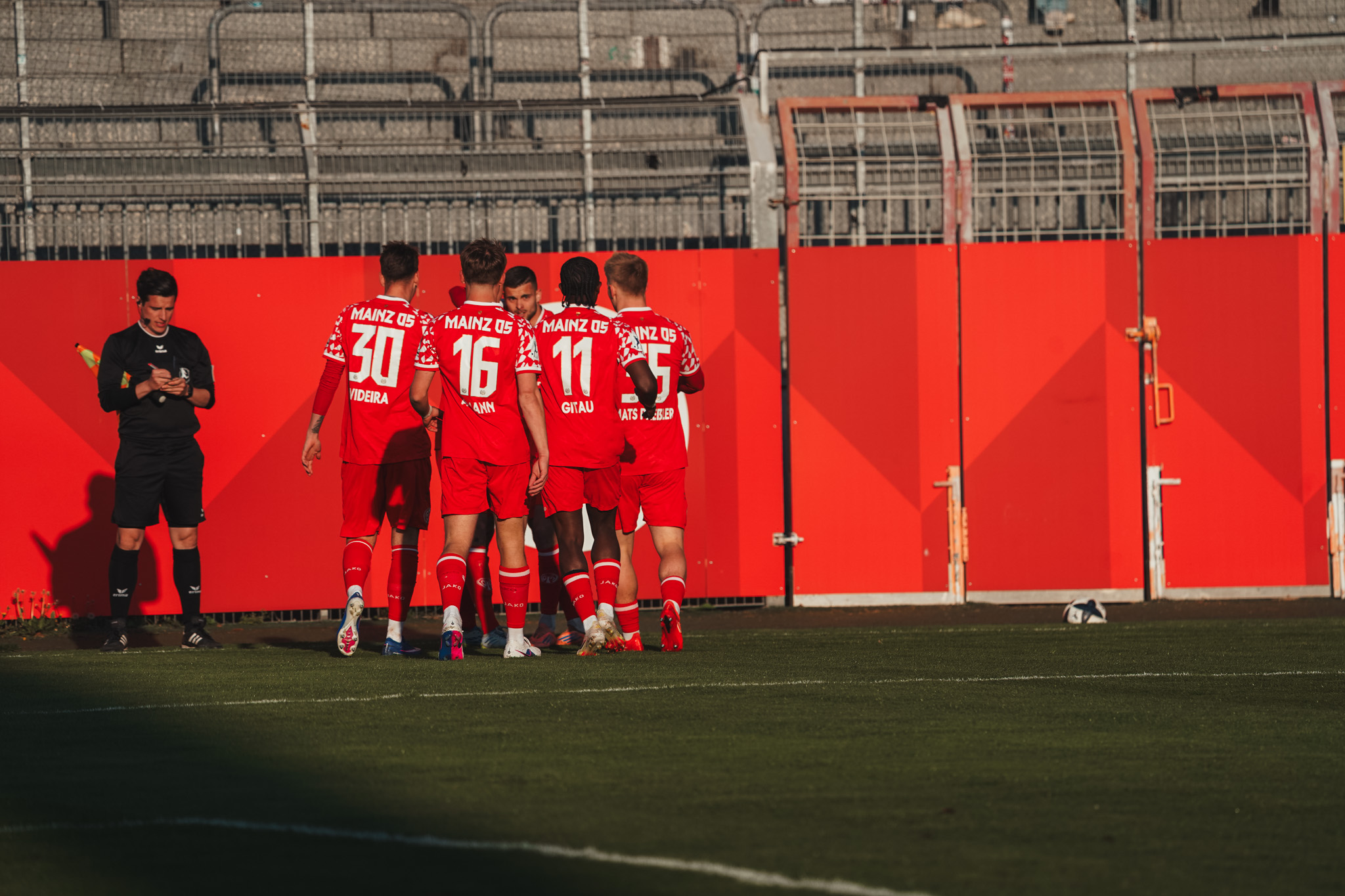 Im Gegenteil, Sandhausens Toptorjäger Testroet kam nach einem Freistoß von Niklas Tarnat von der rechten Seite am Fünfmeterraum unbedrängt zum Kopfball und zu seinem 18. Saisontreffer. Auch diesmal blieb Rieß ohne Abwehrchance, die Gäste hatten die Partie mittlerweile verdientermaßen gedreht (73.). "Der Freistoß war gut geschlagen", kommentierte Hoffmann. Die 05ER fanden im zweiten Durchgang offensiv nicht mehr statt und reagierten mit dem ersten Wechsel. Mika Preßler ersetzte seinen Zwillingsbruder Mats im Angriff für die Schlussphase, die die Gastgeber in Unterzahl bestreiten mussten. Der bereits verwarnte Amann musste nach einem Zweikampf mit Gelb-Rot vom Platz (80.). "Unnötig", befand U23-Chefcoach Hoffmann. "Es war keine Dynamik in der Aktion und Jason hat seinen Gegenspieler nicht mal berührt." Die 05ER bäumten sich mit zehn Mann aber nochmal auf und kamen zu ihrer ersten Gelegenheit in Halbzeit zwei. Lyska war jedoch bei Der Hereingabe von Yunus Malli zur Stelle und wehrte zur Ecke ab, ein Schuss von Dennis Azakir ging drüber (86./87.). Tebo Gabriel und Fritz Engel durften für die letzten Minuten für Gitau und Videira ran. "Die Jungs wollten auch in Unterzahl, haben den Rücken gesucht und versucht, von hinten raus zu kombinieren. Das war auch der Matchplan", so Hoffmann. "Aber wir waren sehr fehlerhaft in eigenem Ballbesitz in der zweiten Hälfte." Das Spiel war kurz darauf nach einem weiteren Ballverlust im Mainzer Aufbauspiel endgültig entschieden. Erneut hieß der Torschütze Mamutovic, der den Ball sehenswert aus rund 20 Metern über Rieß hob und Hoffnungen auf eine Aufholjagd in Unterzahl mit dem Treffer zum 1:3-Endstand zunichte machte. "Der Platzverweis