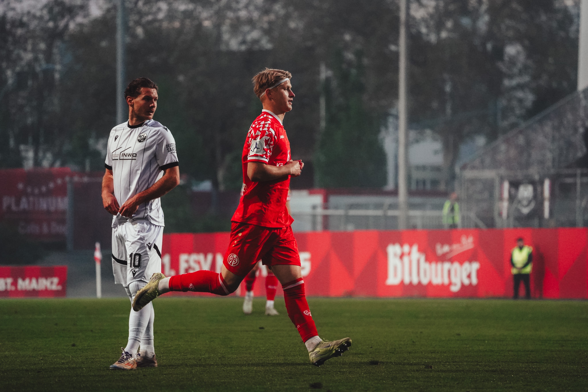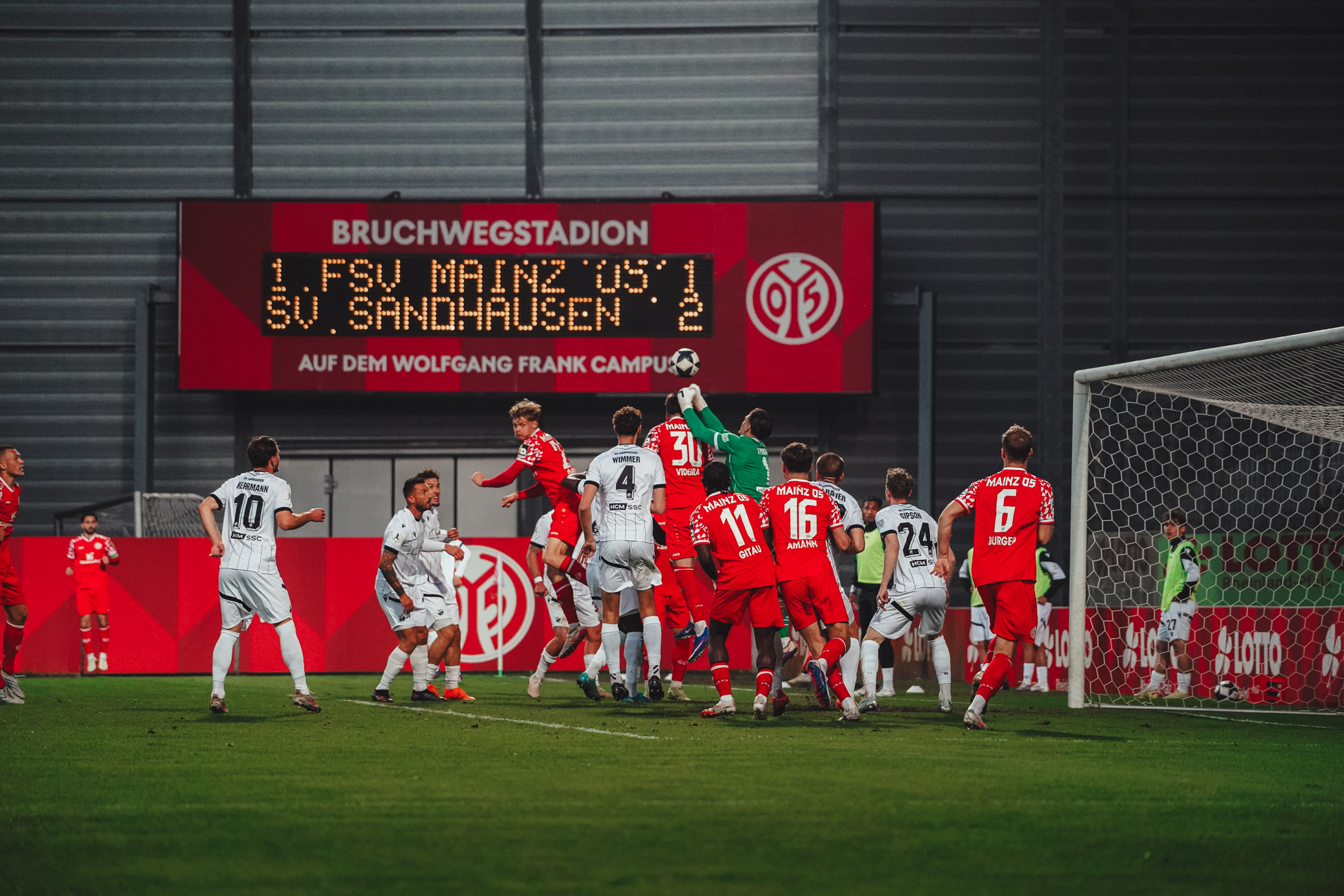 Die Partie startete optimal für die 05ER, nämlich mit dem frühen Führungstreffer durch Schulz. Nach einem Ballverlust eroberte der FSV die Kugel im Gegenpressing umgehend zurück und startete eine Umschaltaktion über Jason Amann. Sein Ball landete bei Mats Preßler, dessen Hereingabe Jayson Videira auf den durchgestarteten Mainzer Abwehrspieler ablegte, der überlegt zum 1:0 einschoss (4.). Die Gäste kamen immer mal wieder in den Strafraum der Rheinhessen, der FSV verteidigte aber spätestens in letzter Linie alles weg und hatte auch offensiv seine Momente, beispielsweise als Mats Preßler dem Sandhäuser Torhüter Arthur Lyska fast den Ball abluchsen konnte (10.).