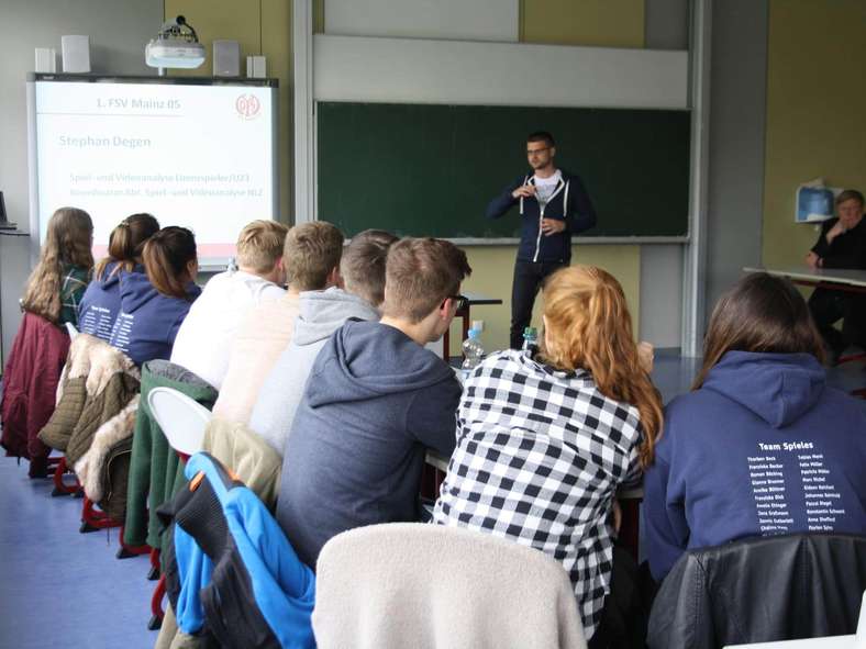 Für diesen Einblick in die praktische Arbeitsweise holten sich die Zwölftklässler 05-Spiel- und Videoanalyst Stephan Degen an die Schule. Bei Mainz 05 ist der Diplom-Sportwissenschaftler seit 2012 in diesem Bereich tätig, sammelt und bearbeitet das Bild- und Datenmaterial der Lizenzspieler, der U23 sowie des Nachwuchsleistungszentrums. Die ausgewerteten und gefilterten „harten Fakten“ liefert er dann an die jeweiligen Trainerteams.