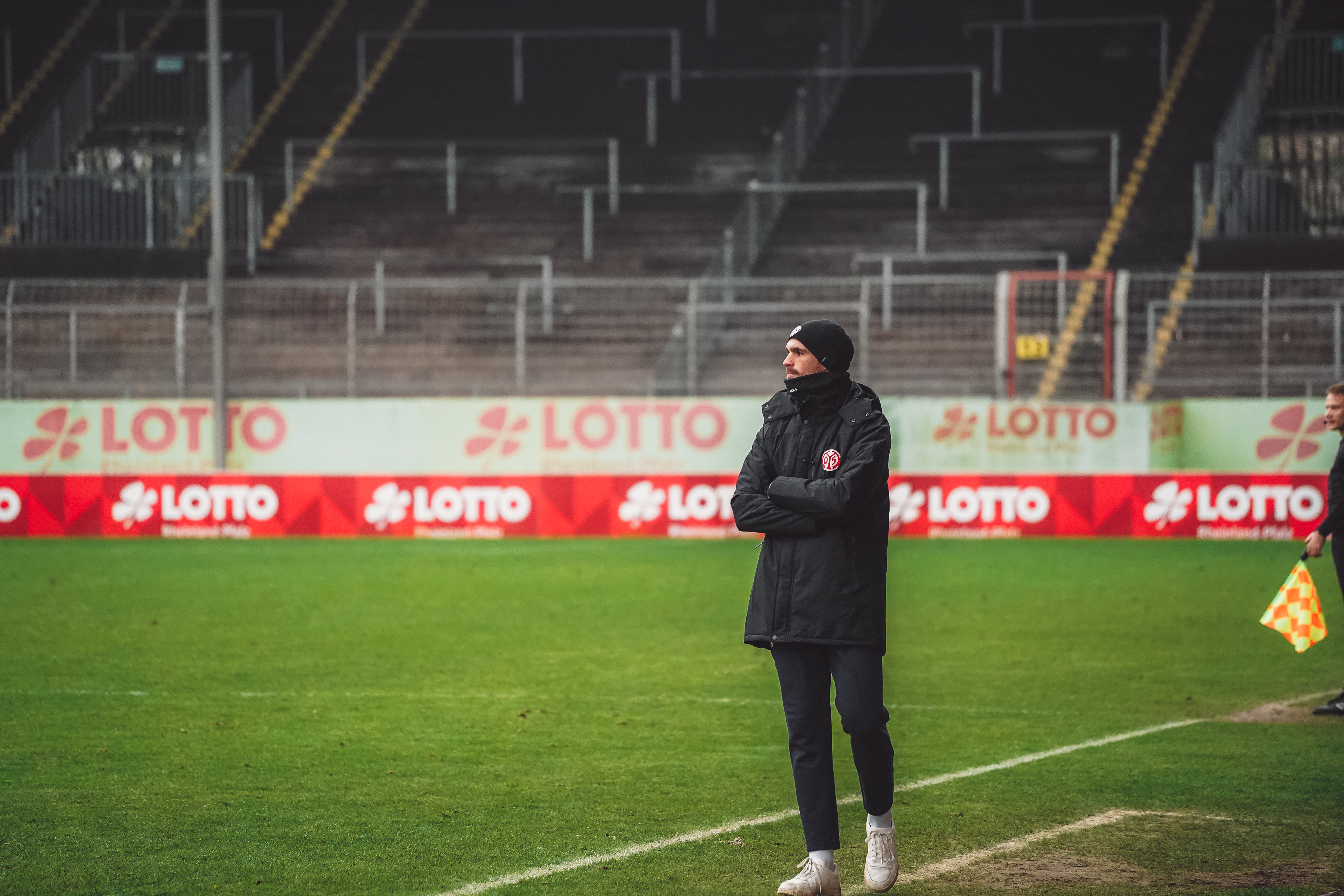 Von den Gästen war mit Ausnahme eines von Kacper Potulski abgeblockten Schusses bis zur 40. Minute nichts zu sehen. Dann wurde es jedoch plötzlich gefährlich im Mainzer Strafraum. Nach einer kurz ausgeführten Freistoßvariante mit anschließender Hereingabe wurde Babatz aus kurzer Distanz geprüft und parierte den Schuss ins Toraus. In der Nachspielzeit hatte der TSV seine zweite Großchance. Eine Halbfeldflanke von der rechten Seite erreichte Karim Benali, der die Kugel zwei Meter vor der Torlinie allerdings nicht richtig traf, weshalb Babatz noch eingreifen konnte.