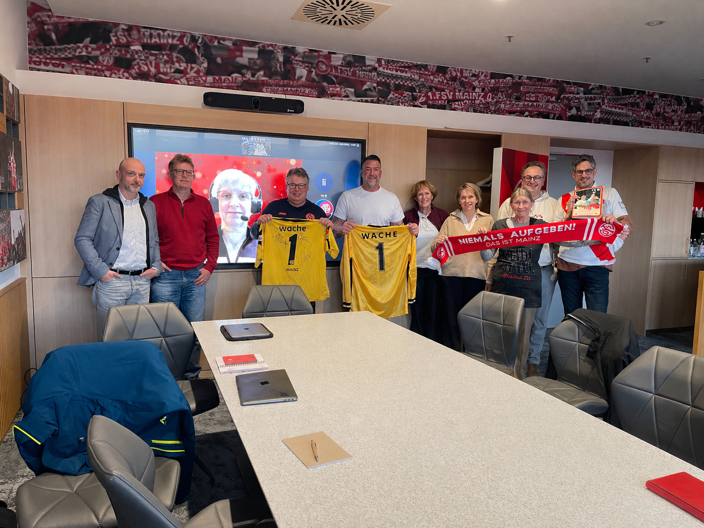 Am Mittwoch, den 01. April 2026, lud die AG "Identifikation“ der Fanabteilung die 05ER Torwartlegende und den neuen Vereinsbotschafter Dimo Wache zu ihrer Sitzung ein. Als Leitfaden für den Austausch diente unser Leitbild "Der Mainzer Weg“, das in den Jahren 2017 bis 2021 unter der Federführung der Fanabteilung entstanden ist. Dimo erinnern viele Inhalte daraus an seine Zeit als Spieler beim FSV und er zog Parallelen zu seiner Station beim SV Darmstadt 98, der ebenfalls ein Vereinsleitbild entwickelt hat, während Dimo dort als Torwarttrainer tätig war.