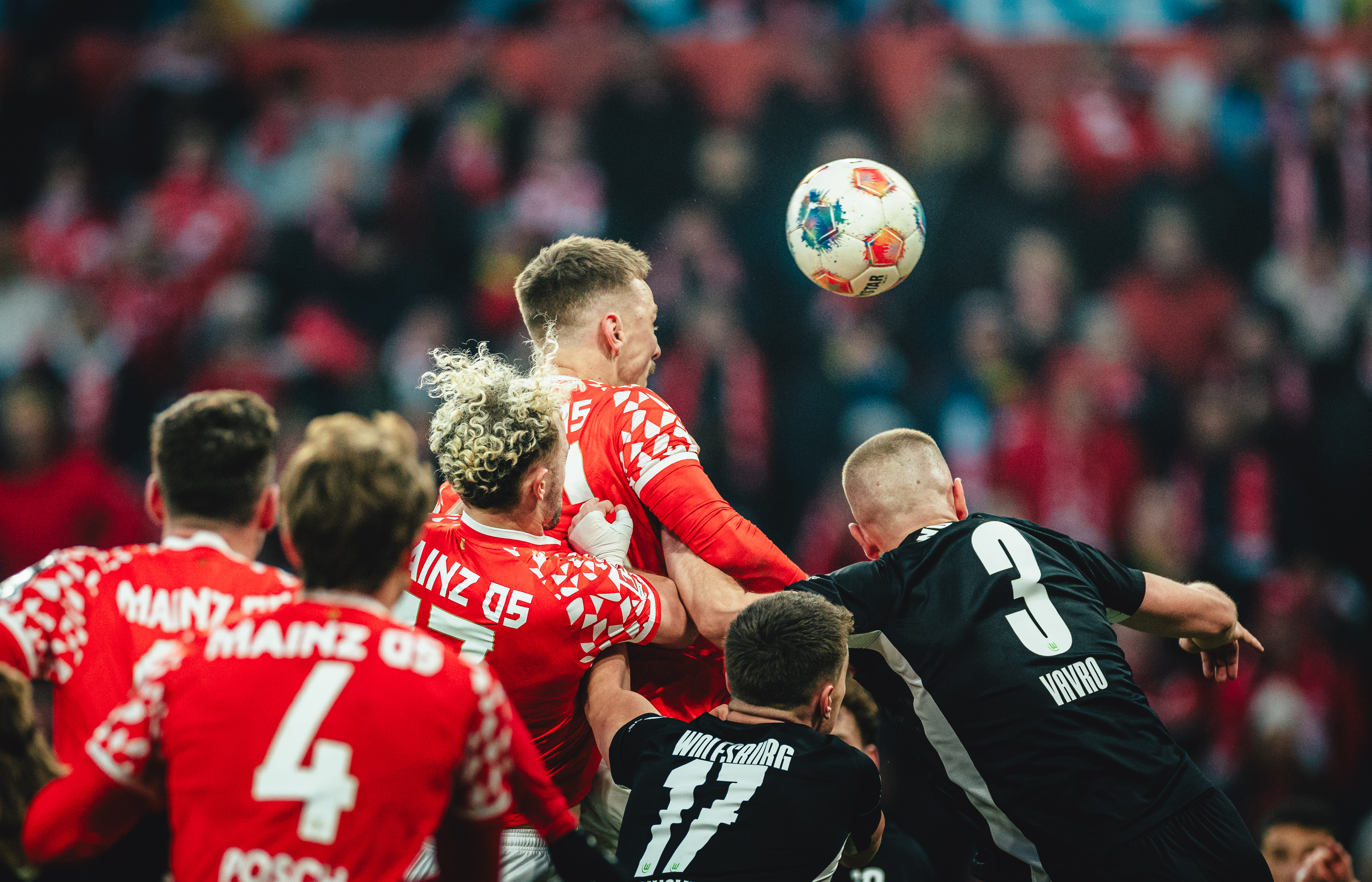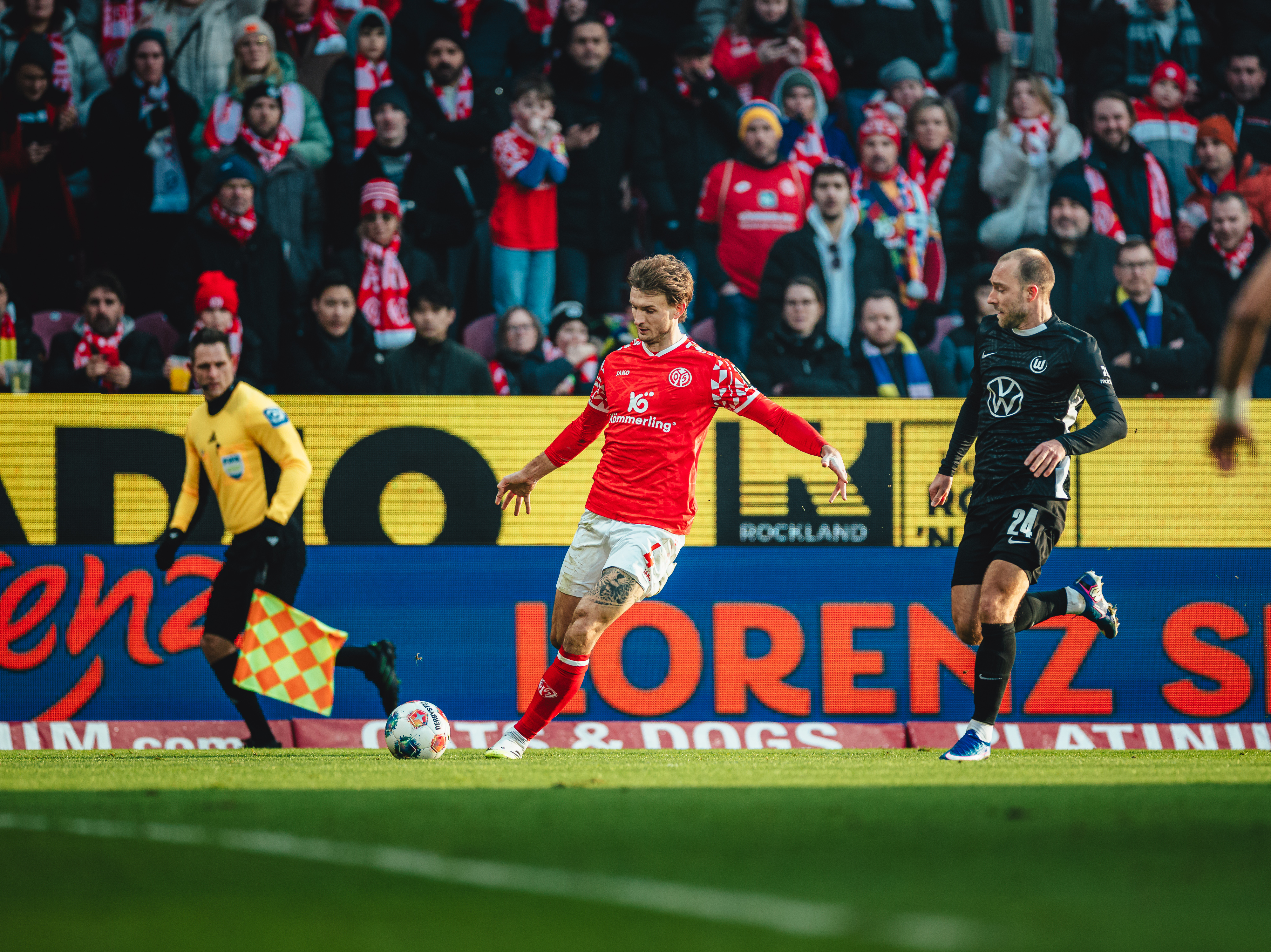 Der FSV war drauf und dran, sich in dieser Partie mindestens den Ausgleich zu verdienen. Nach knapp einer halben Stunde sorgte eine Flanke da Costas von rechts für Gefahr. Im Zentrum machten Tietz und Bell das Leder für Hollerbach scharf, der aus fünf Metern völlig freistehend am VfL-Spieler des ersten Durchgangs, Grabara, scheiterte (30.). Vom Glück verfolgt war der FSV in dieser Phase wahrlich nicht. Zunächst landete Tietz Versuch aus 20 Metern abgefälscht einen Meter neben dem Tor (36.). Und nur zwei Minuten später tauchte der Angreifer erneut in aussichtsreicher Position auf, als er in eine Freistoß-Hereingabe Paul Nebels grätschte, aber ein weiteres Mal im Wolfsburger Keeper seinen Meister fand (38.). Der FSV tat hier längst eindeutig mehr fürs Offensivspiel als die abwartenden Gäste. In Minute 40 flankte Widmer, allerdings wenig druckvoll, so dass Hollerbach das Leder per Kopf nicht aufs Tor brachte. Spätestens in der vierten Minuten der Nachspielzeit sorgte der letzte Angriff vor der Pause für sprachlose Mainzer. Da Costa hatte von der Grundline auf Hollerbach zurückgelegt, der zwar Grabara überwand, dem aber Denis Vavro zur Hilfe kam und auf der Linie mit dem Fuß klärte (45.+4). Die Führung der Gäste beim Gang in die Katakomben hätte schmeichelhafter fast nicht ausfallen können.