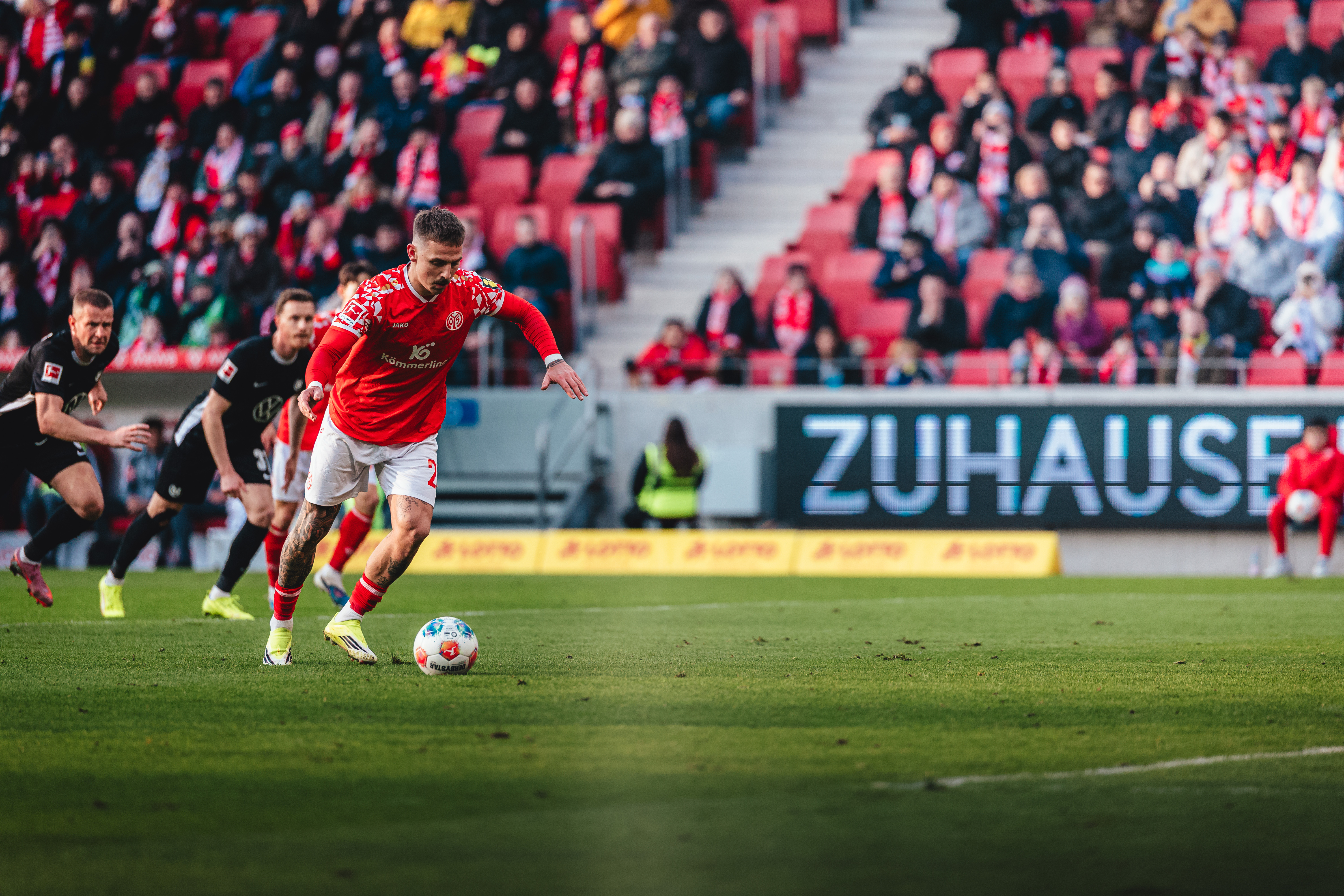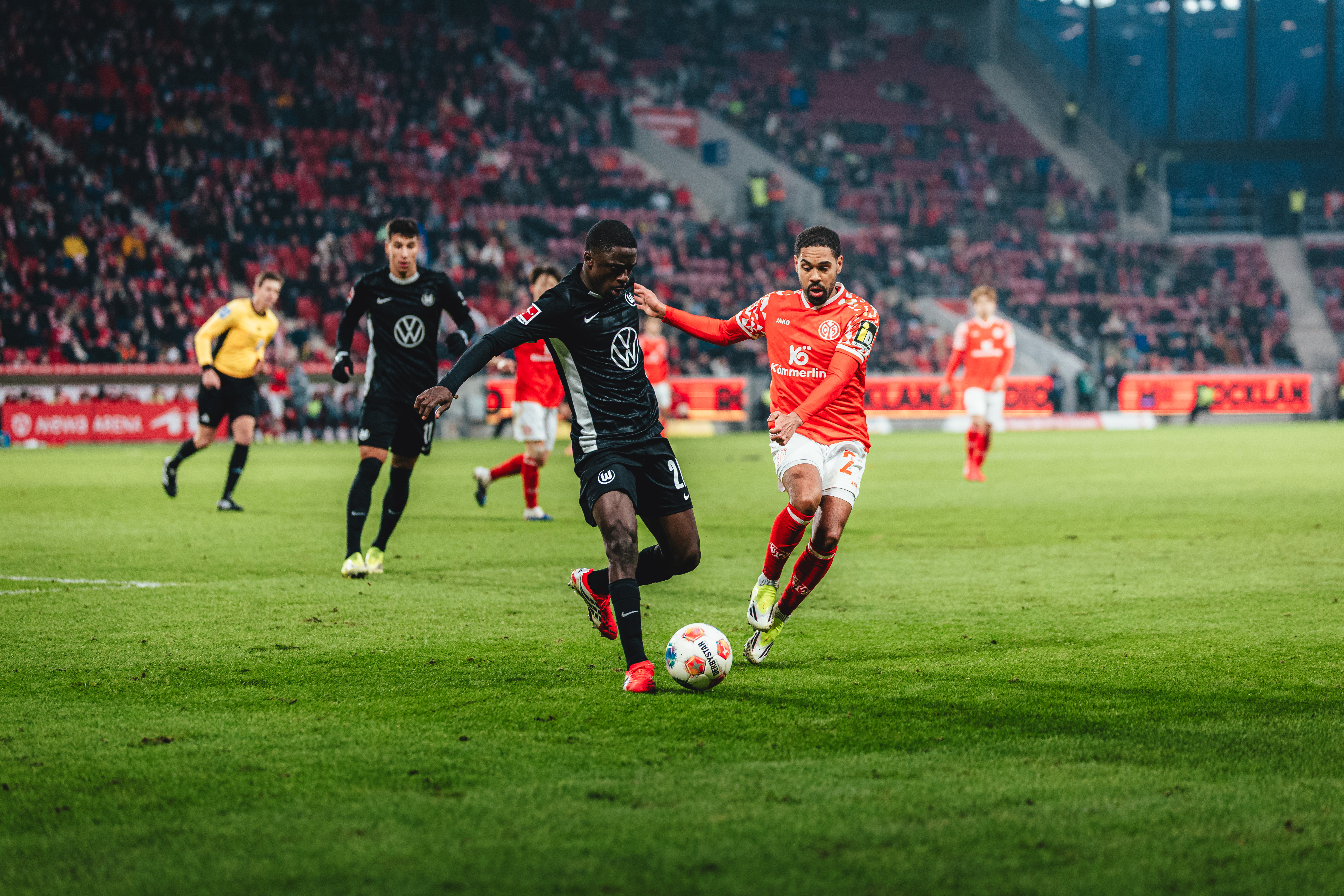 Einen Start zum Vergessen erlebten die 05ER, wie schon in der Vergangenheit so oft, gegen die Wölfe, die in den ersten Minuten fokussierter wirkten. So dauerte es keine 180 Sekunden, bis Daniel Batz hinter sich greifen musste: Sael Kumbedi hatte Silvan Widmer auf dem linken Flügel stehen lassen, flach vors Tor geflankt, wo Amoura nur noch den Fuß hinhalten musste, um das Leder aus kurzer Distanz über die Linie zu drücken - 0:1 aus Mainzer Sicht (3. Spielminute). Ein bitterer Rückschlag, auf den die Rheinhessen schnell die passende Antwort hätten geben müssen. Tietz erlief einen zu kurzen Rückpass von Aaron Zehnter, steuerte allein auf Kamil Grabara zu, konnte diesen aus halbrechter Position und spitzem Winkel aber nicht überwinden (5.). Mit dem Torhüter sollte er es an diesem Nachmittag noch häufiger zu tun bekommen. Denn vom Wolfsburger Druck war anschließend nicht mehr viel zu sehen. Zunächst spielte sich das Geschehen noch weitestgehend im Mittelfeld ab, spätestens ab Minute 20 aber spielte nur noch ein Team. In ebenjener zeigte Daniel Siebert erstmals auf den Punkt, nachdem Vinicius Souza Jae-sung Lee im Strafraum zu Fall gebracht hatte. Neuzugang Tietz übernahm aus elf Metern die Verantwortung, doch Grabara reagierte stark und klärte zur Ecke (22.). Im Anschluss an den Fehlschuss landete ein Kopfball Bells über dem Tor (23.).