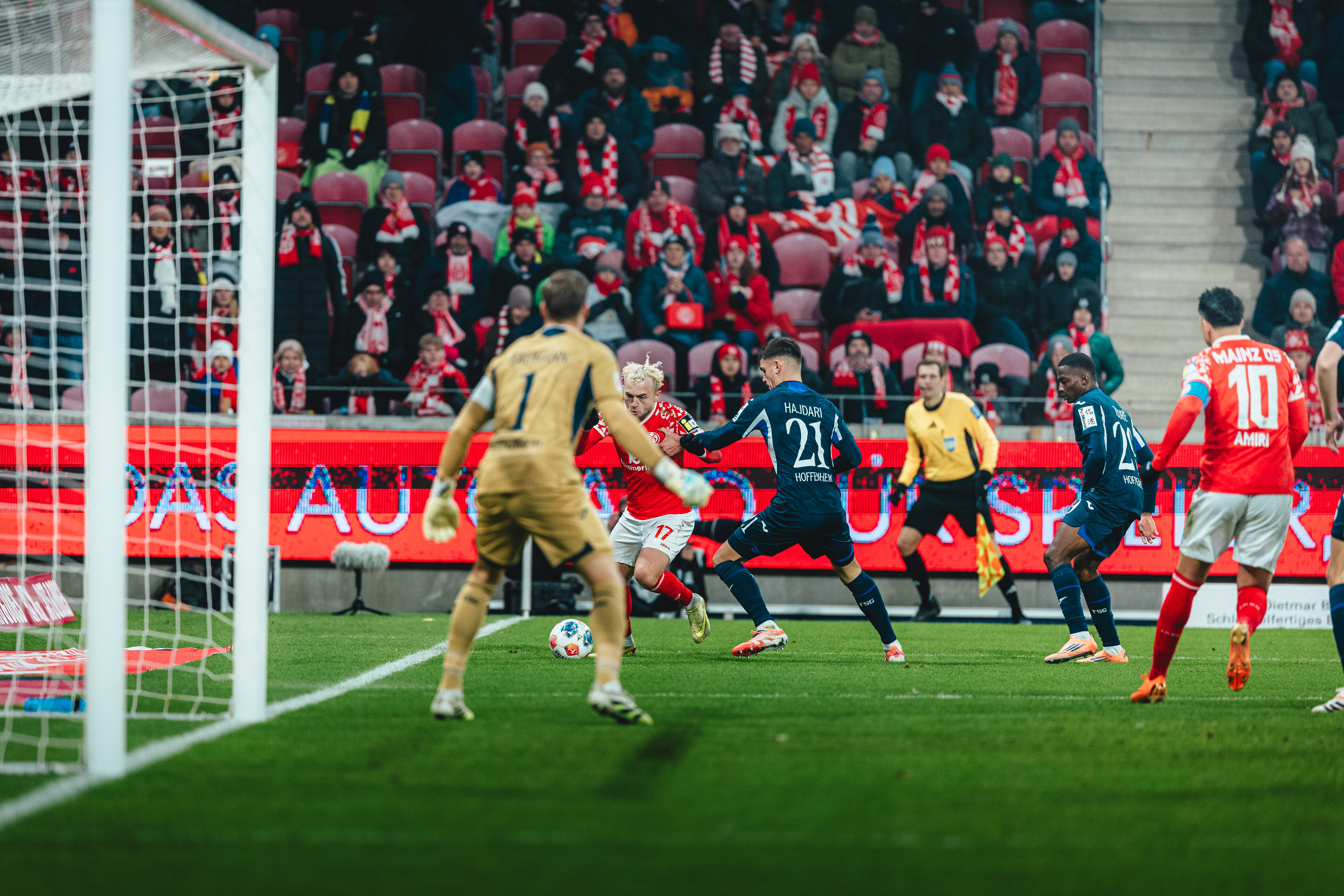 Besser in die Partie fanden die Gäste, die durch ihren Rekordtorschützen Andrej Kramaric zur ersten Chance kamen, der im Anschluss an einen Eckball nur das Außennetz anvisierte (4. Minute). Fünf Minuten später jubelten die Hoffenheimer dann aber bereits: Wouter Burger hatte aus dem Halbfeld eine Alibi-Flanke Richtung Strafraumgrenze geschlagen, die Fisnik Asllani zwar verpasste, Hanche-Olsen dabei jedoch so sehr irritierte, dass der Norweger das Leder aus 16 Metern ins eigene Tor köpfte - 0:1 (9.). Ein Verlauf, der im Matchplan des FSV natürlich nicht vorgesehen war. Dennoch hätte Benedict Hollerbach postwendend zurückschlagen können, setzte seine Direktabnahme nach Rückpass von Jae-sung Lee aber über den Querbalken (11.). Die TSG blieb aber das gefährlichere Team und hätte durch Asllani auf 2:0 stellen können, der nach 15 Minuten an einem Zentner-Reflex scheiterte. Verunsicherte 05ER taten sich schwer hineinzufinden in diese Begegnung, die so unglücklich begonnen hatte. Defensiv stabilisierten sie sich zwar in der Folge, doch es dauerte bis zur 29. Minute, bis es im Strafraum der Kraichgauer mal so richtig brannte. Eine Hollerbach-Flanke erreichte Widmer, der den Ball in Rücklage aber nicht aufs Tor brachte, und als Lee das Leder nochmal scharf machte, stand Amiri knapp im Abseits - Chance verpufft.