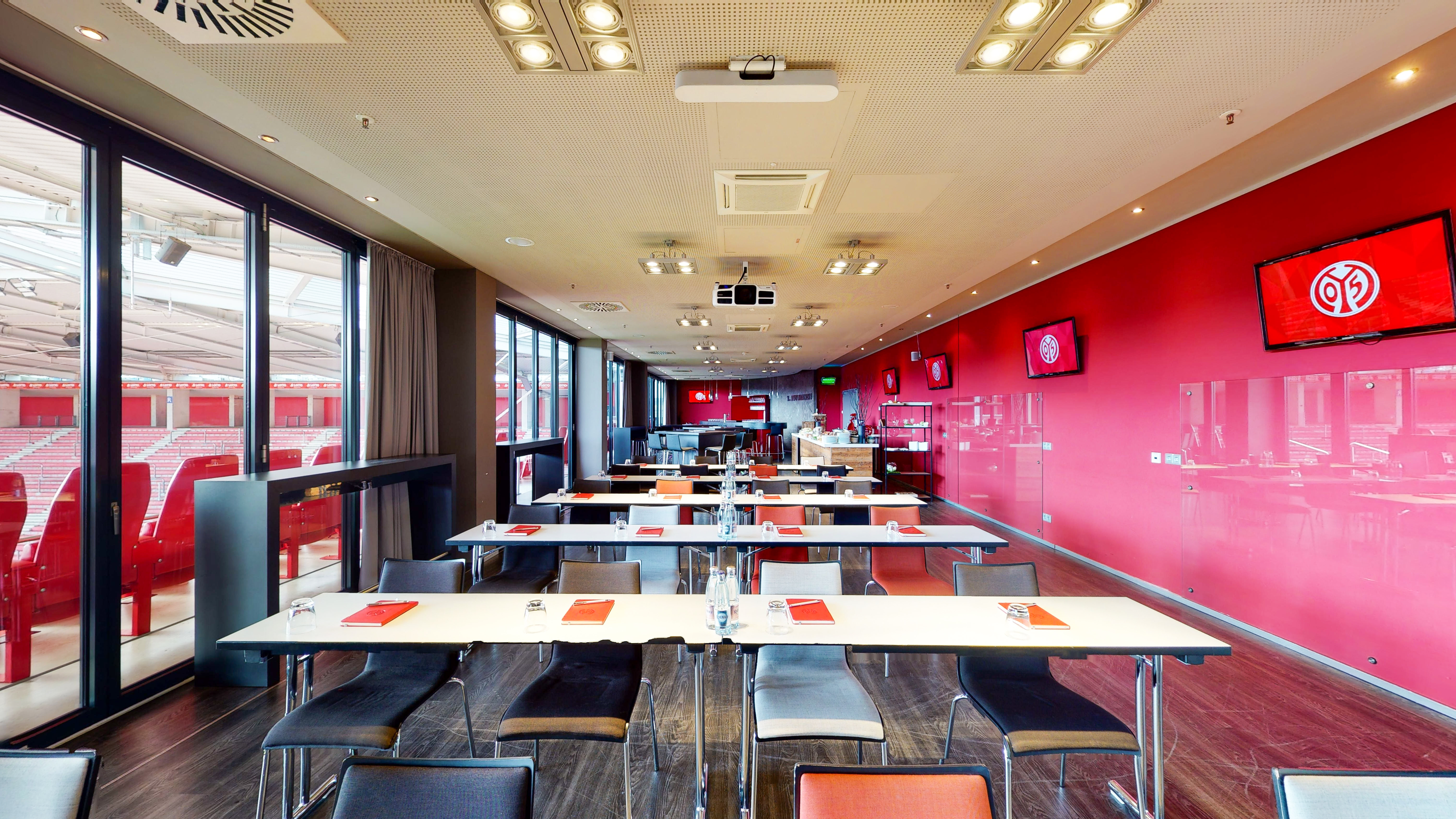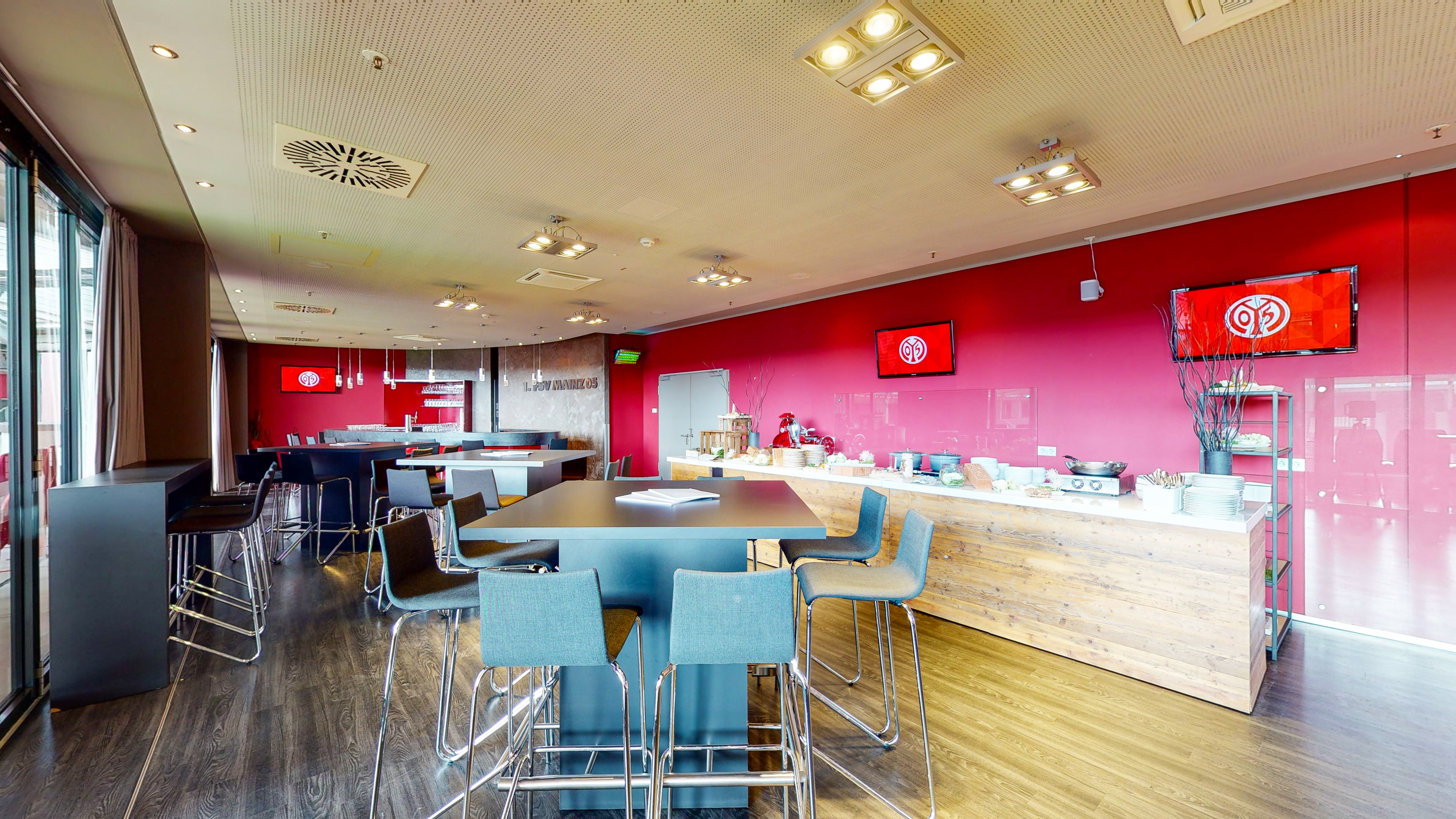 Unsere Eventloge fasst bis zu 120 Personen. Mit einer freistehenden Theke an einem und einem großen Smartboard am anderen Ende eignet sich die Loge als Tagungsraum sowie als Cateringbereich. Zudem ist die Eventloge durch eine mobile Trennwand variabel teilbar und verfügt über eine moderne Beschallungsanlage. Die Räumlichkeiten befinden sich im obersten Stockwerk der Arena und haben direkten Anschluss zum Logenbalkon.