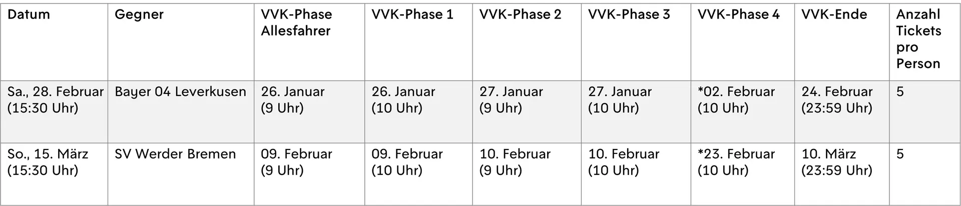 Für unser Auswärtsspiel beim SV Werder Bremen endet der Vorverkauf am 10.03.2026 (23:59 Uhr).