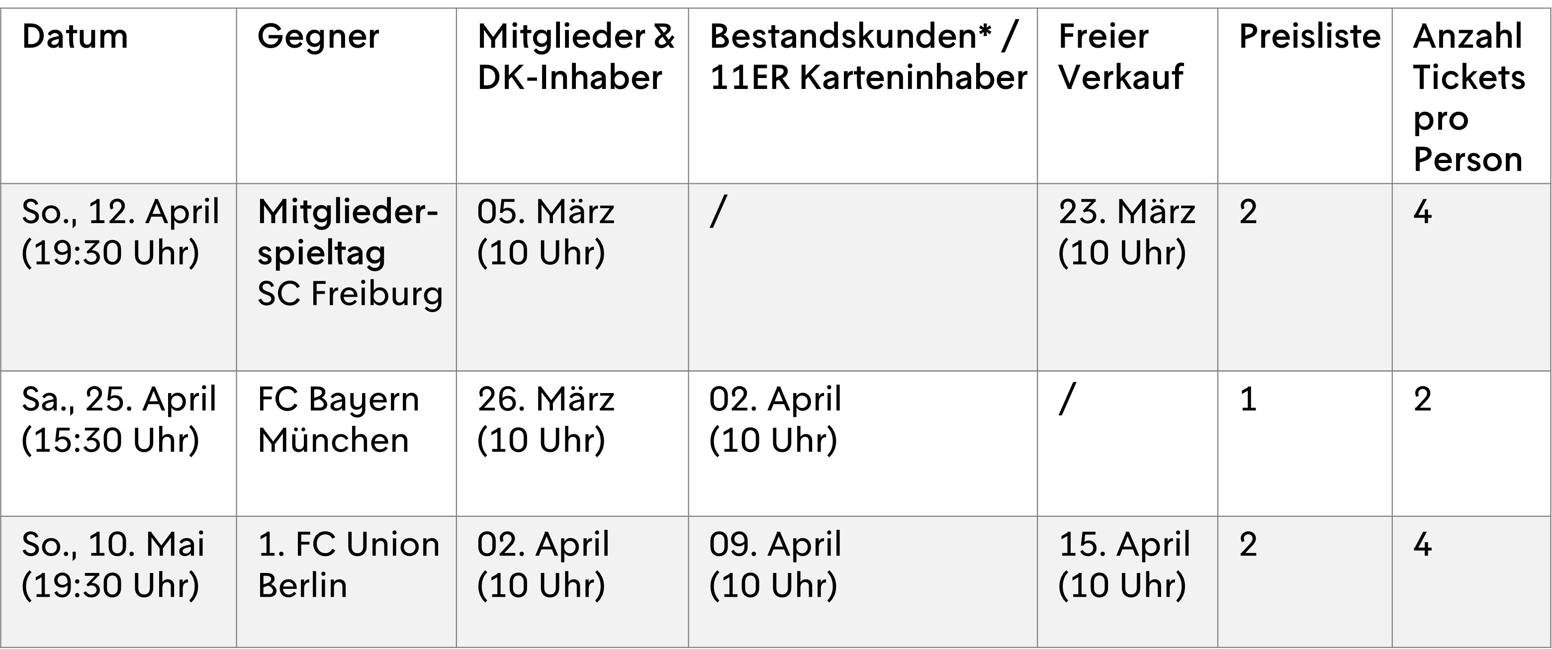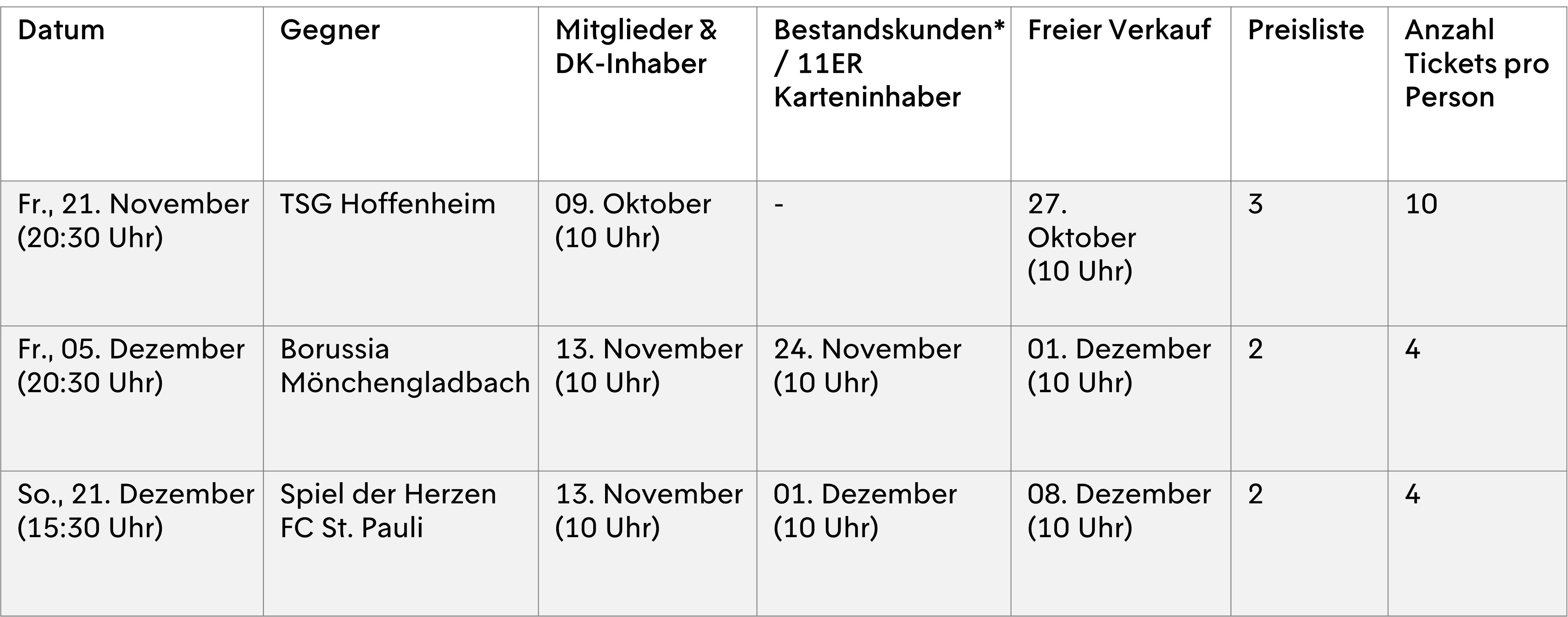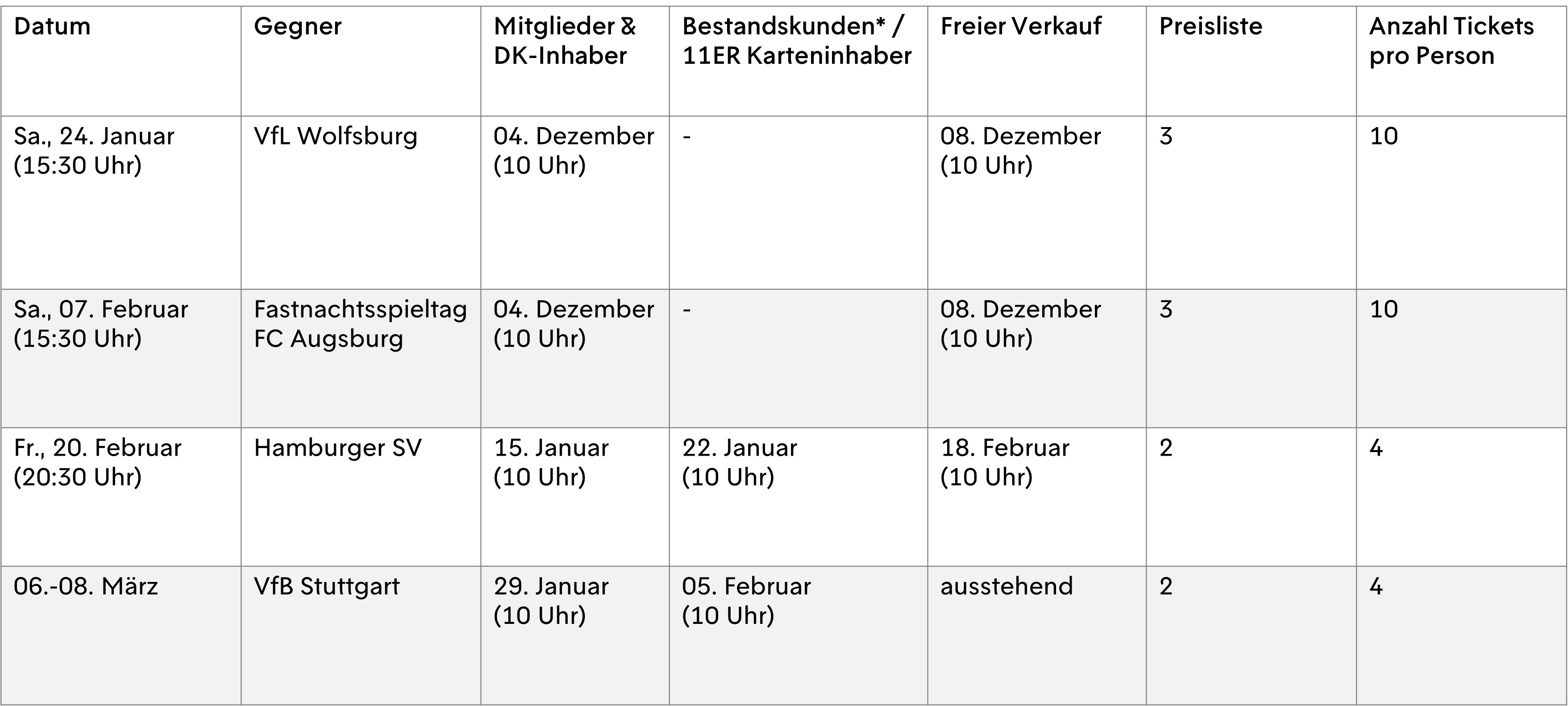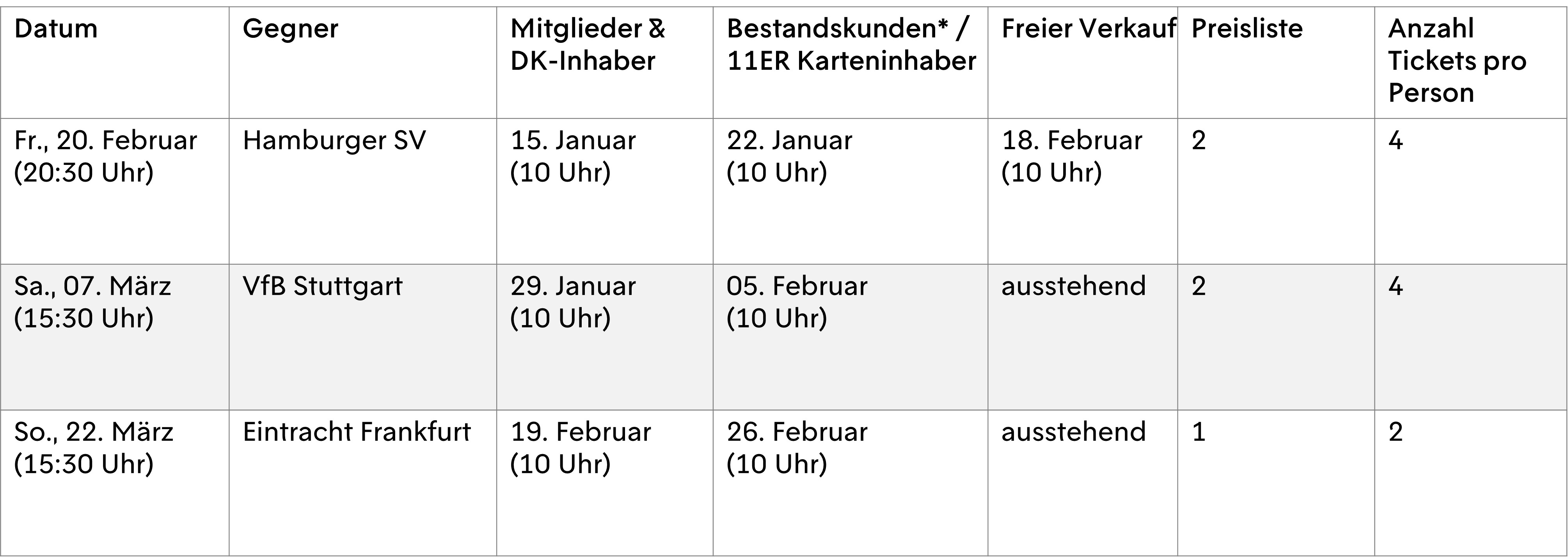 Ab einer Personenanzahl von 11 Personen können zu allen Heimspielen, ausgenommen Bayern München, Borussia Dortmund und Eintracht Frankfurt, Gruppenanfragen eingereicht werden.