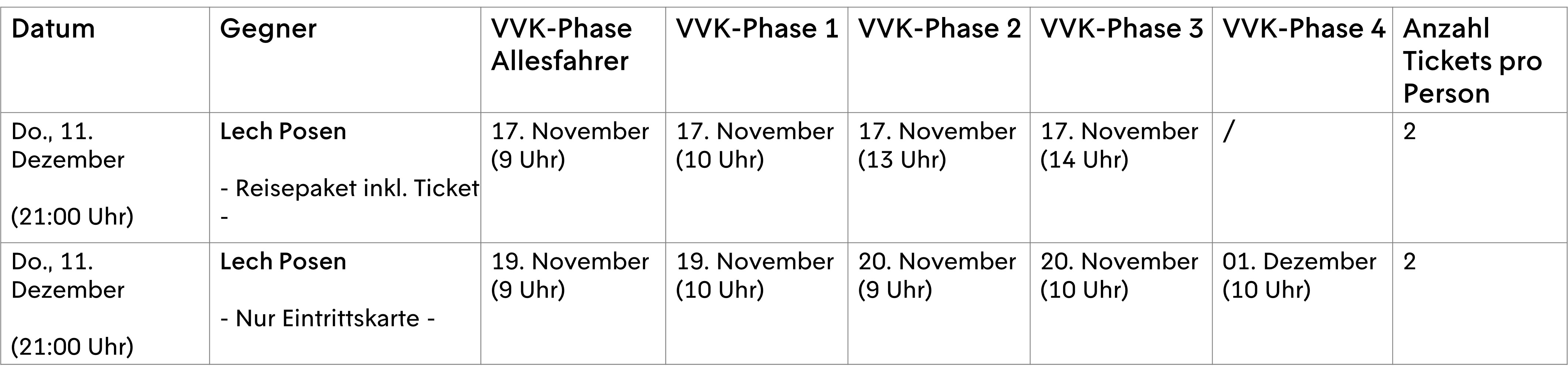 Für die Buchung des Reiseangebots gilt der reguläre Verteilerschlüssel der Saison 2025/2026. Pro Fan dürfen max. 2 Karten gebucht werden. Pro Fanclub max. 15 Tickets – ausgenommen die Fanclubs, die über den regulären Verteilerschlüssel zu mehr Buchungen berechtigt sind. Alle Fanclubs wurden im Vorfeld des Verkaufs nochmals entsprechend darüber informiert.
