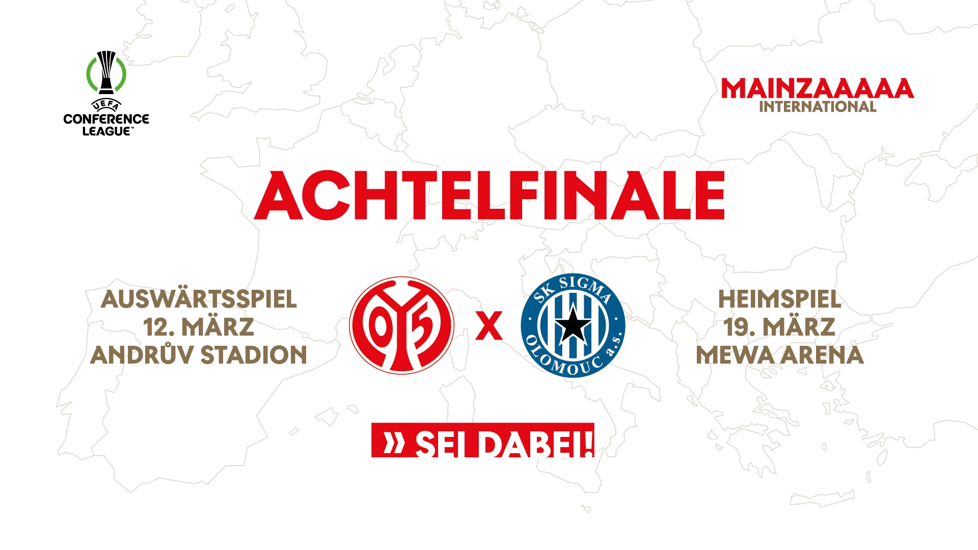 Im UEFA Conference League-Achtelfinale treffen wir auf den tschechischen Erstligisten Sigma Olmütz. Ausgetragen werden die Partien in der Runde der letzten 16 Teilnehmer in Hin- und Rückspiel am 12. März (Anstoß in Olmütz: 21 Uhr) und 19. März (Anstoß in der MEWA ARENA: 18:45 Uhr).
