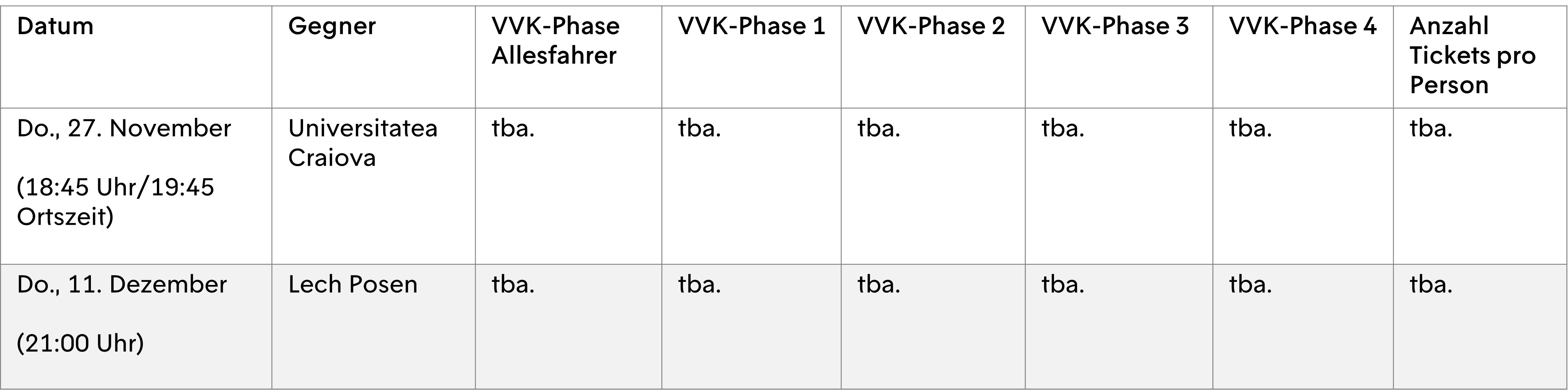 Alle Informationen zur Ticketvergabe für unsere Auswärtsspiele in Craiova (27.11.) und Posen (11.12.) werden in den kommenden Wochen an dieser Stelle veröffentlicht.