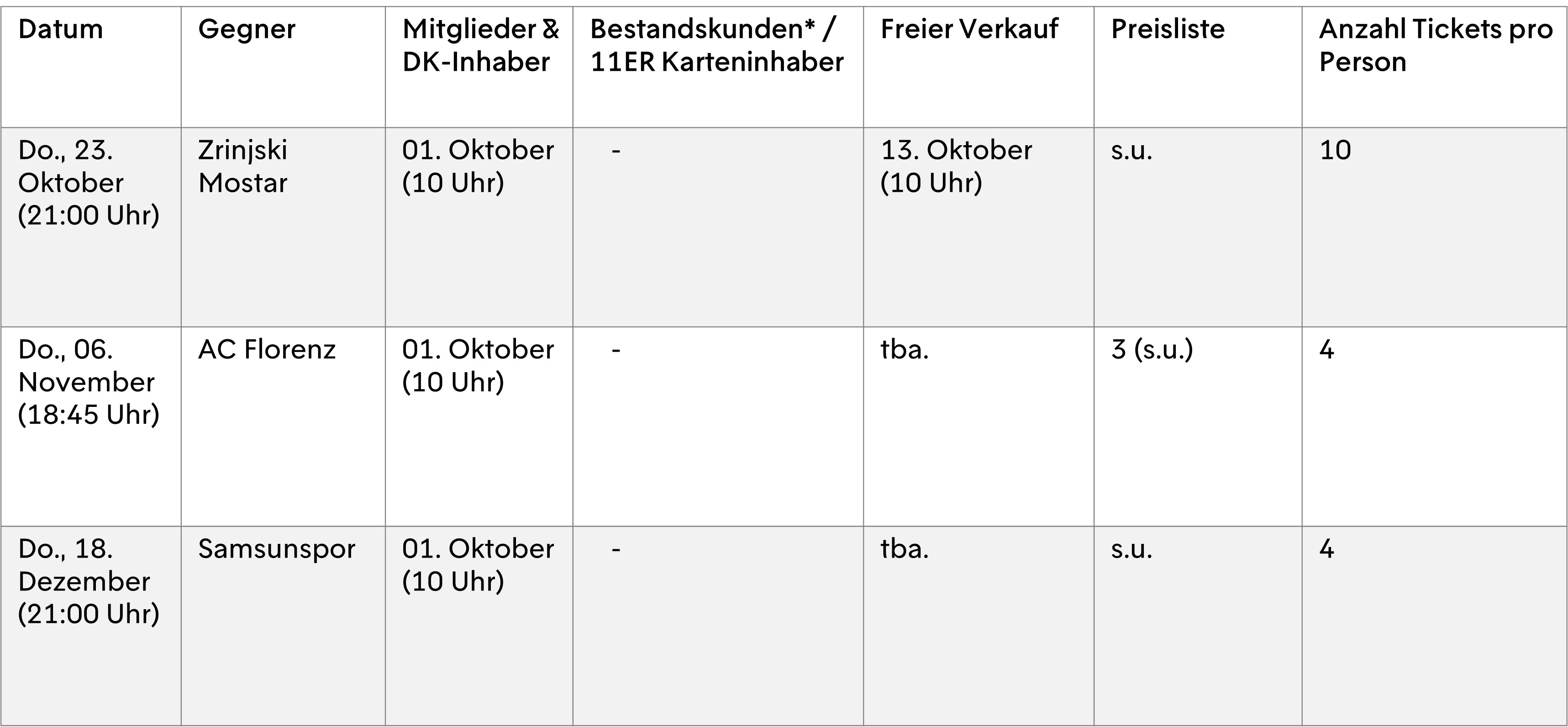 Ab dem 01. Oktober (10 Uhr) können sich Dauerkarteninhaber zusätzliche Tickets für die Heimspiele der Conference League holen.